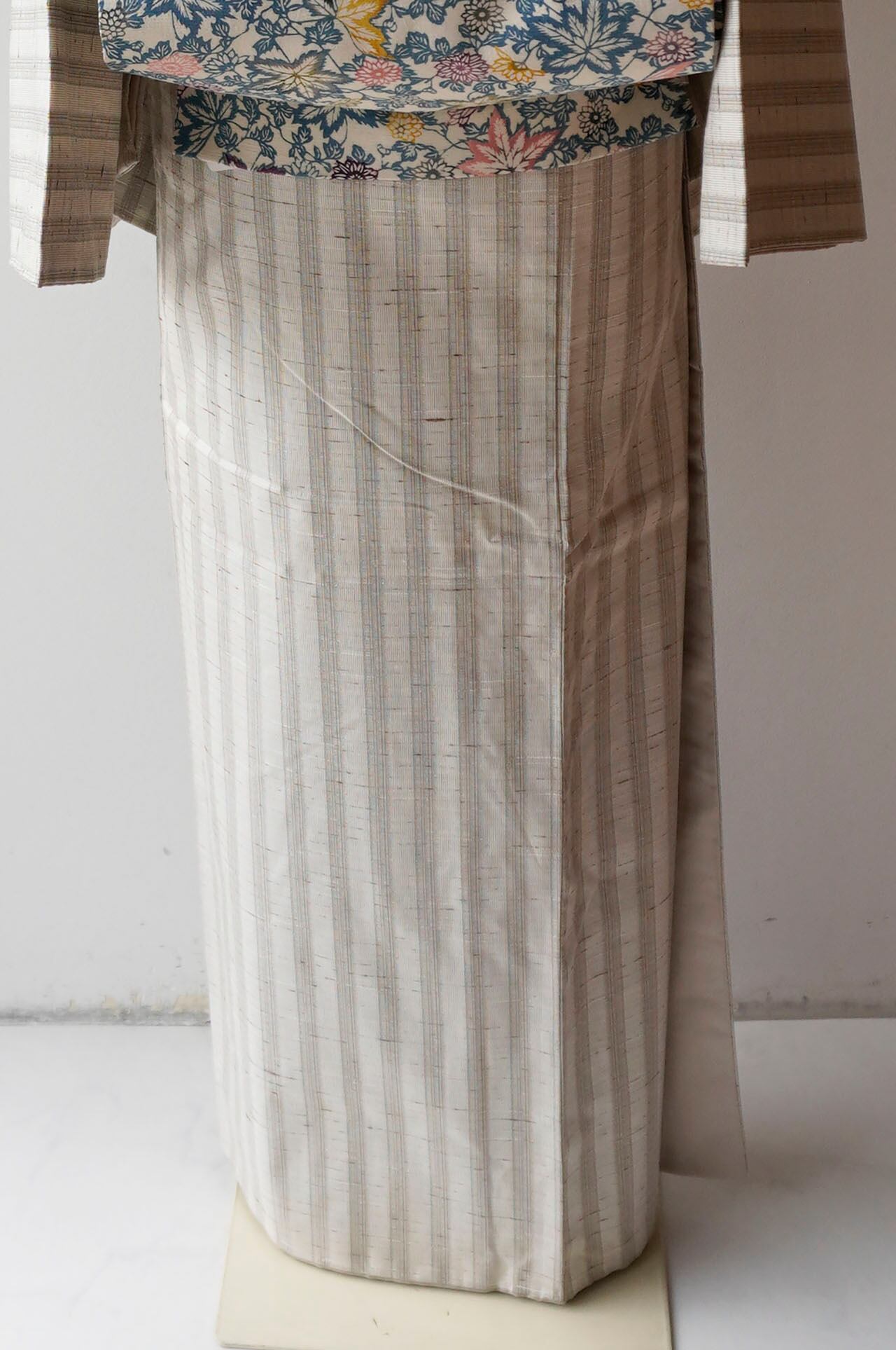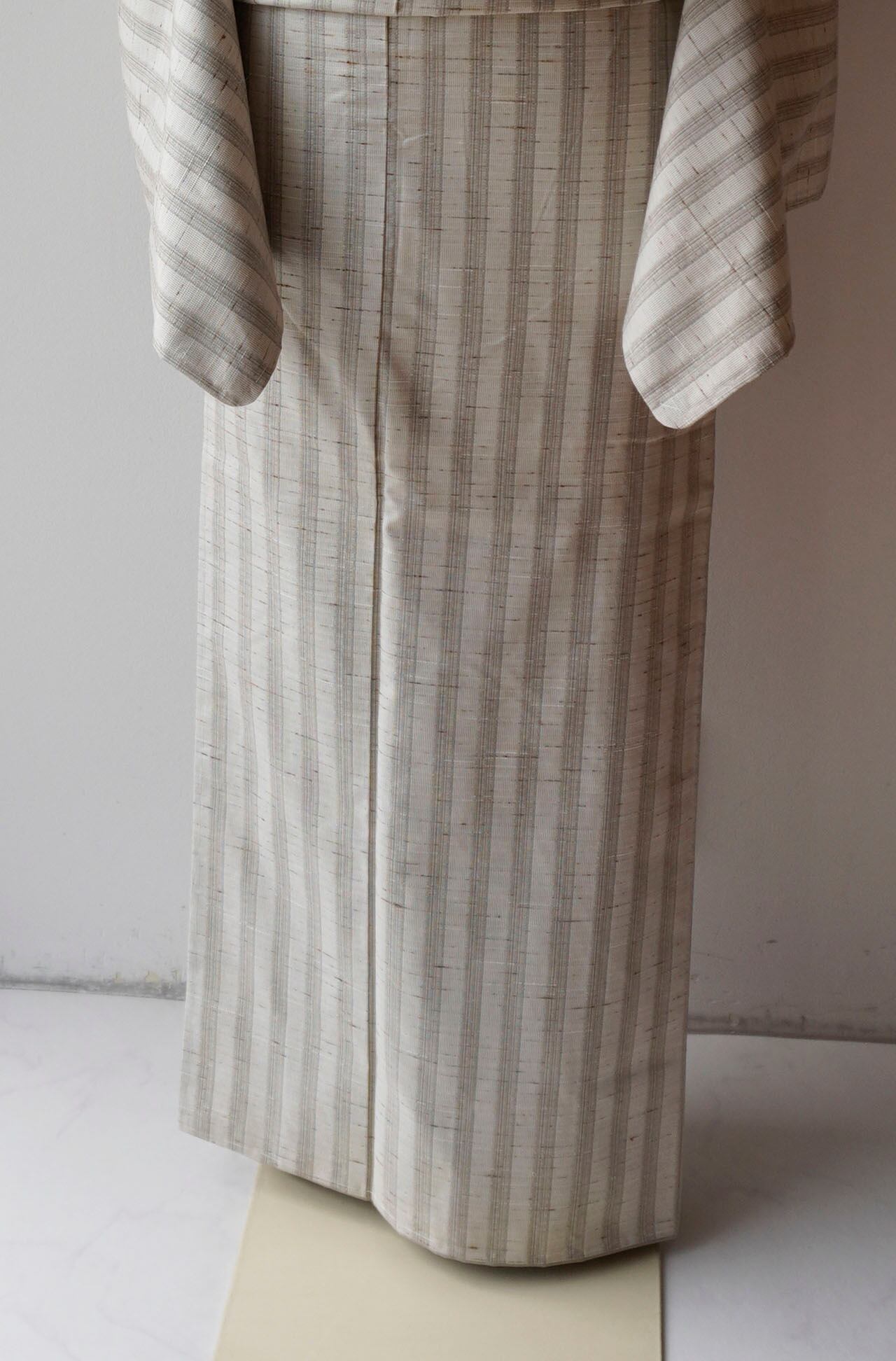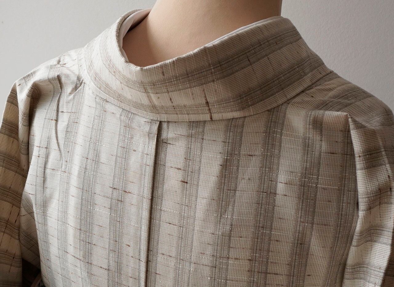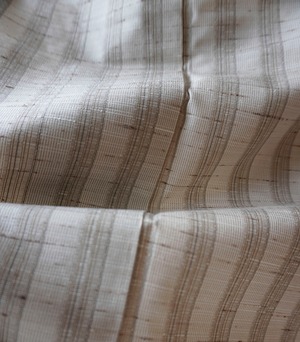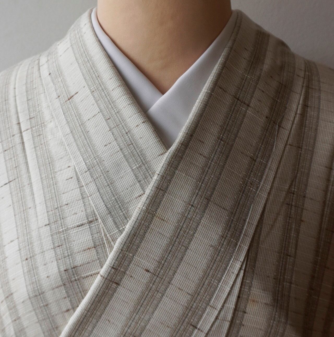 【袷】紅花の里工房 胡粉色×色白橡 縞文 ぜんまい紬