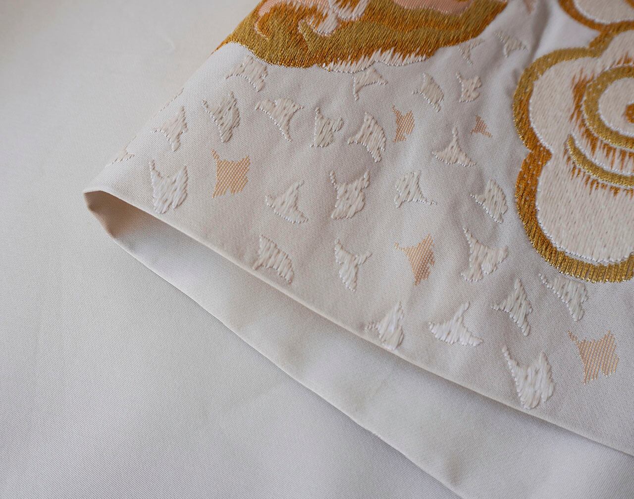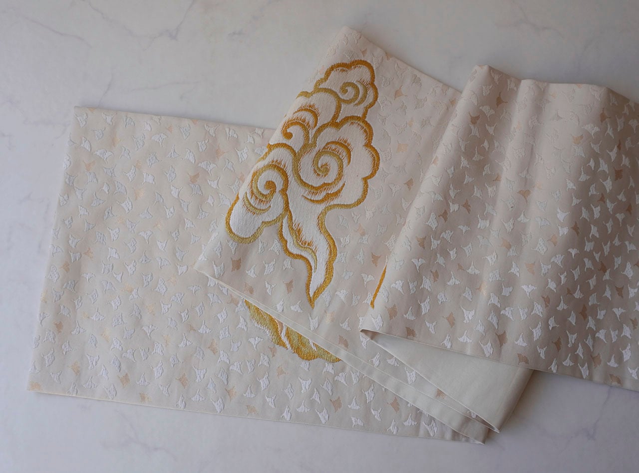 【ふくろ帯】胡粉色地 銀杏に雲文 唐織本ふくろ帯