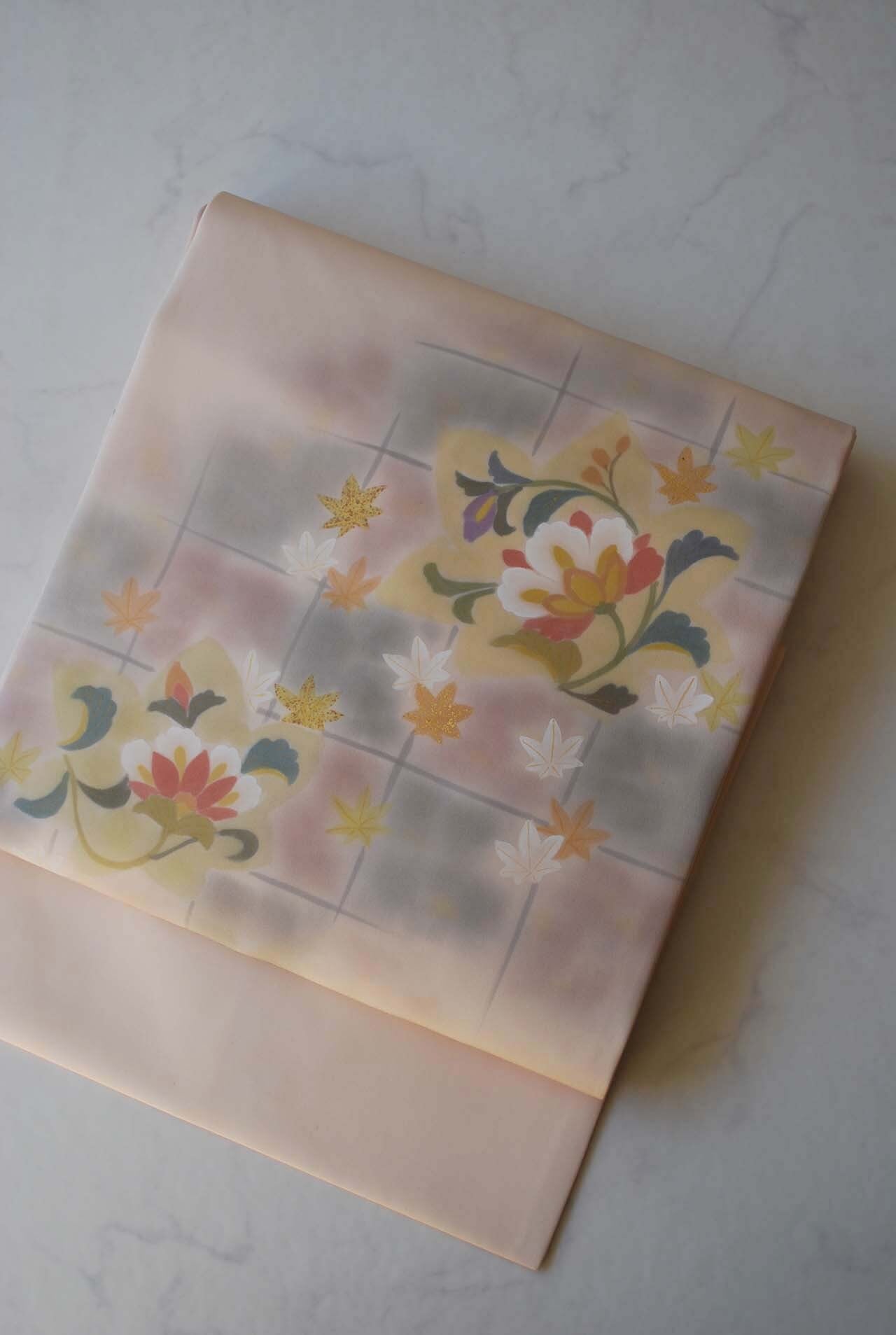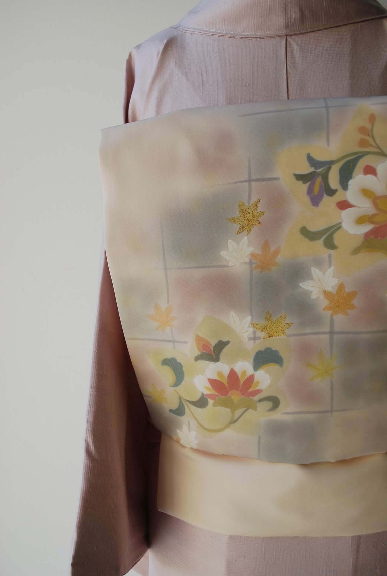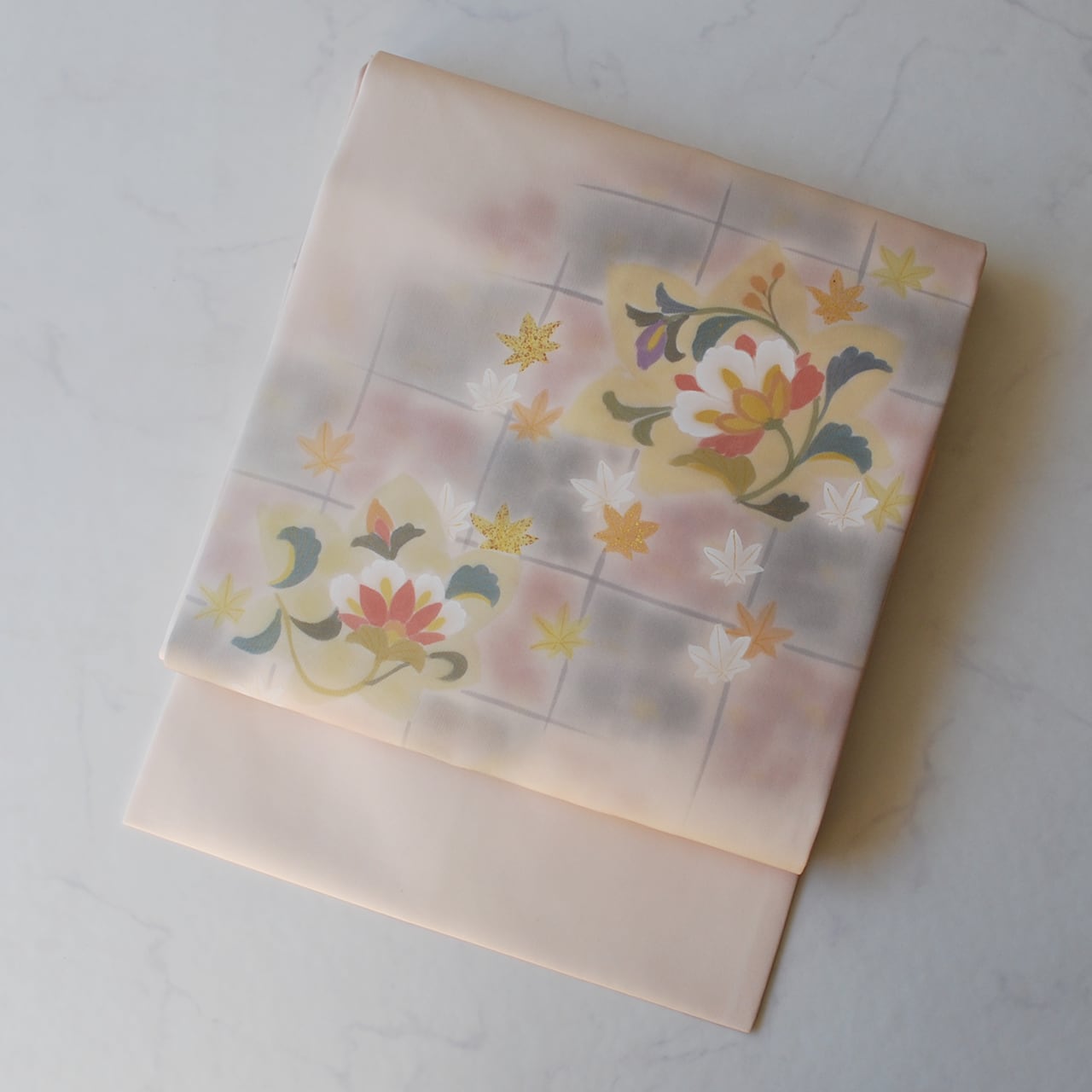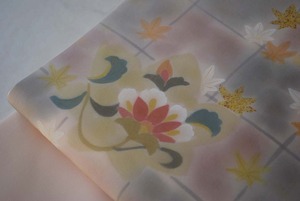 【なごや帯】格子に紅葉と華唐草 塩瀬なごや帯