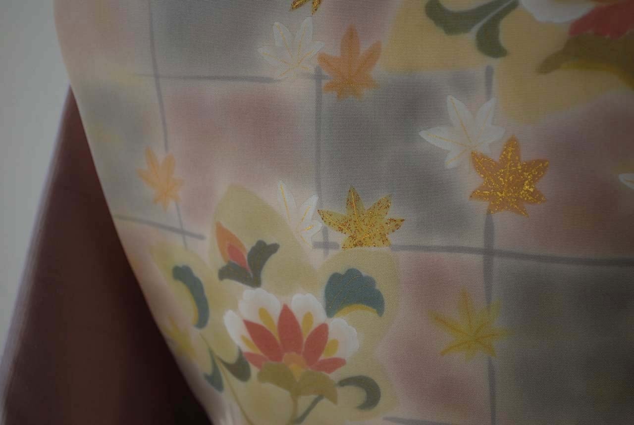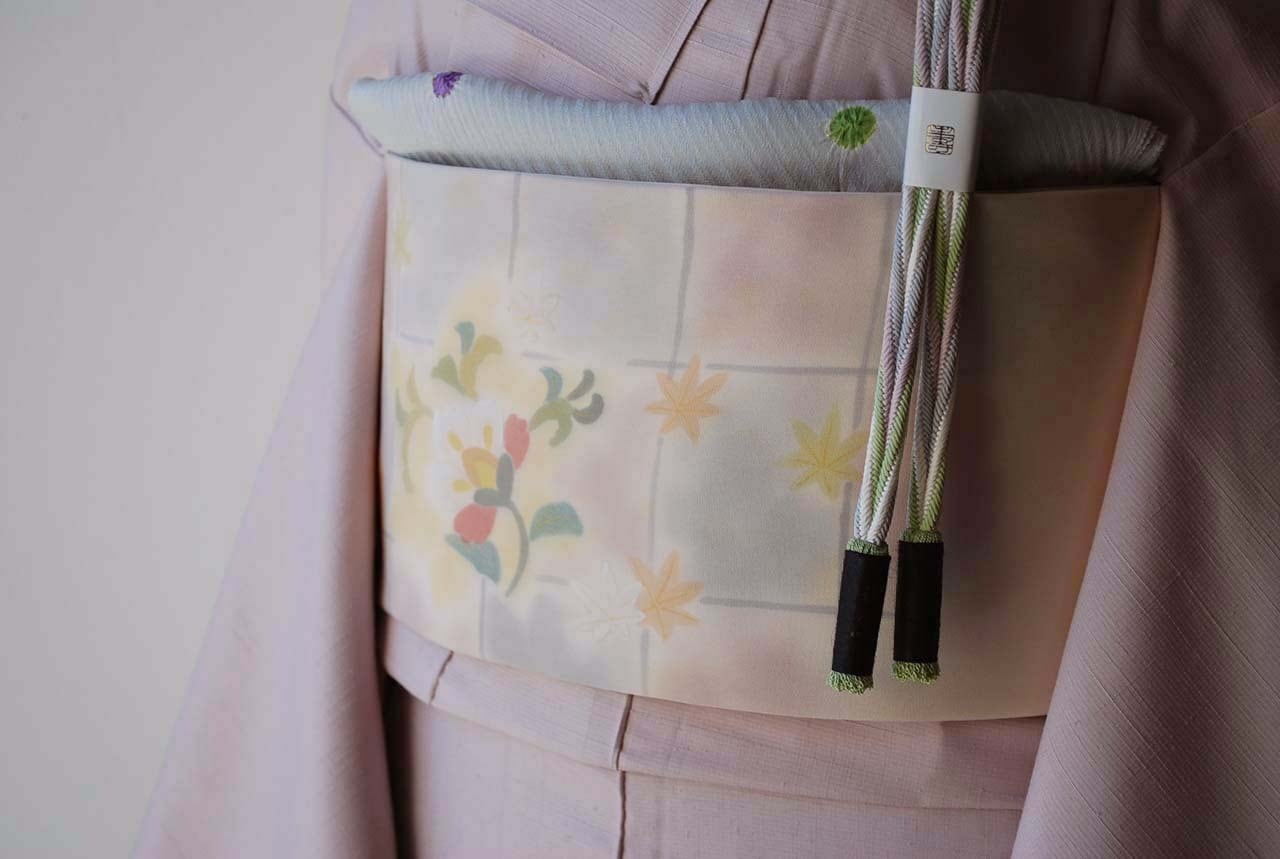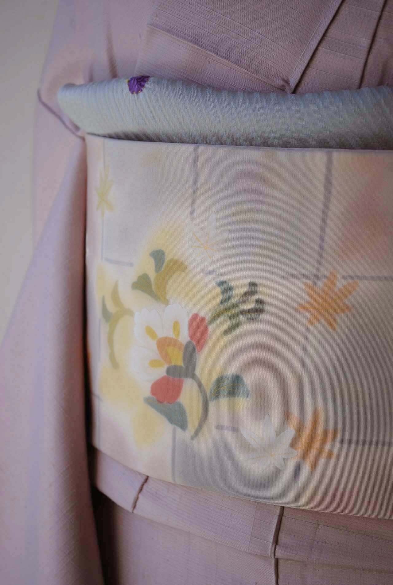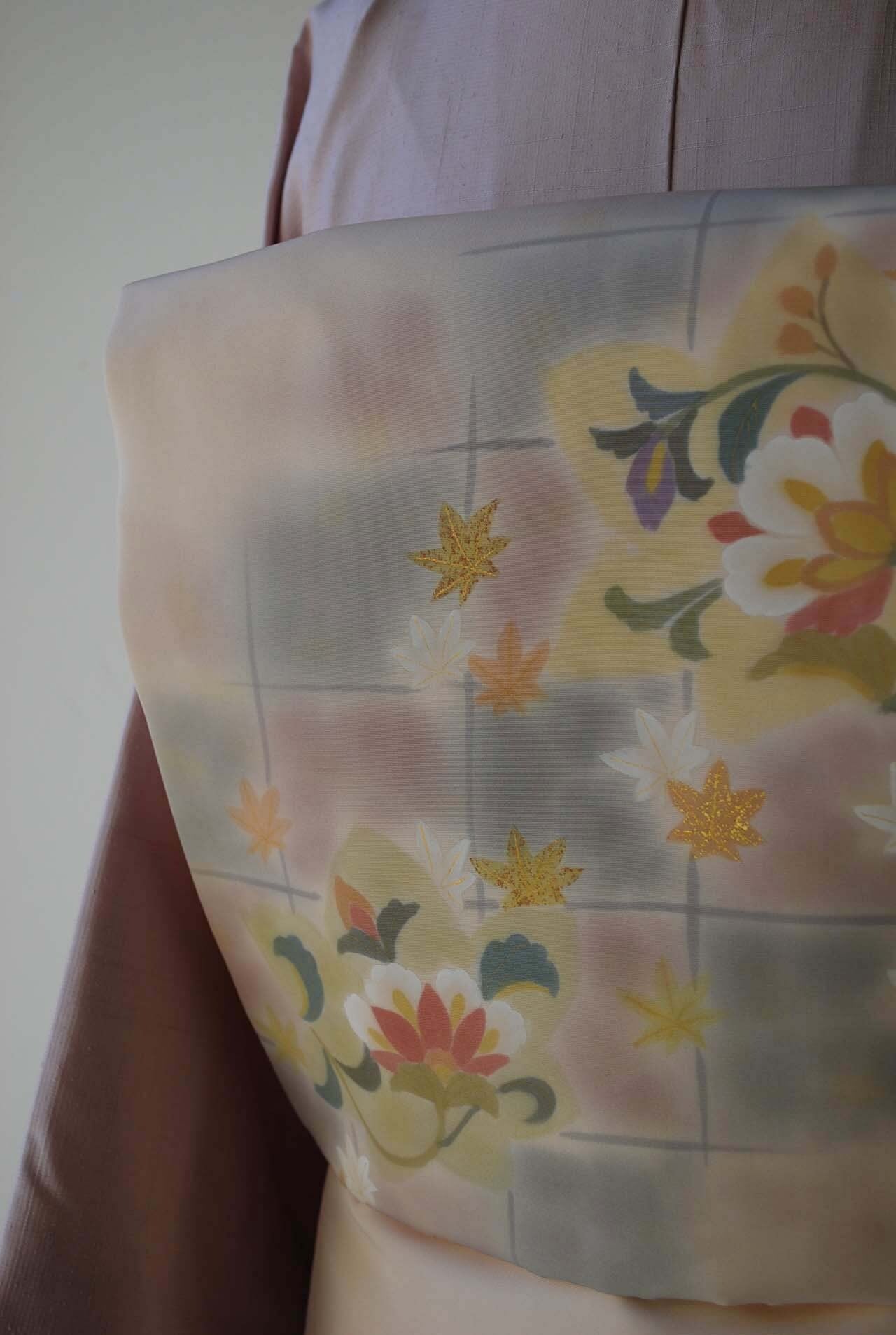 【なごや帯】格子に紅葉と華唐草 塩瀬なごや帯