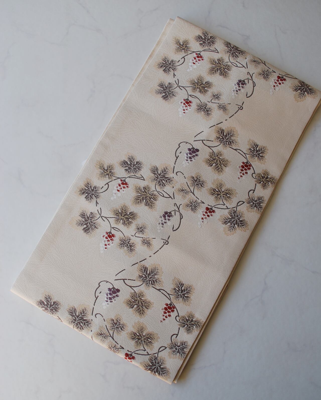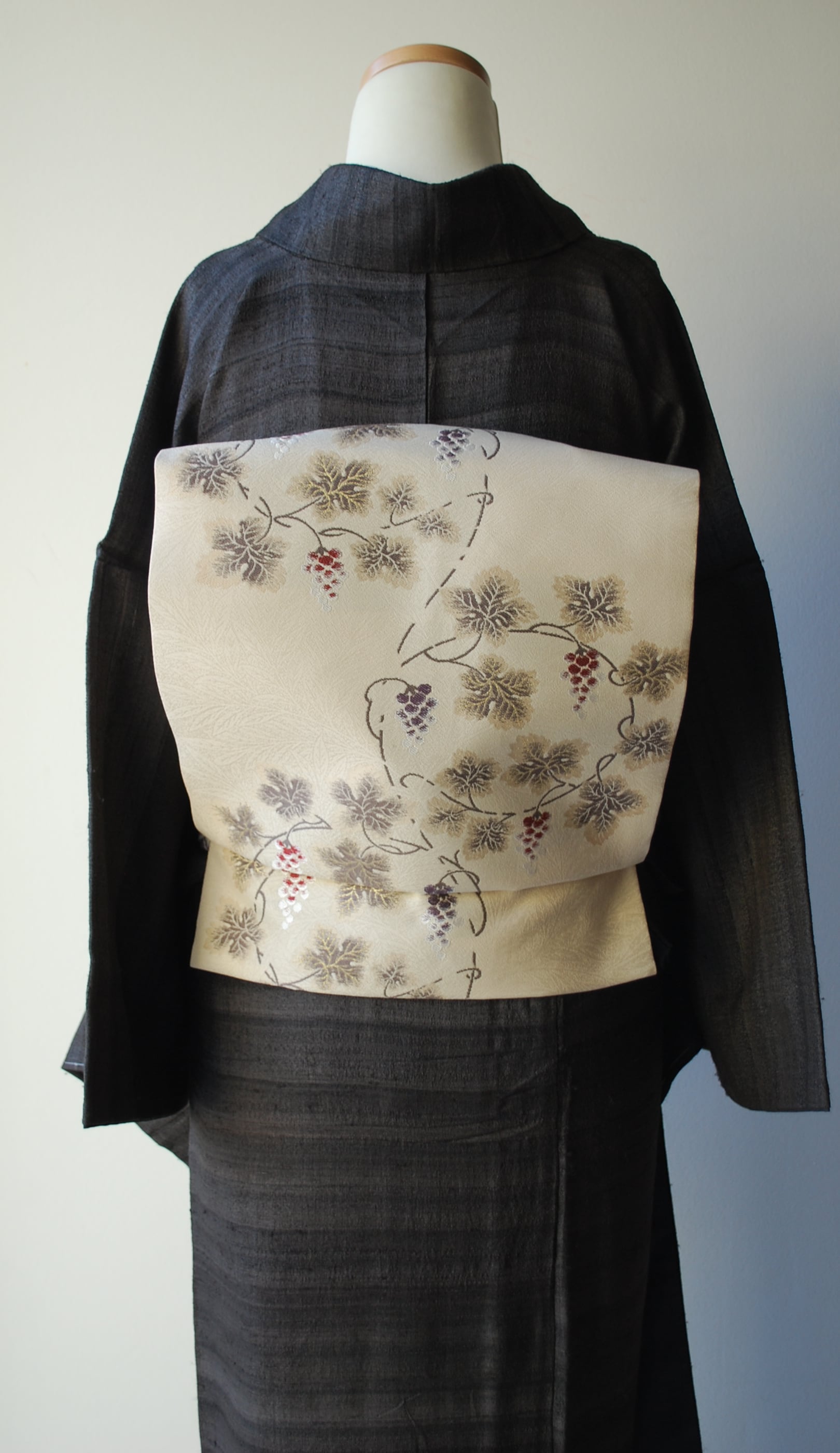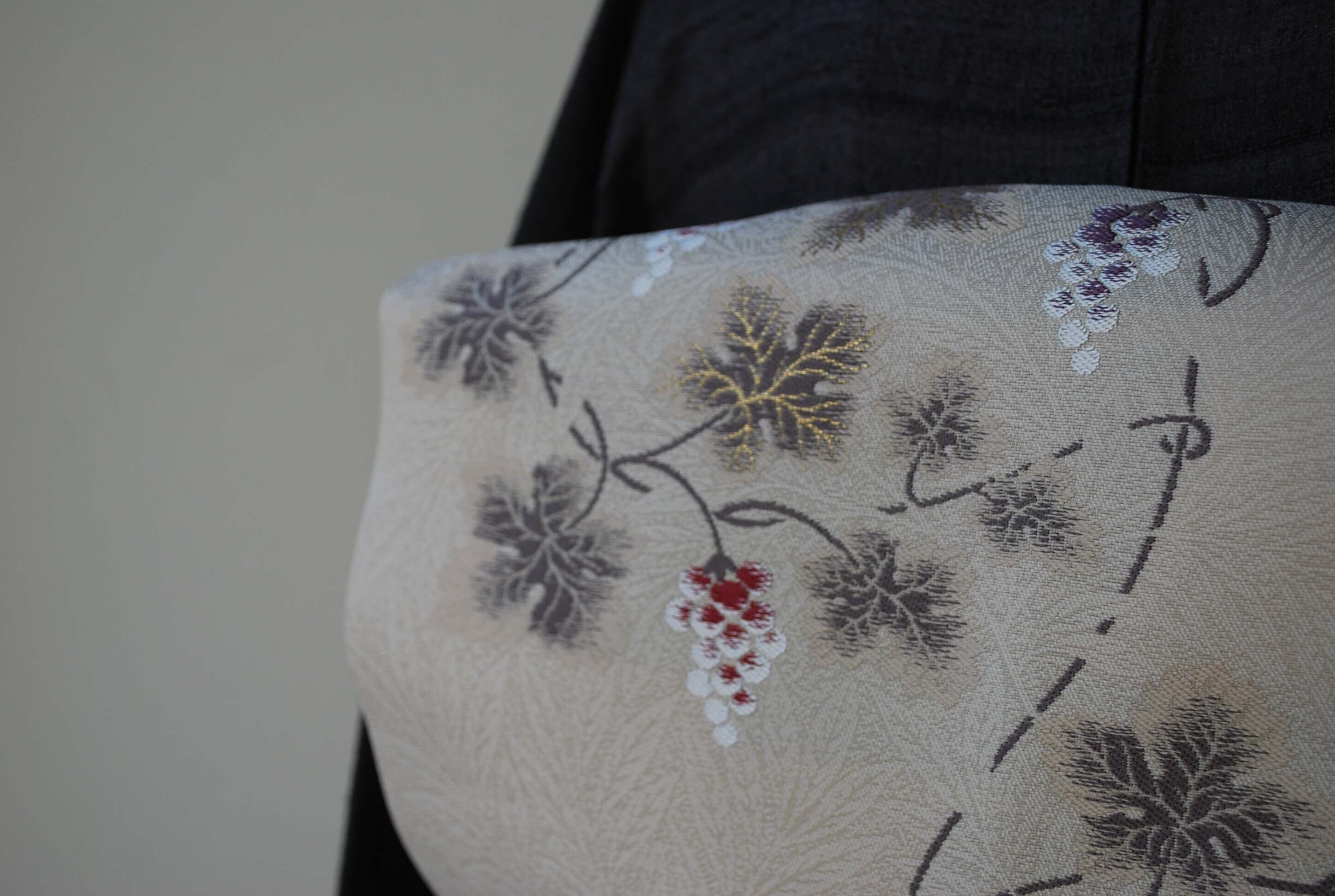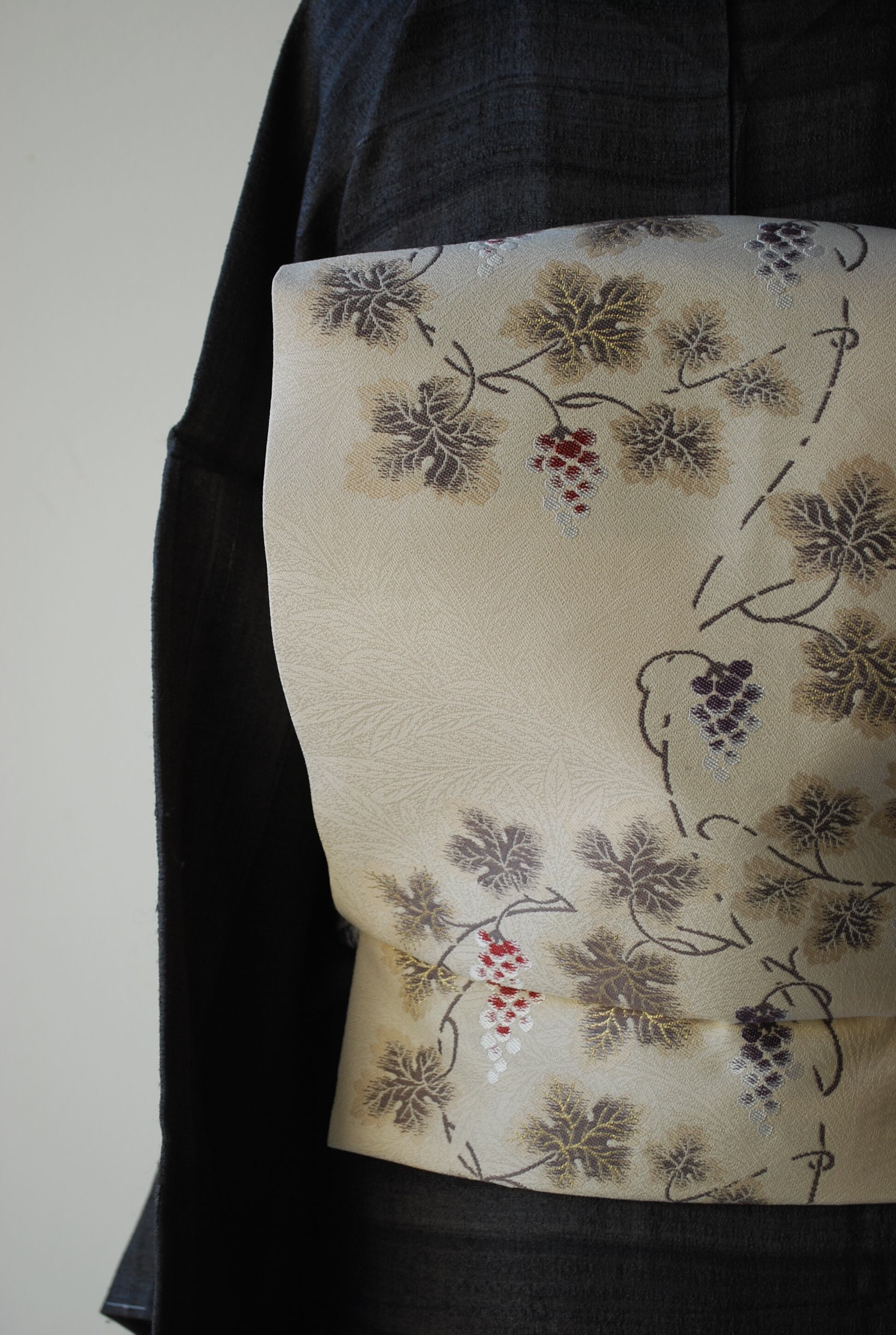 こちらの帯の葡萄唐草は、繊細な雰囲気で蔦の曲線が優美です。
