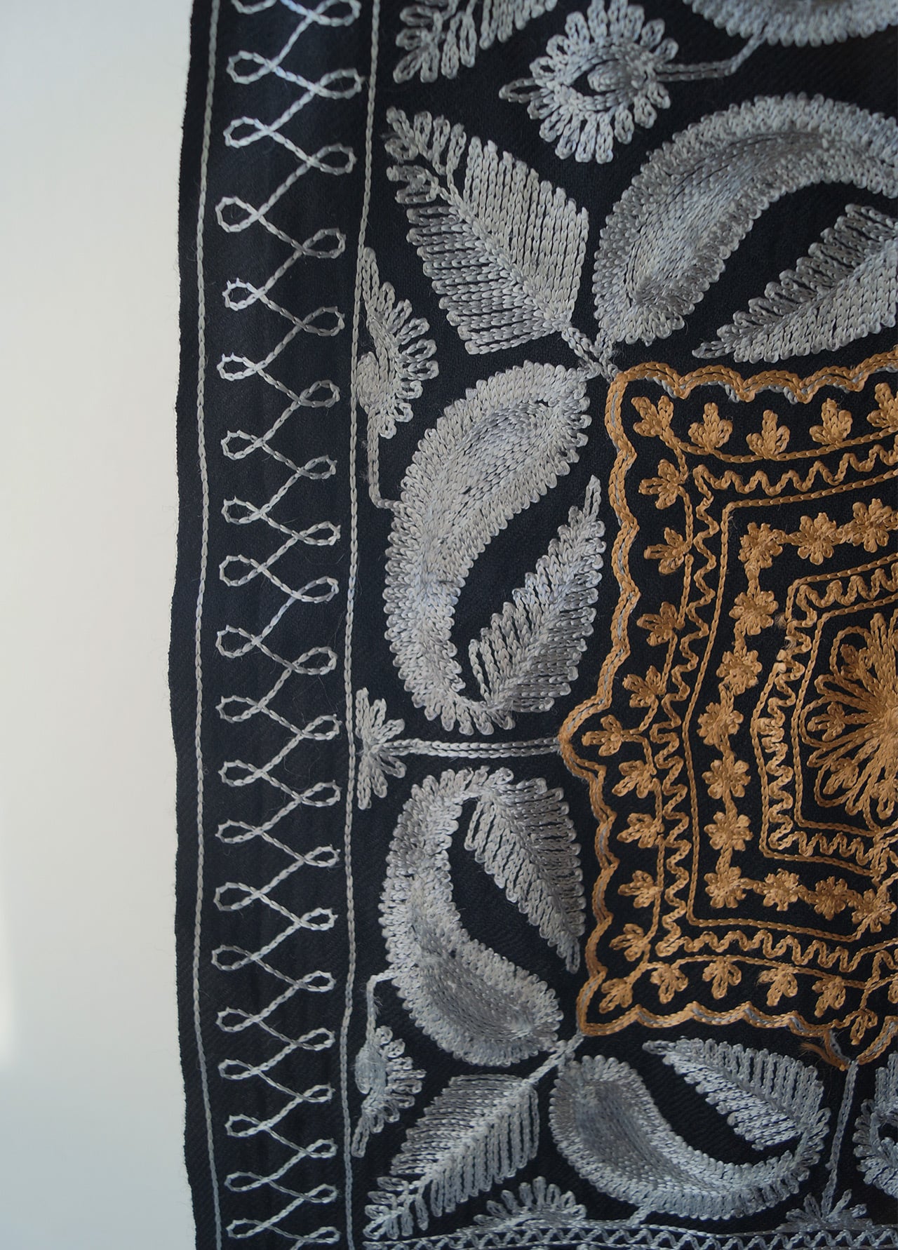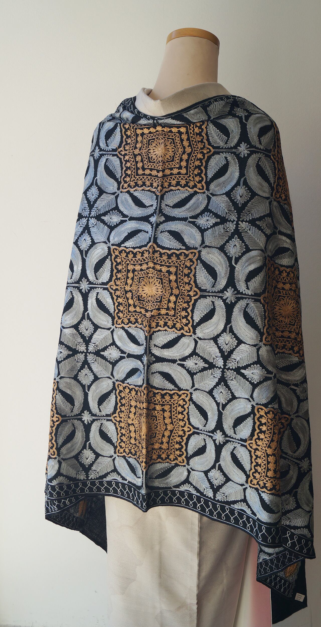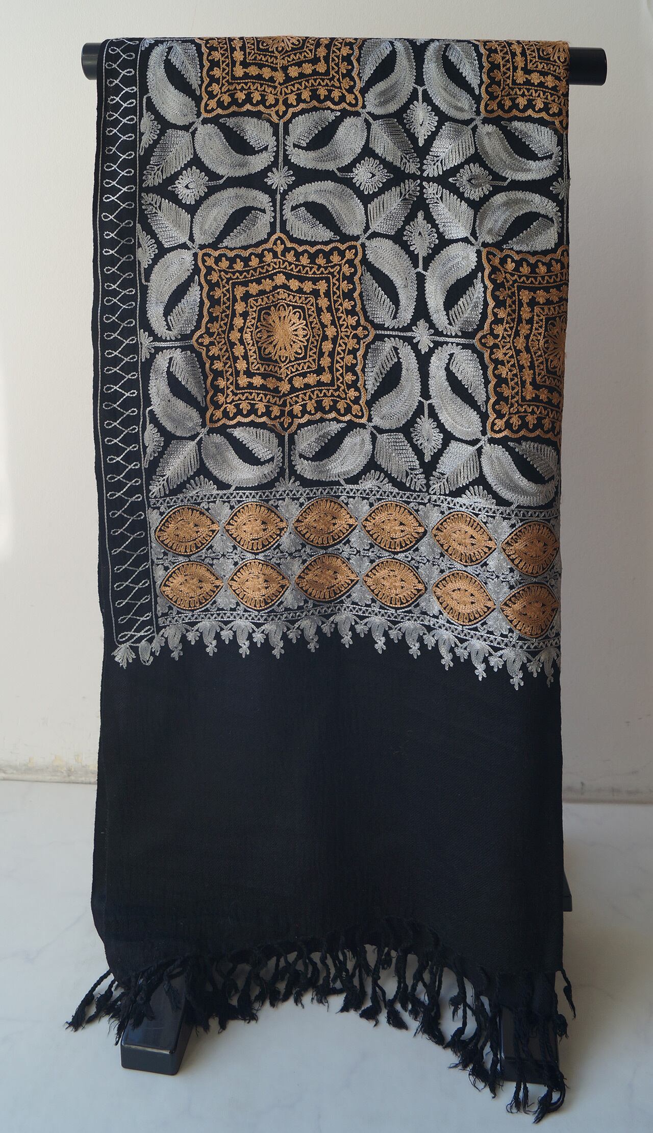 【ストール】カシミール刺繍 黒色×金色×銀色 251120A