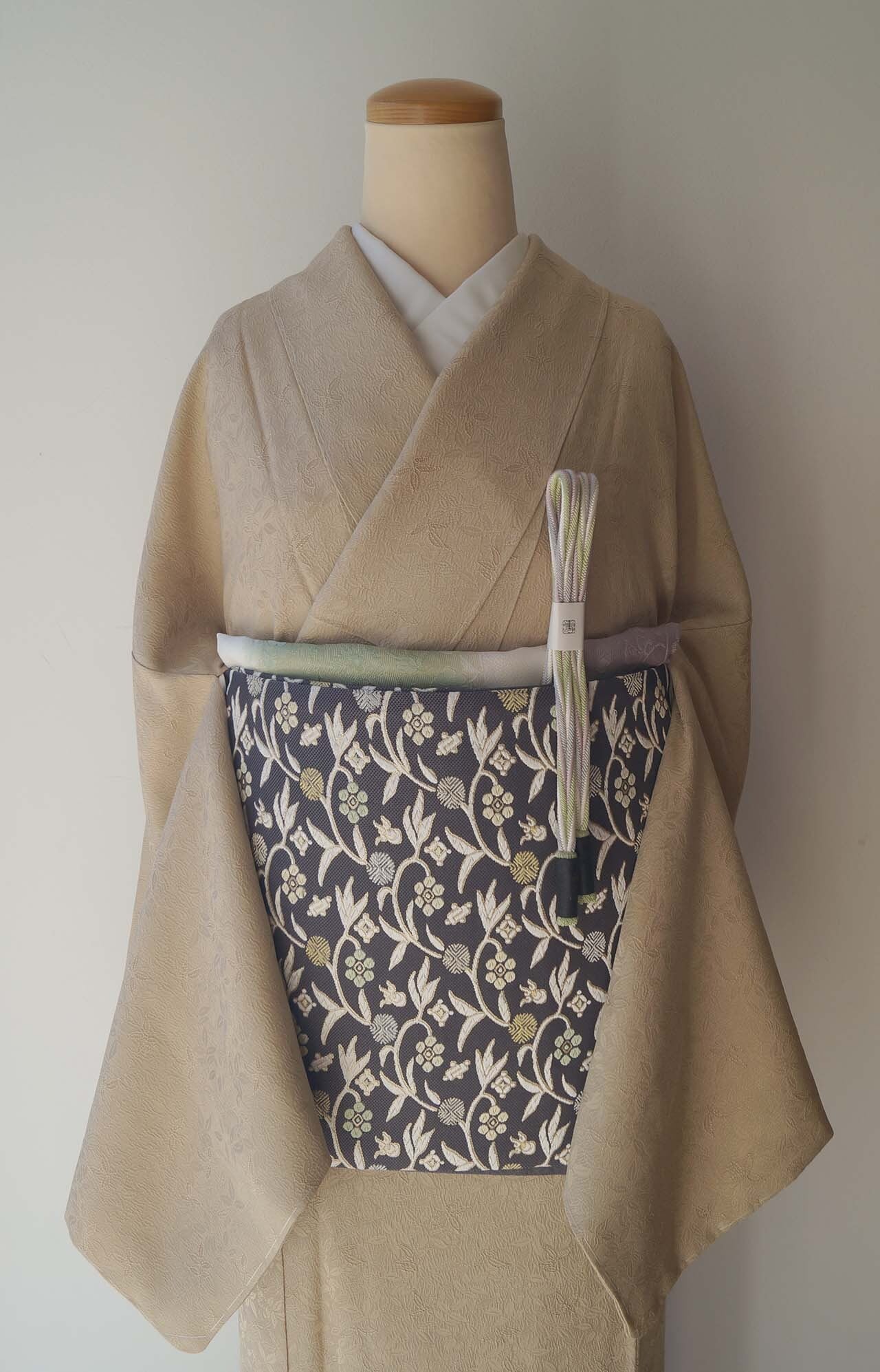 笹蔓文と宝尽くし文が重ねて織り出されています。