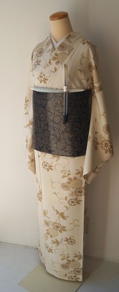 【袷】生成り色地 菊唐草に桐文 小紋
