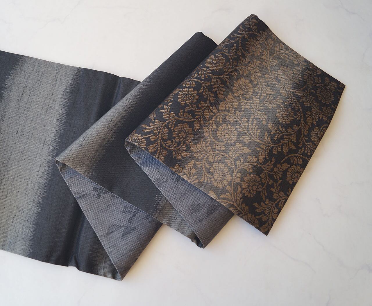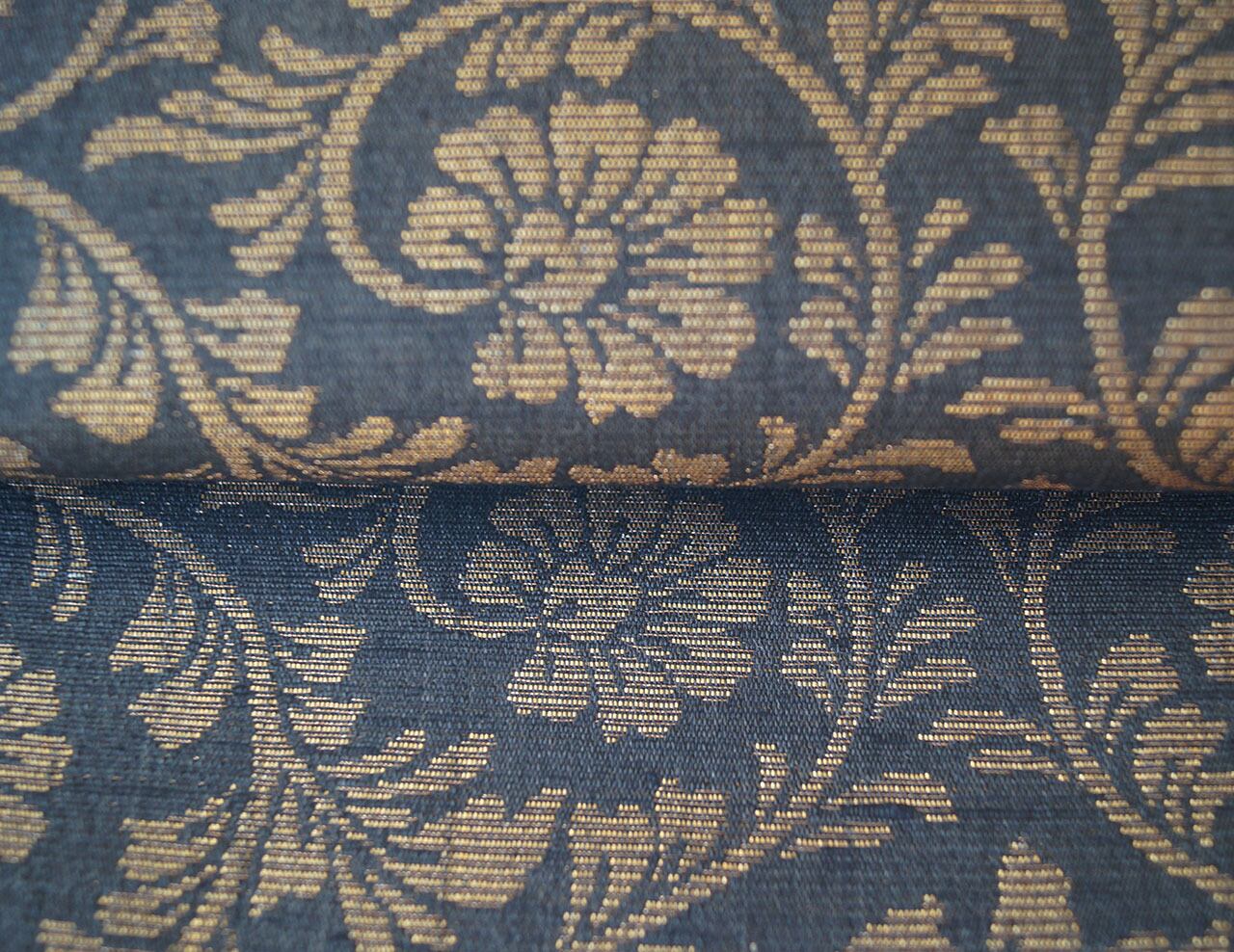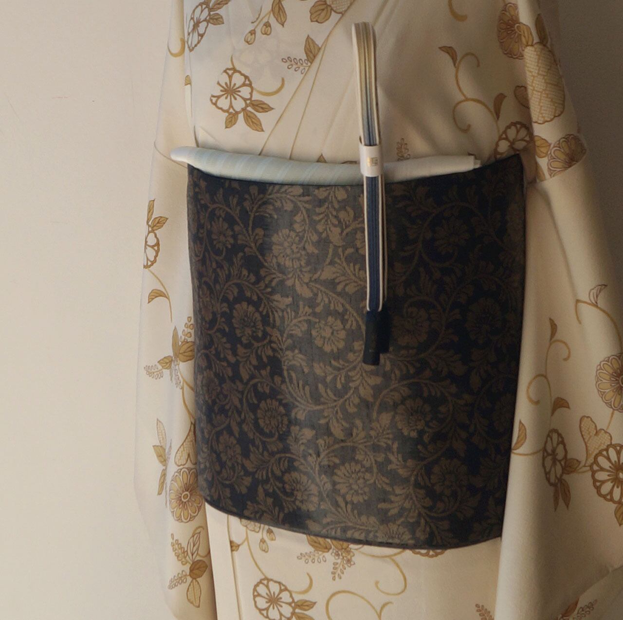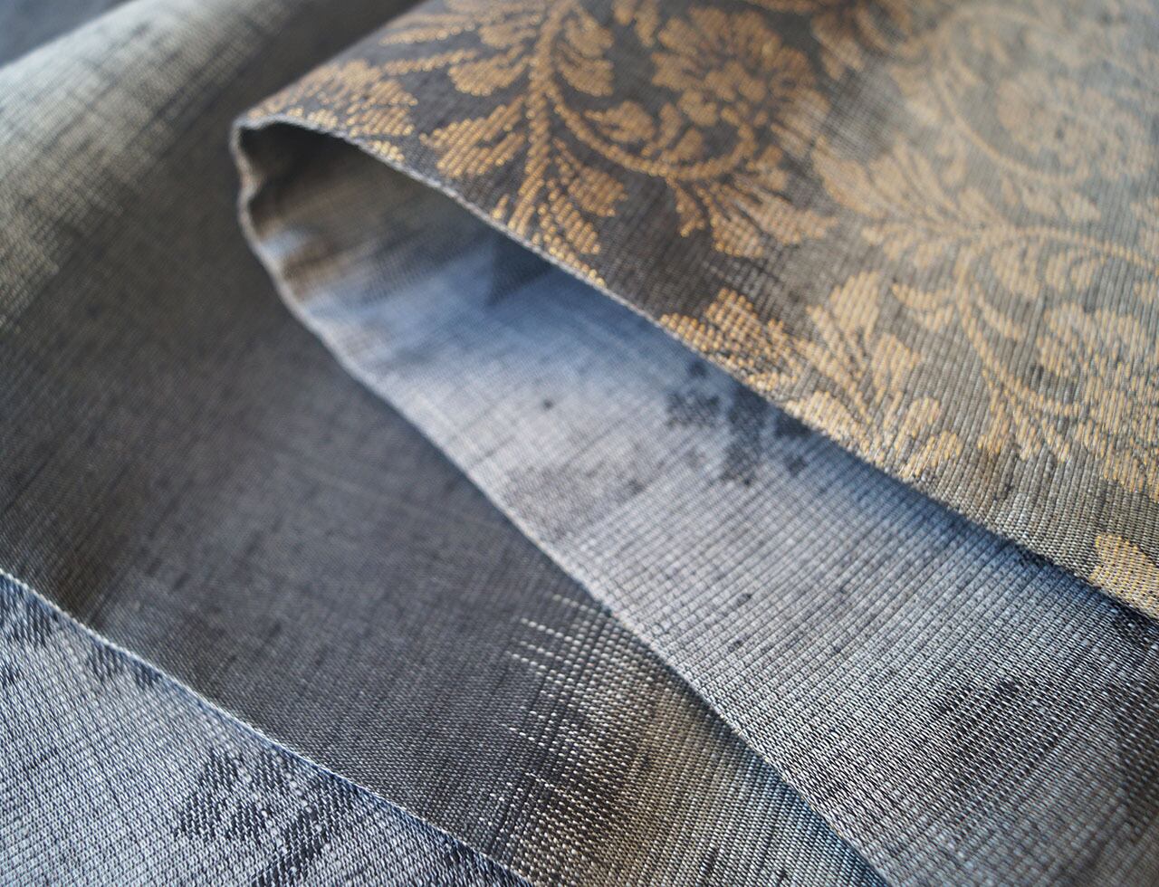シックな地色に金糸で織り出された花唐草文が