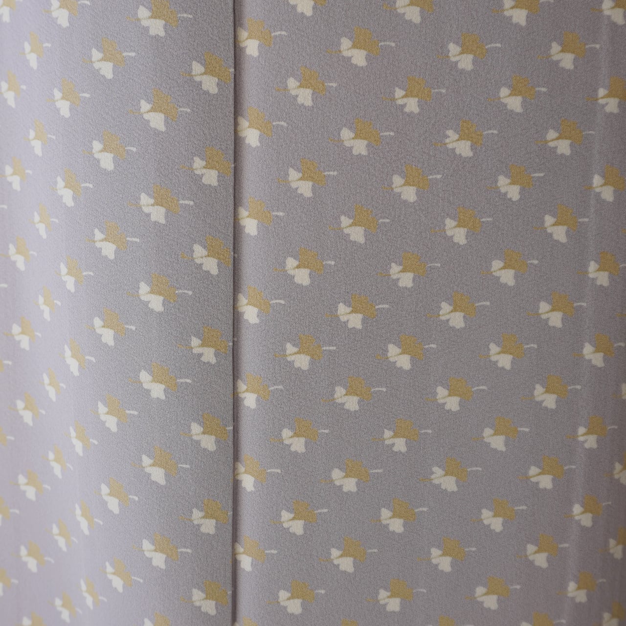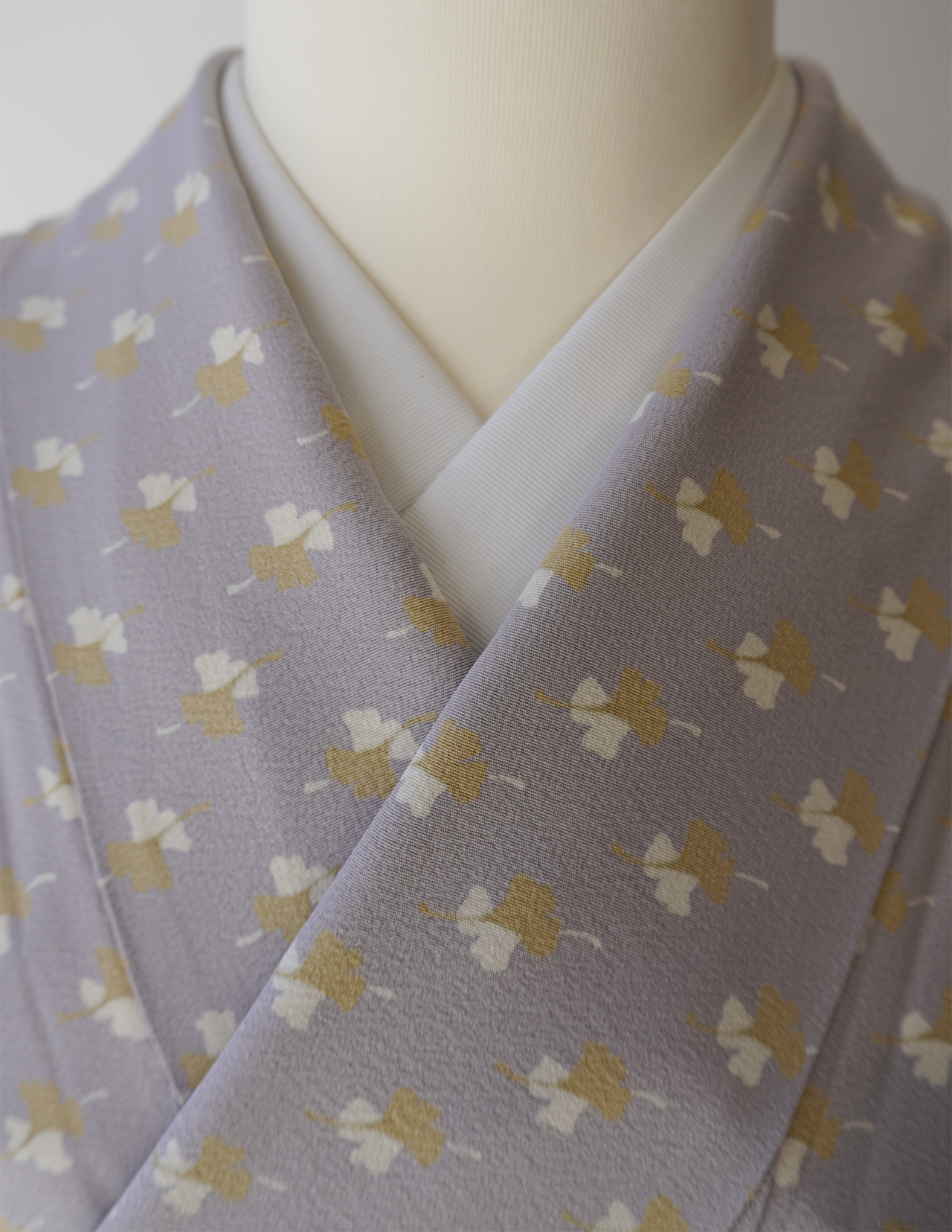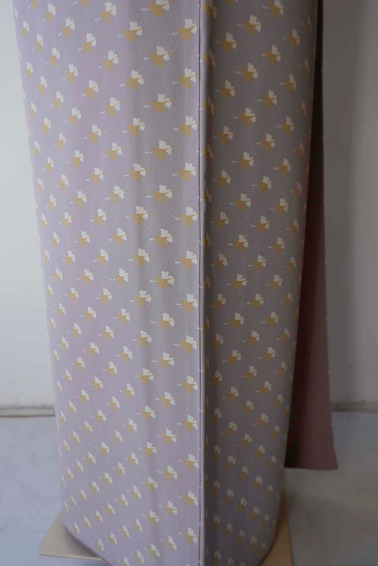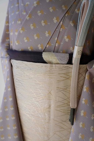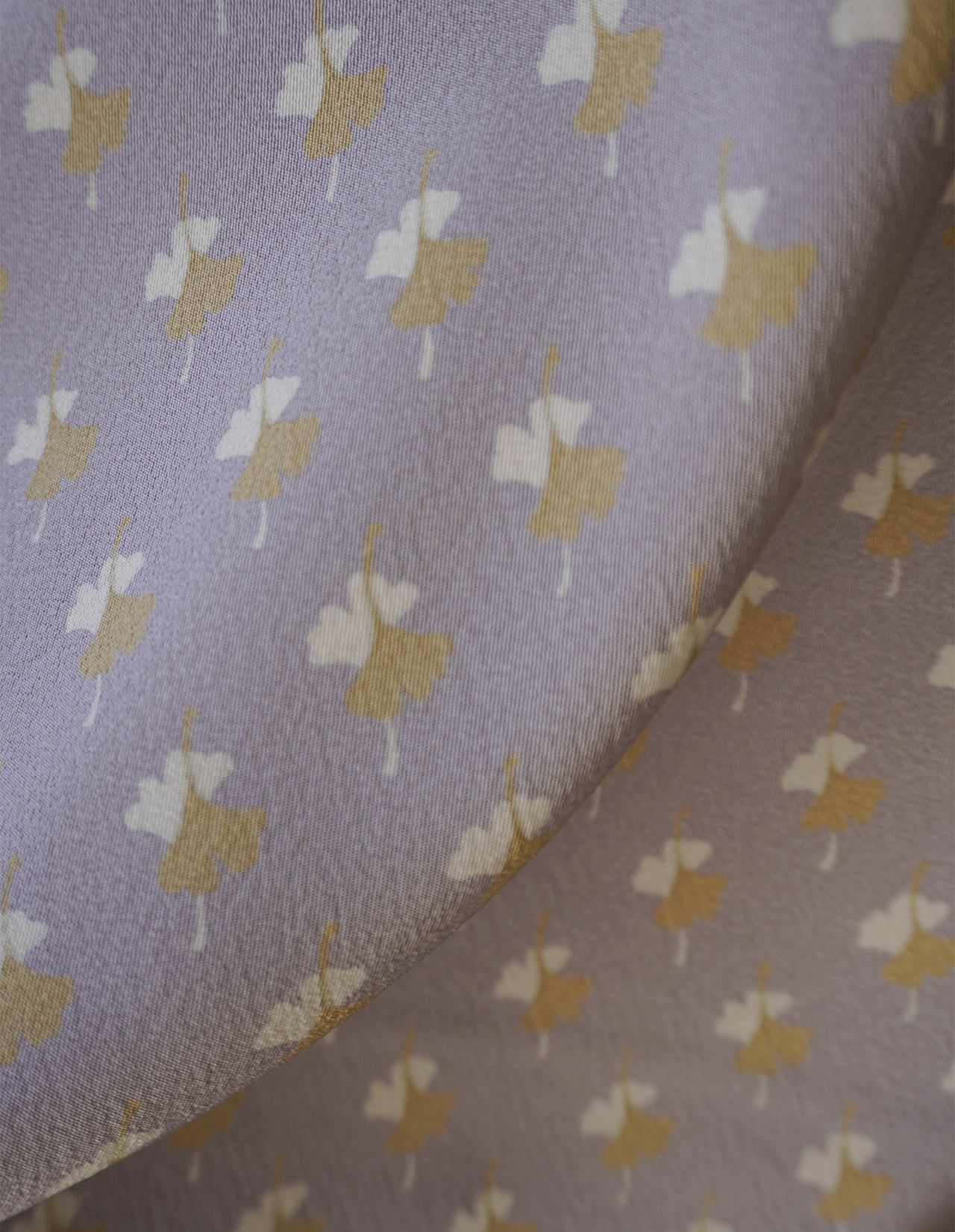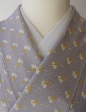 白藤色の縮緬地に芥子色と白の銀杏の葉が舞う小紋です。