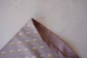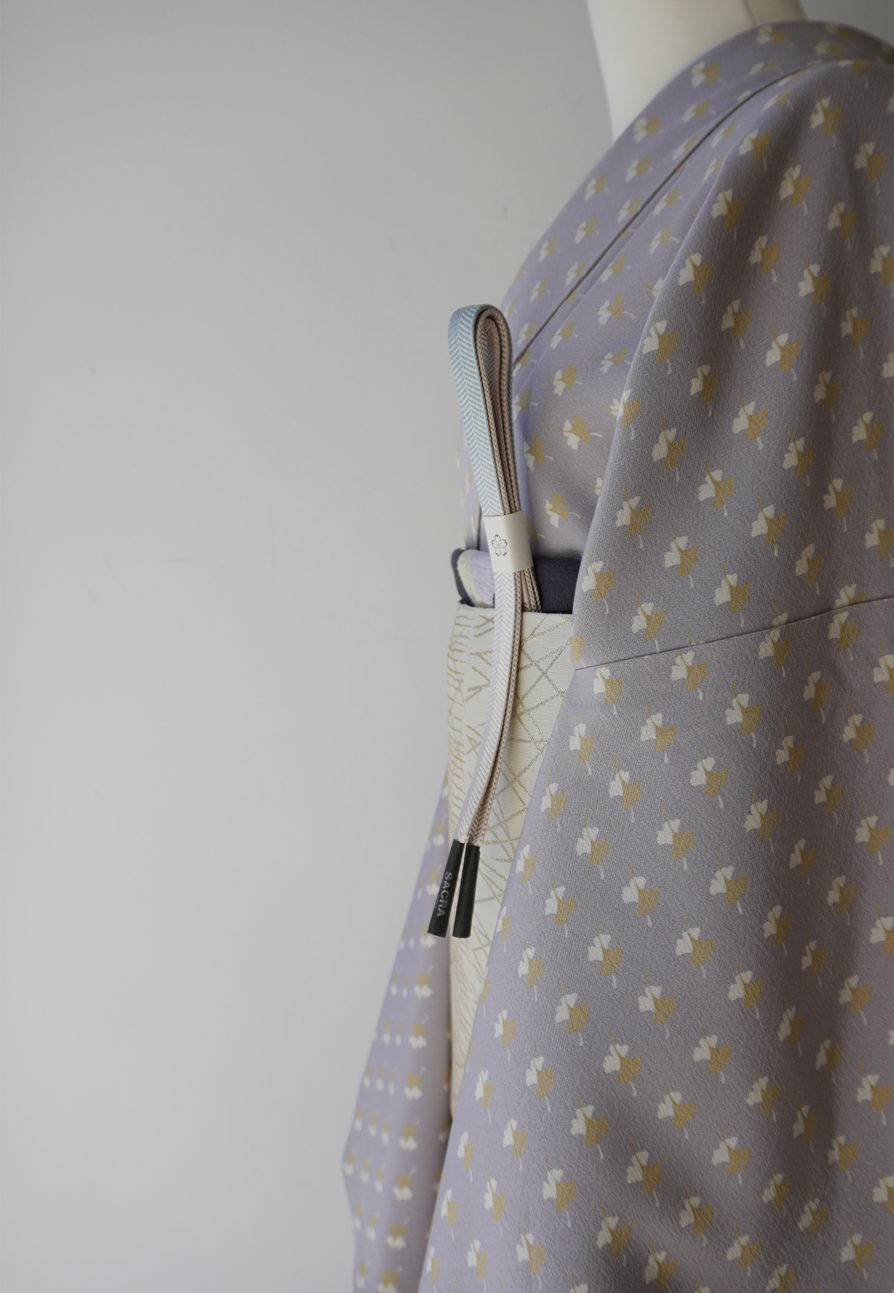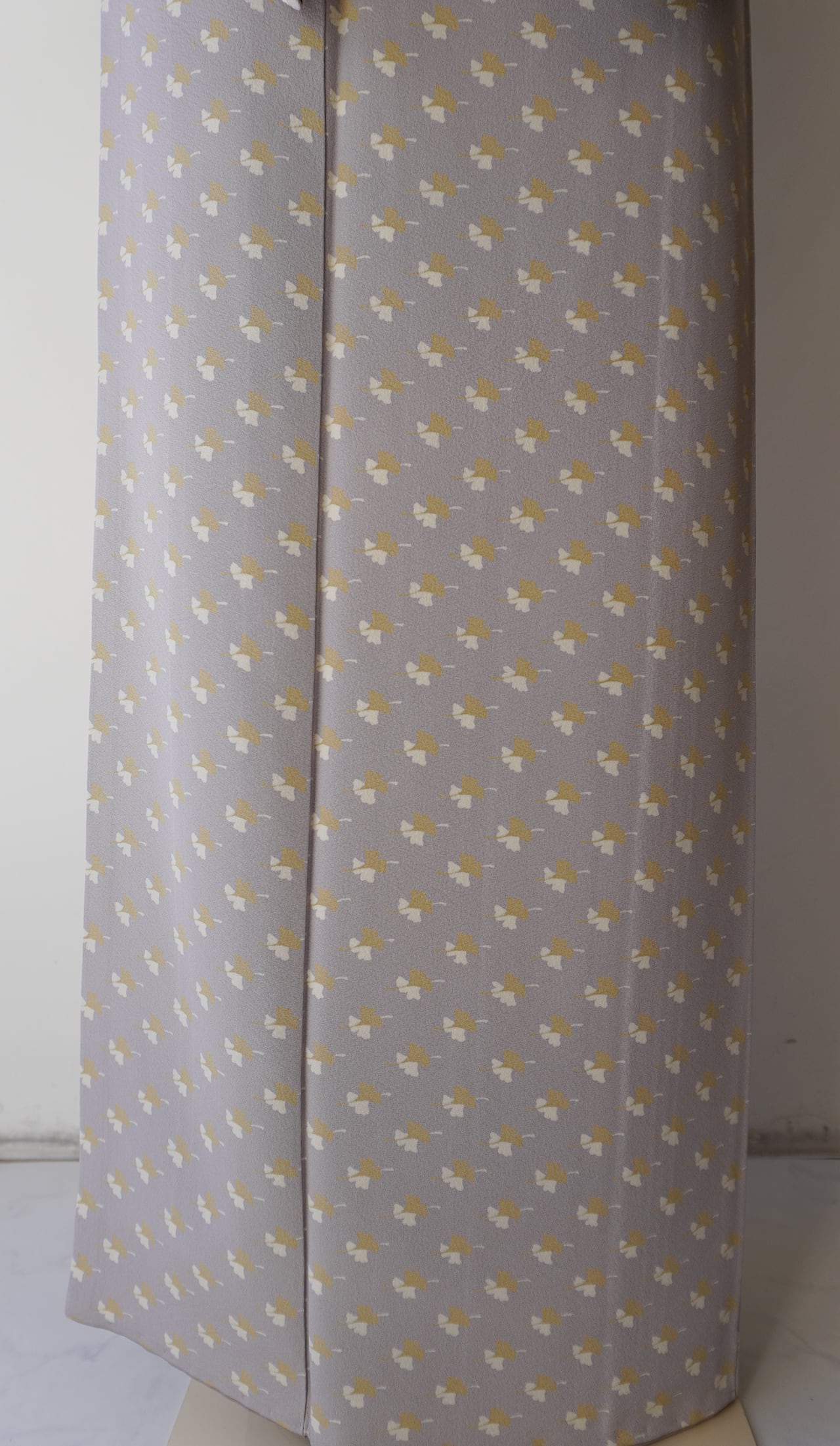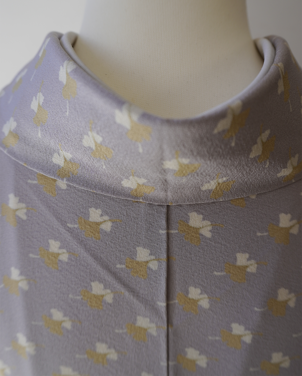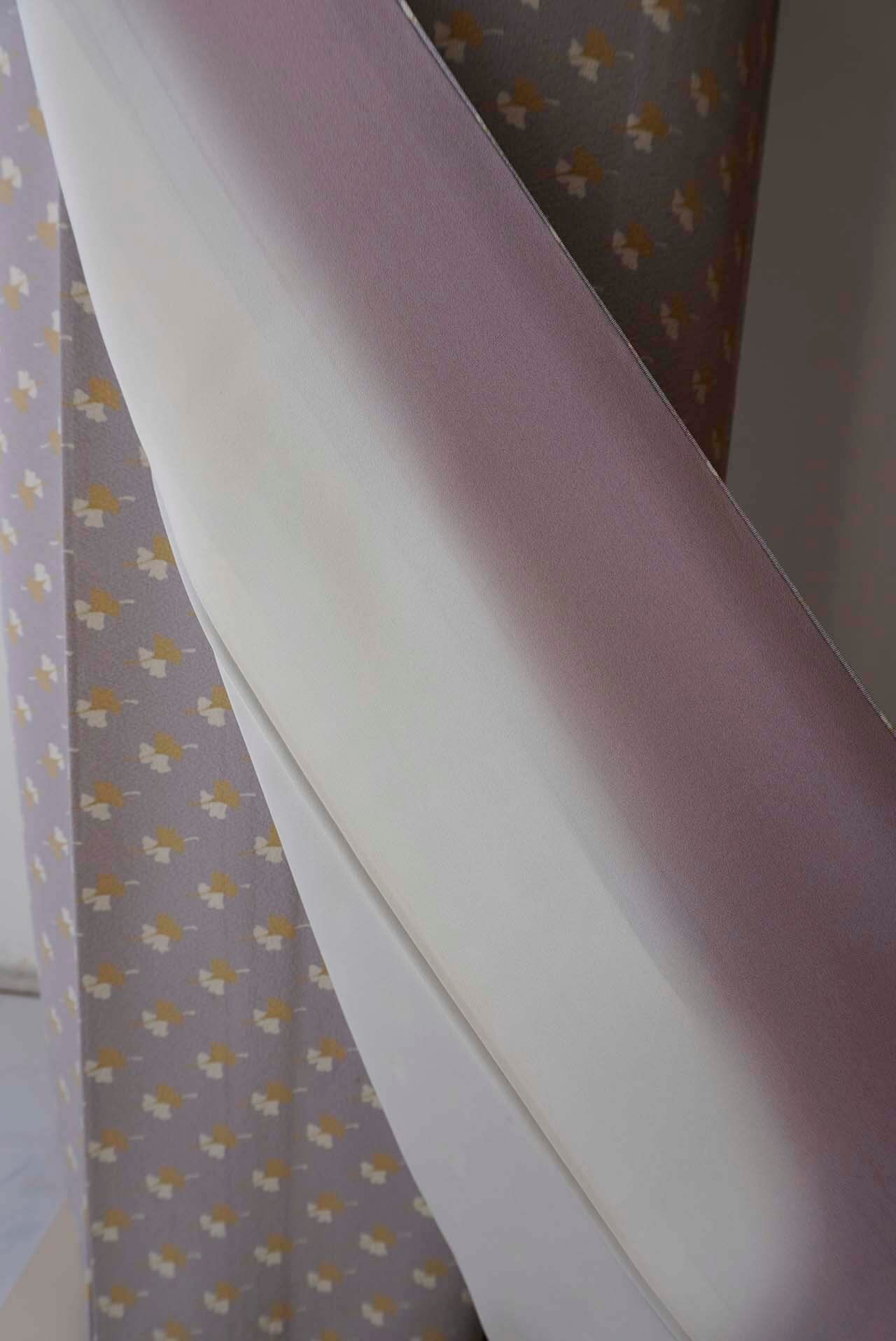 白藤色の縮緬地に芥子色と白の銀杏の葉が舞う小紋です。