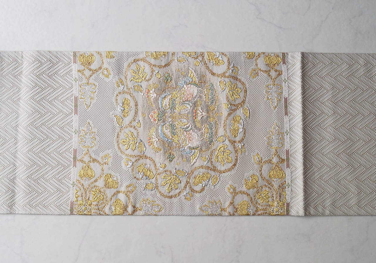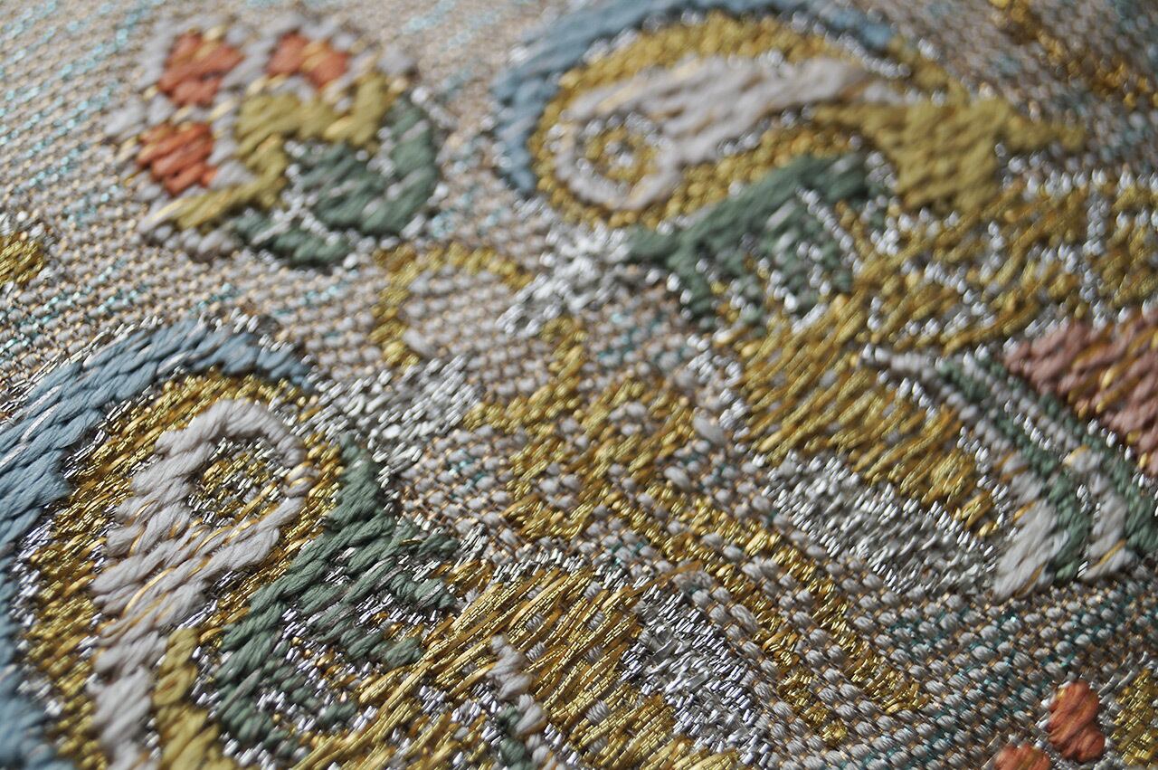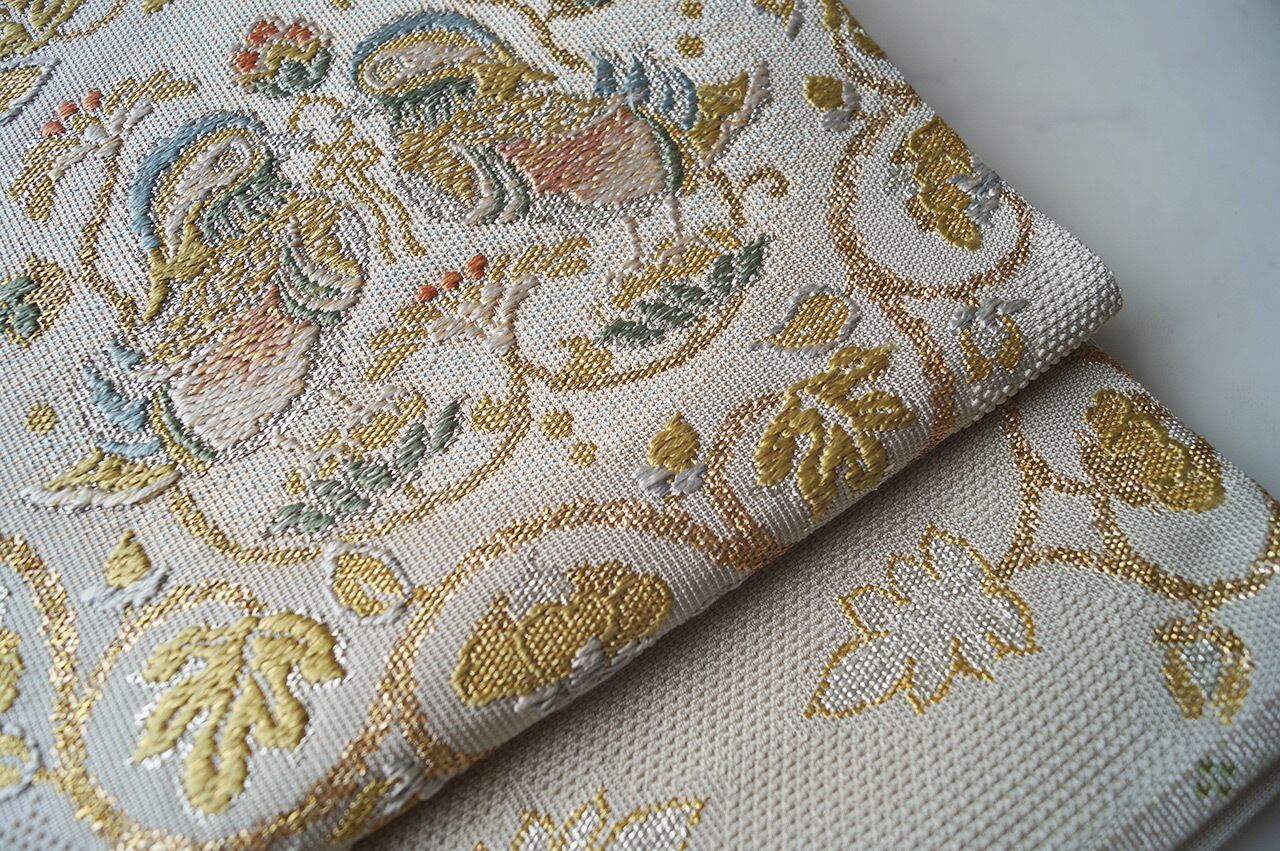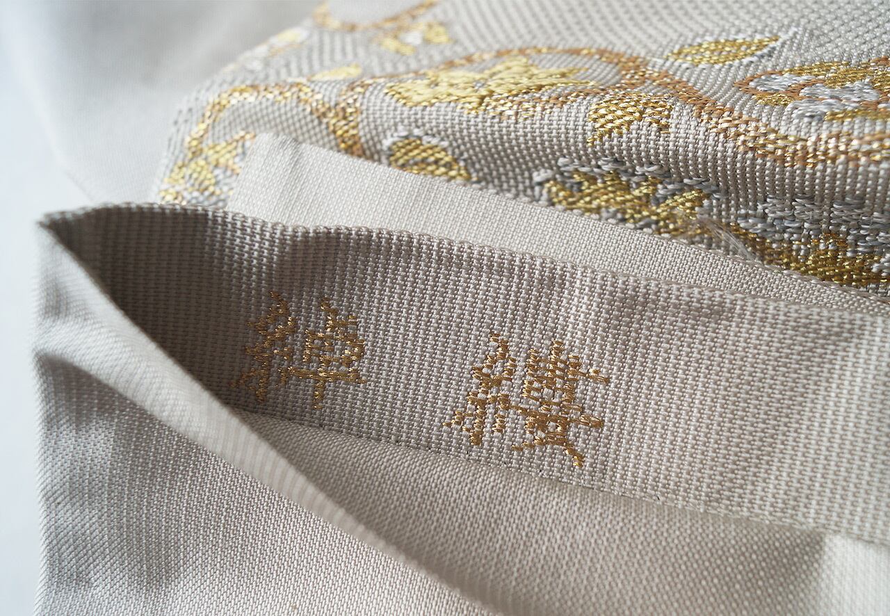 少し灰味がかった生成り地に、金糸や青磁色系