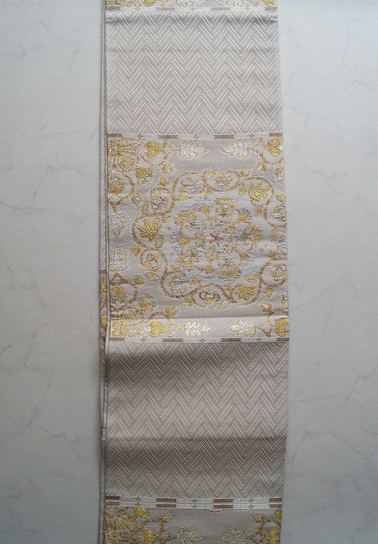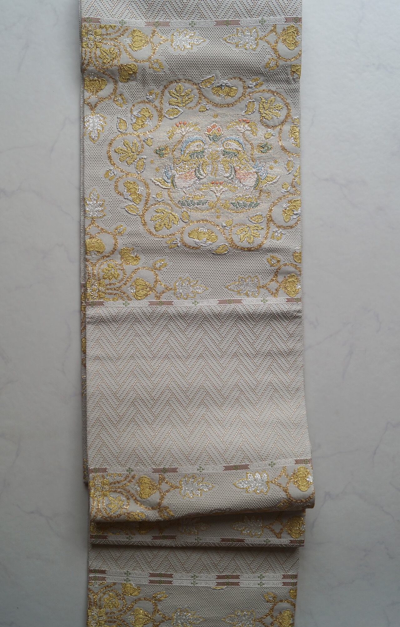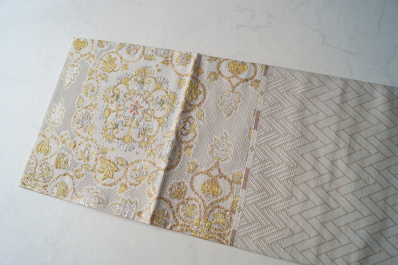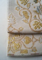 少し灰味がかった生成り地に、金糸や青磁色系