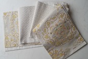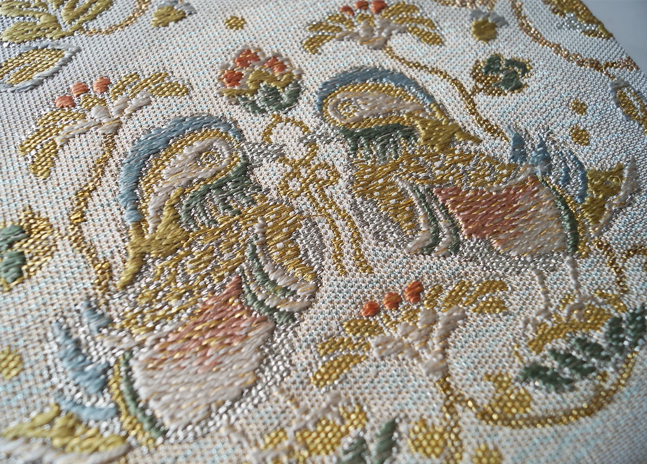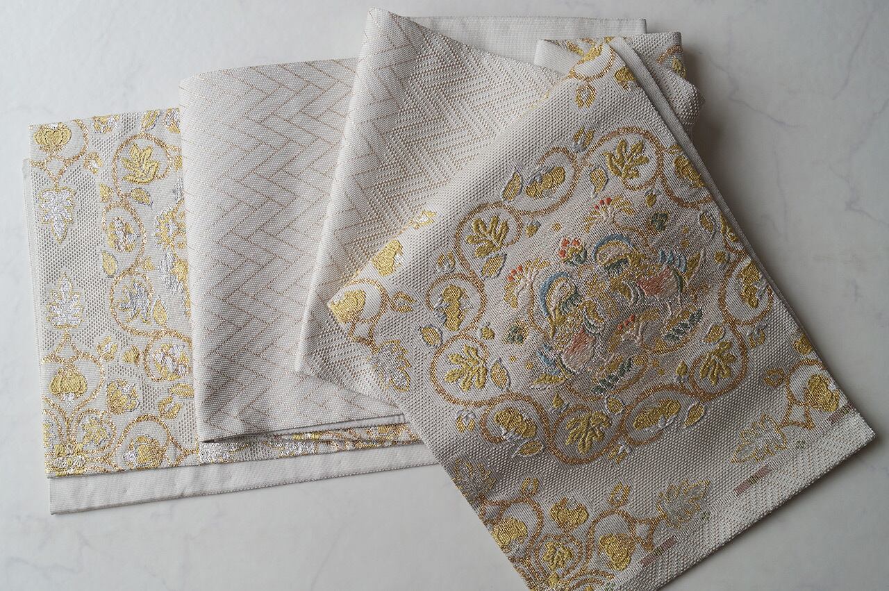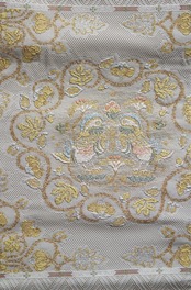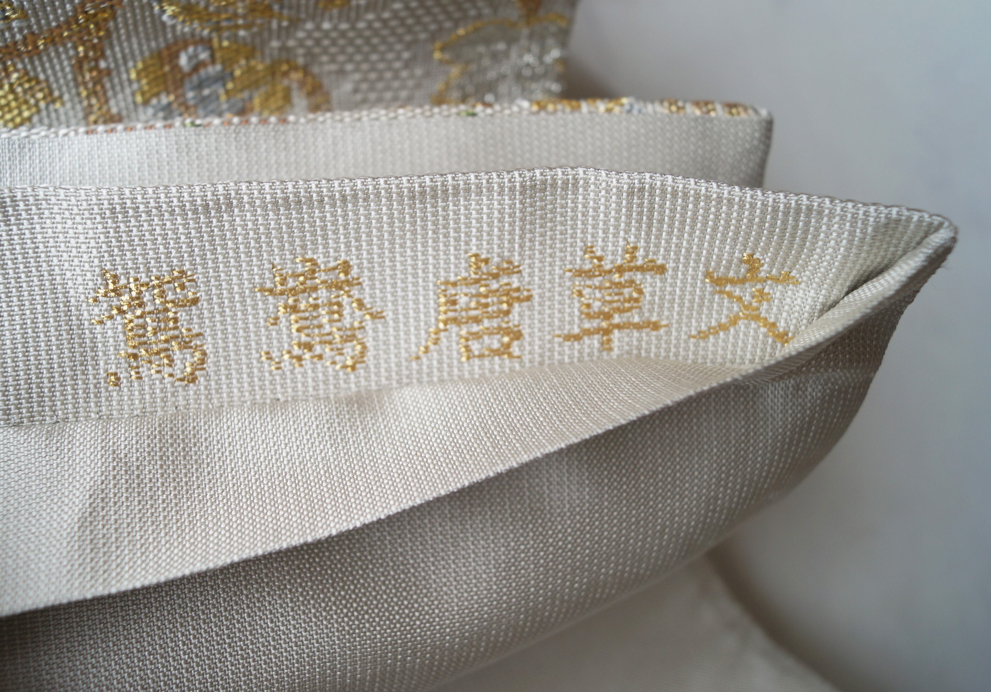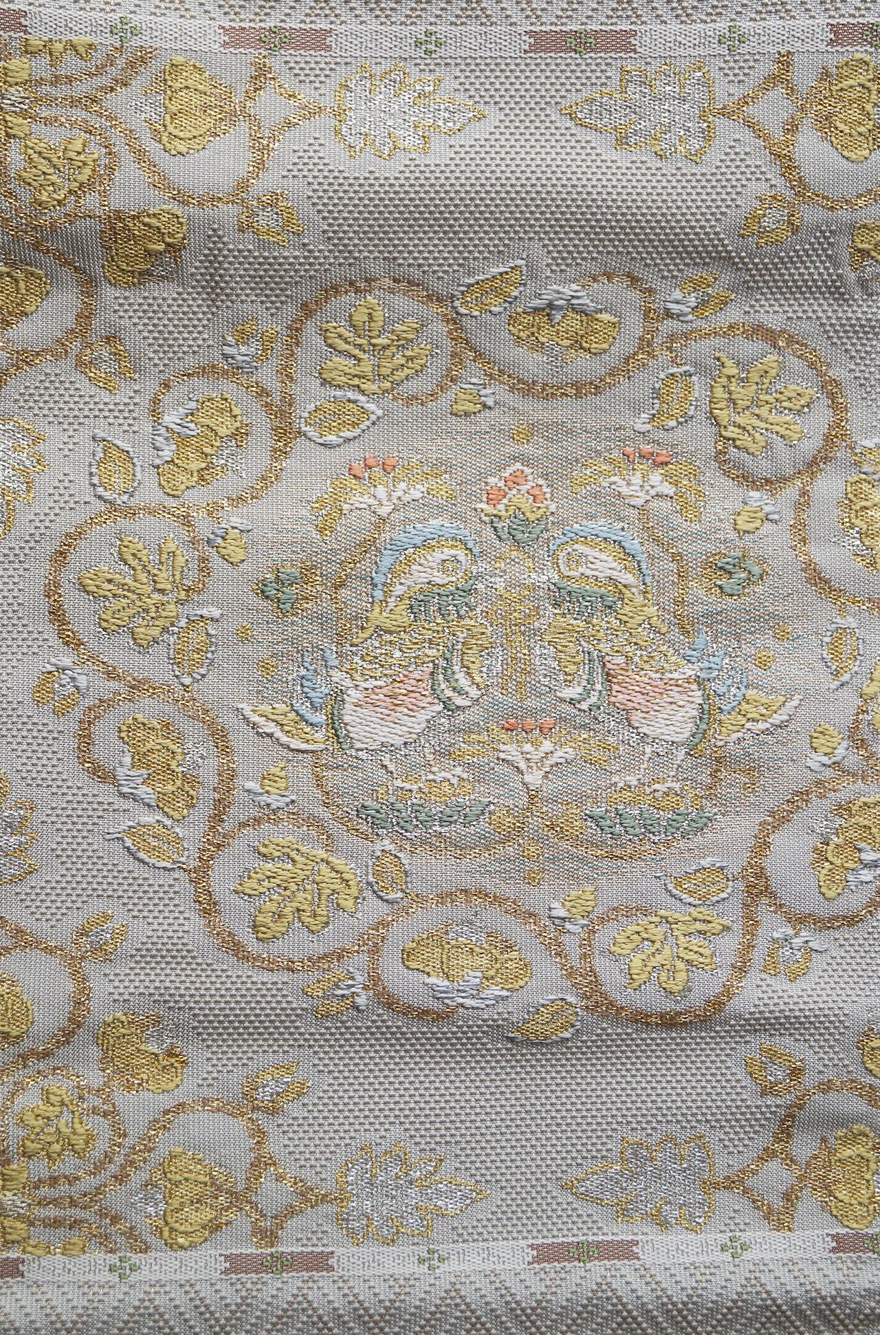 少し灰味がかった生成り地に、金糸や青磁色系