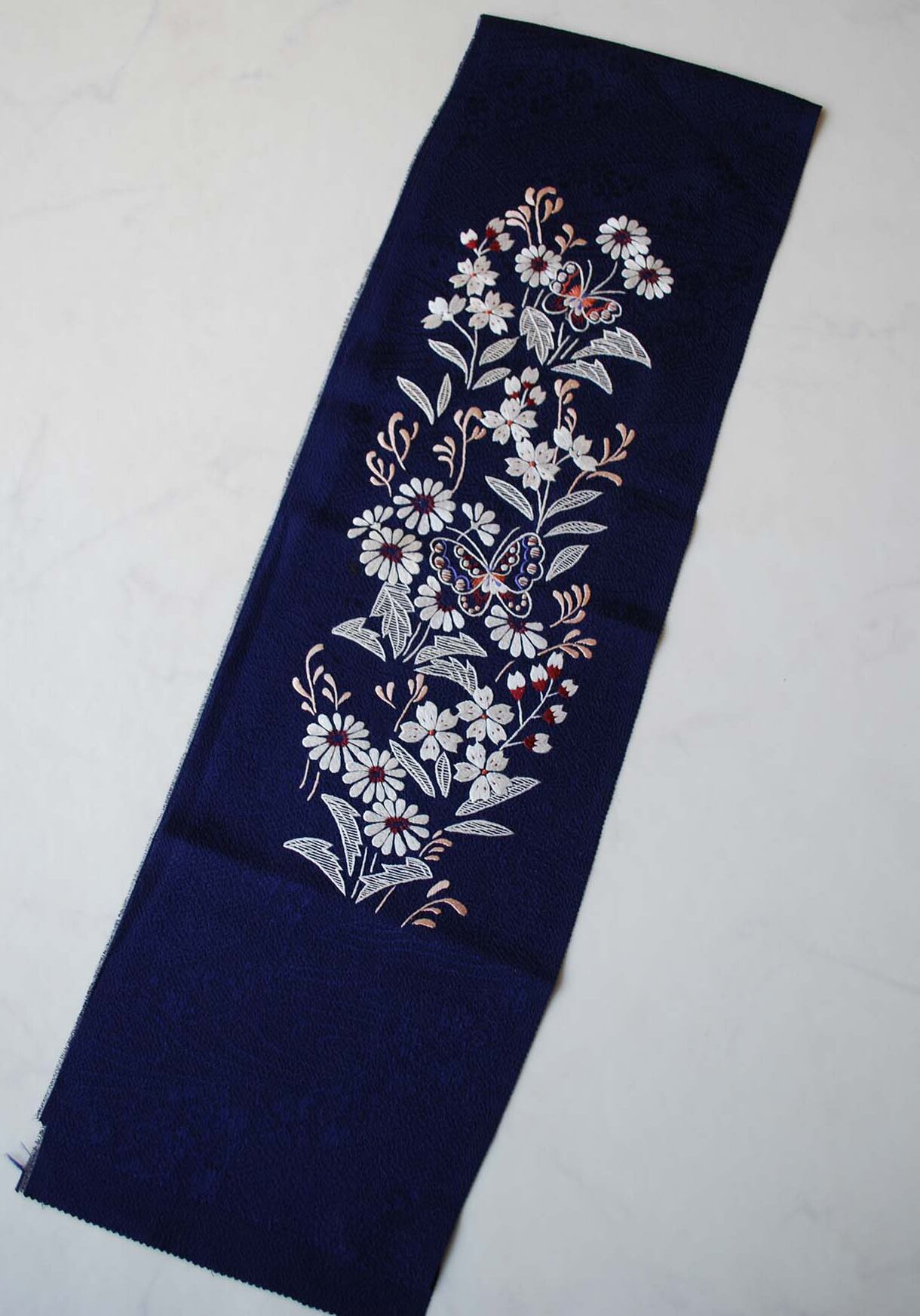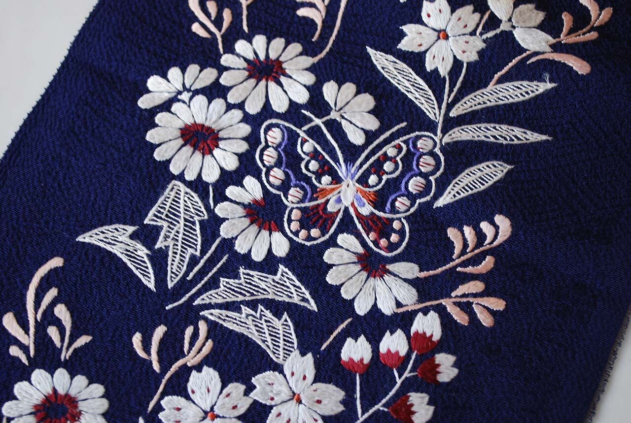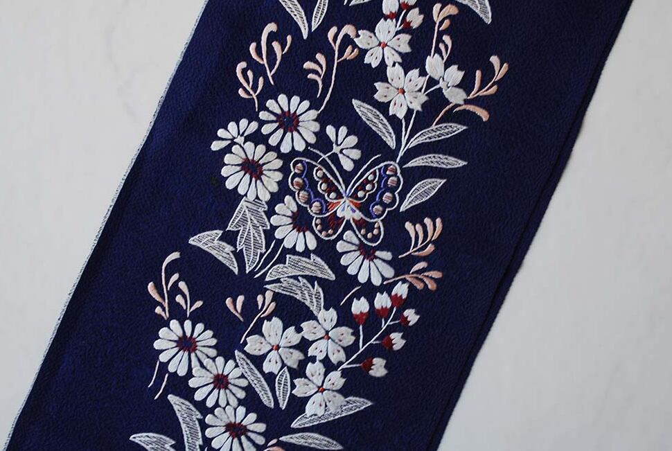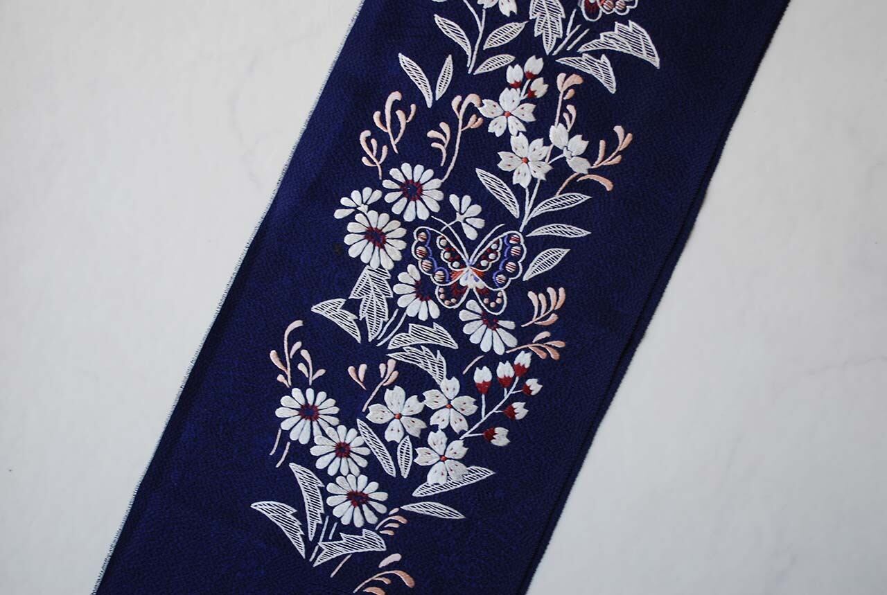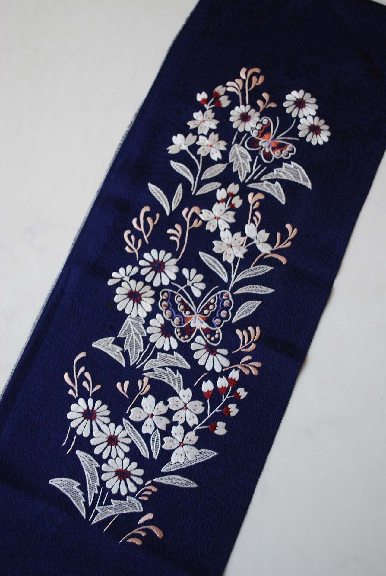 【半襟】蝶々と四季の花 手刺繍半襟 紺青地