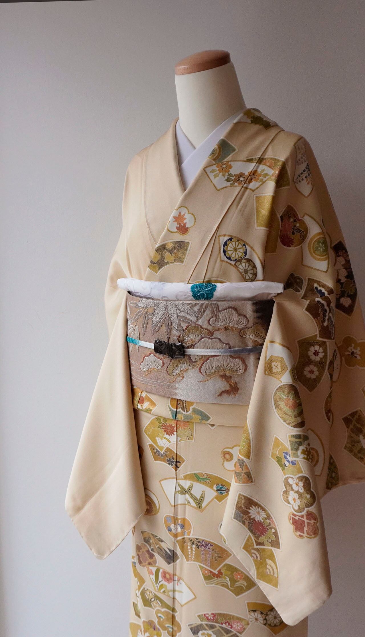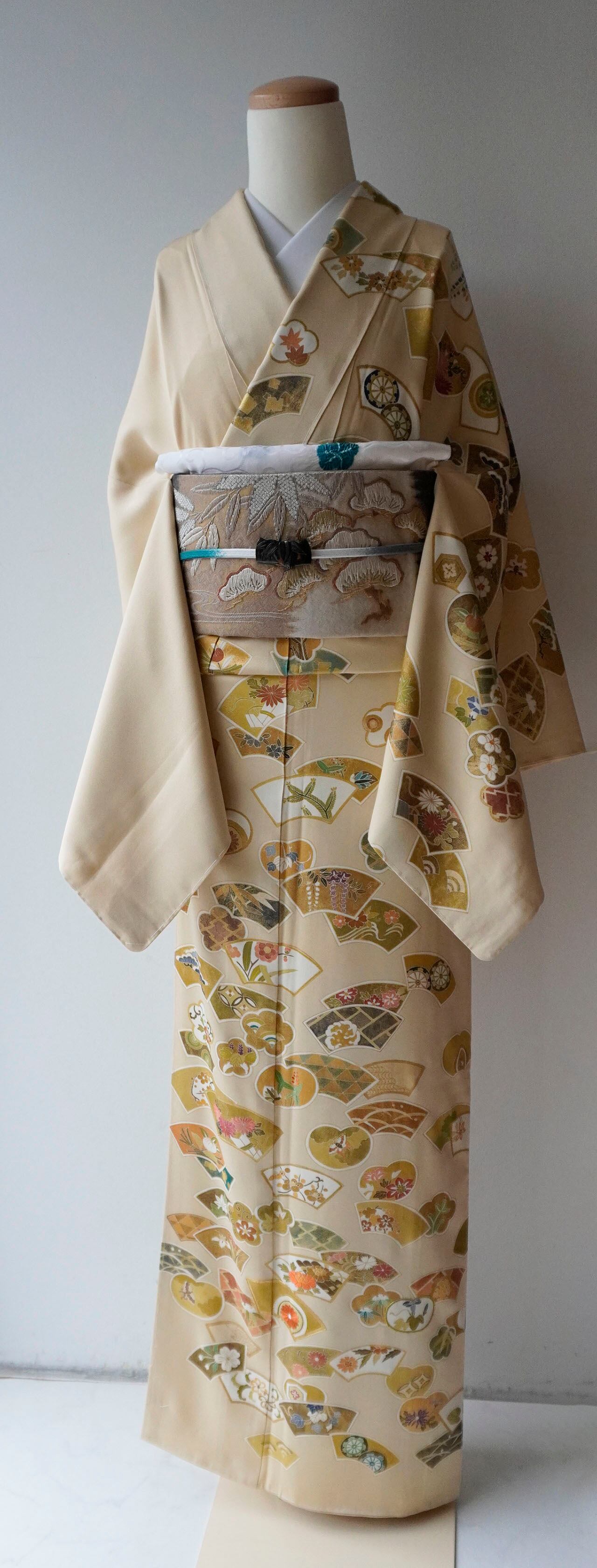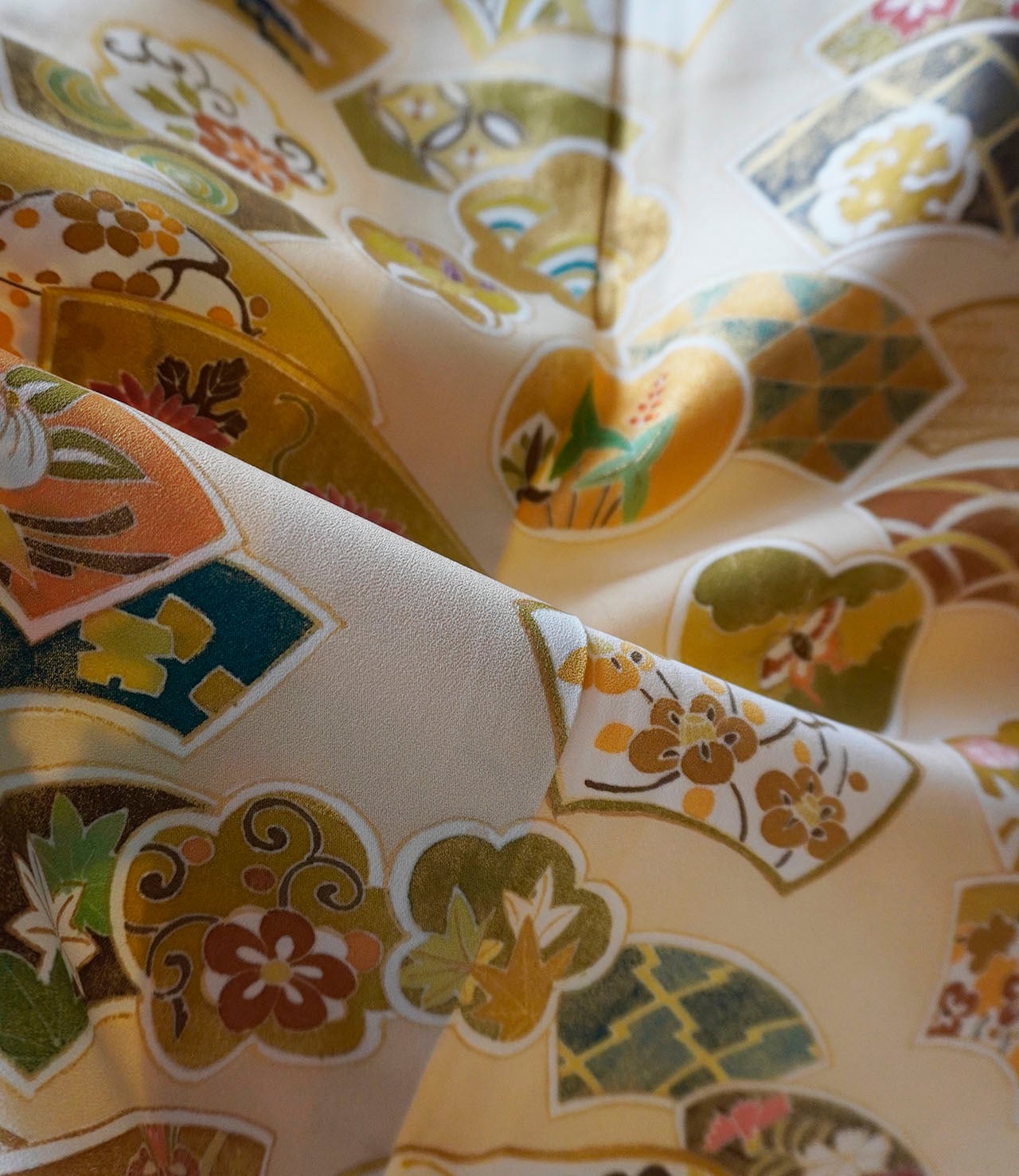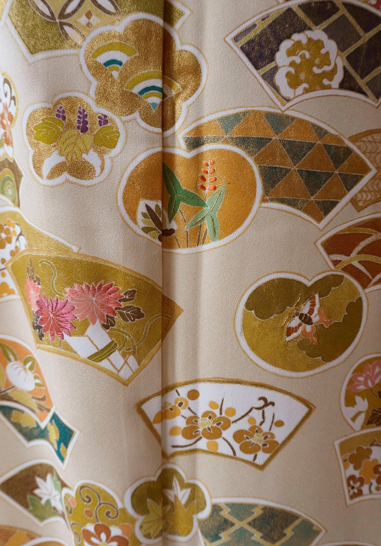 柔らかな黄褐色の地に、多彩ながら落ち着いた配色、