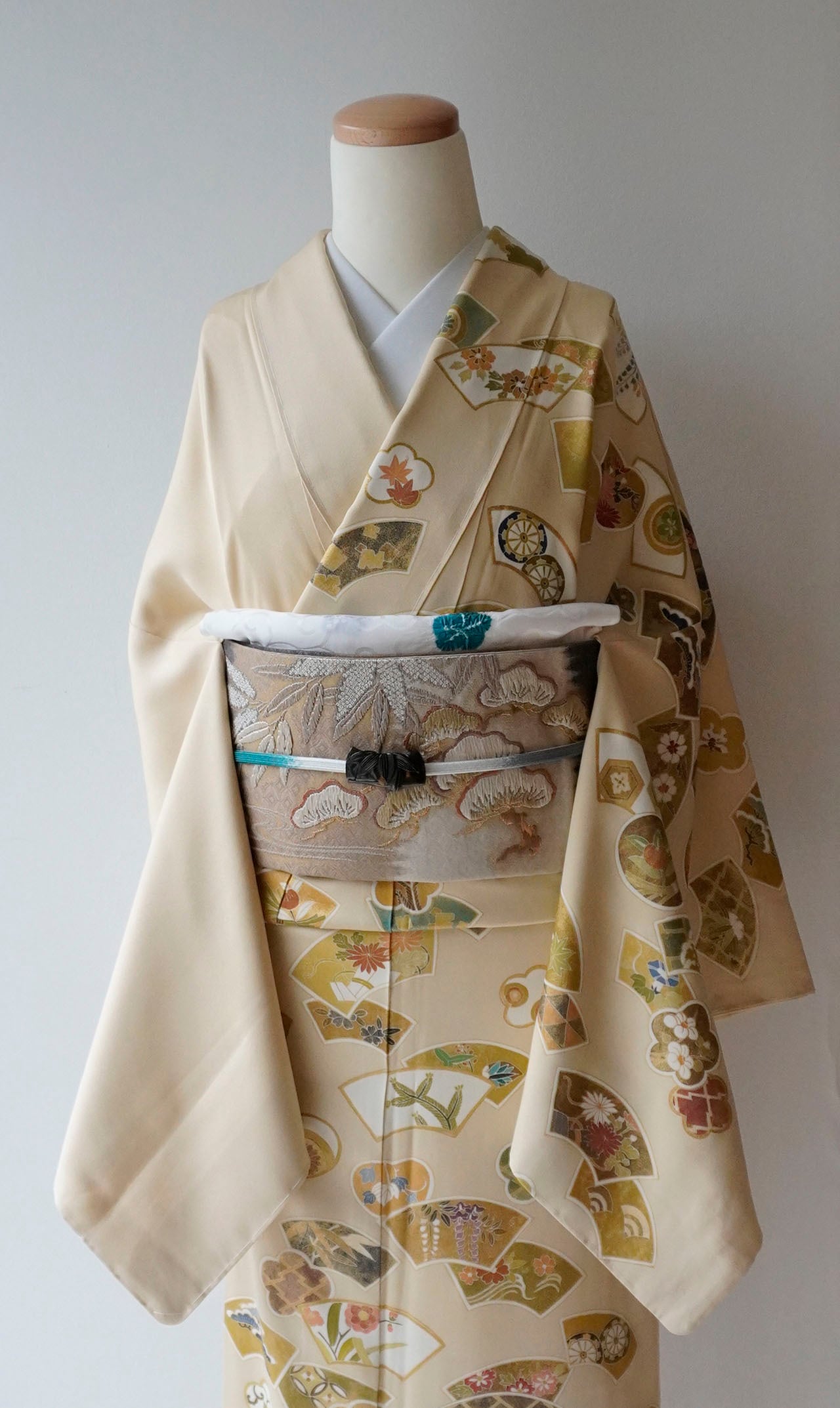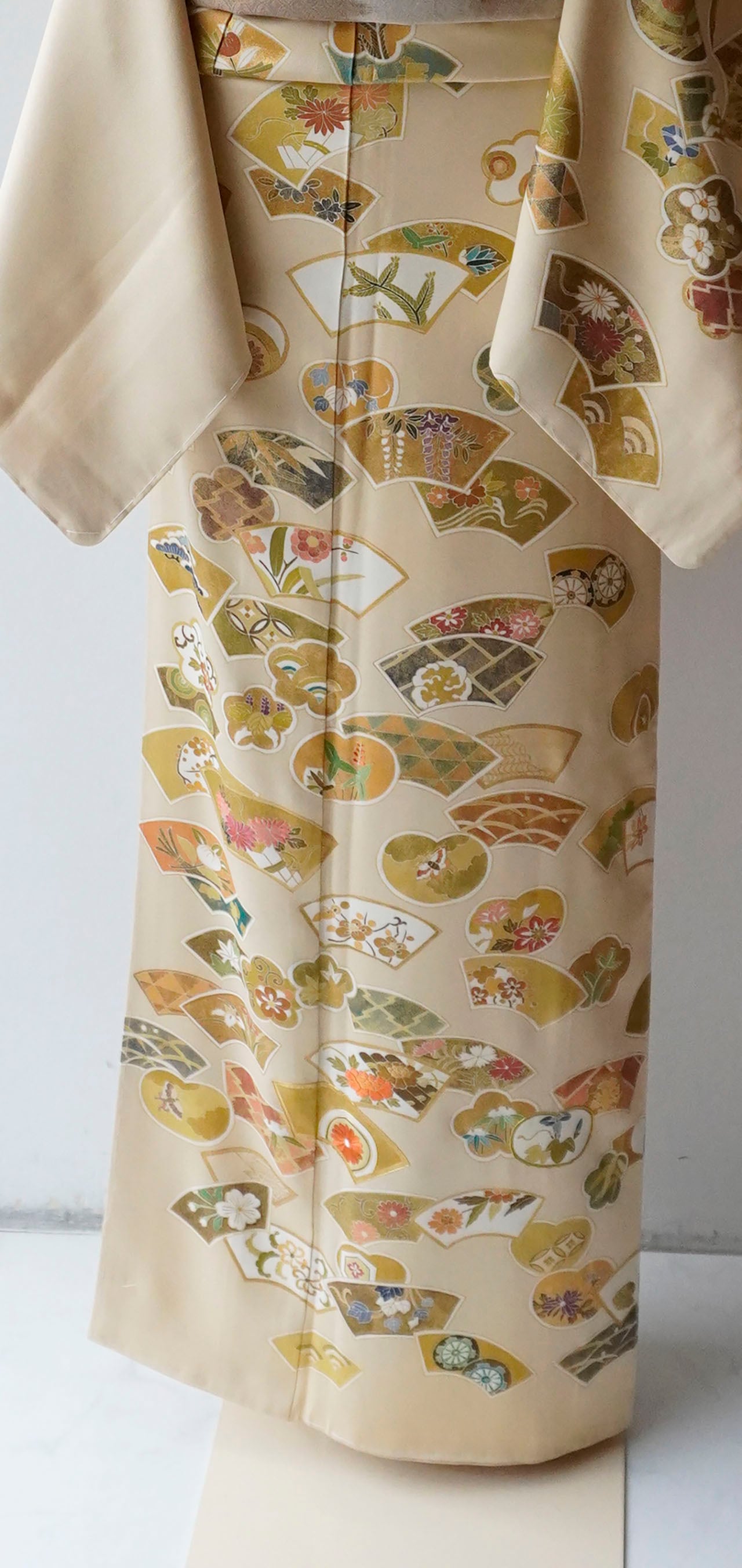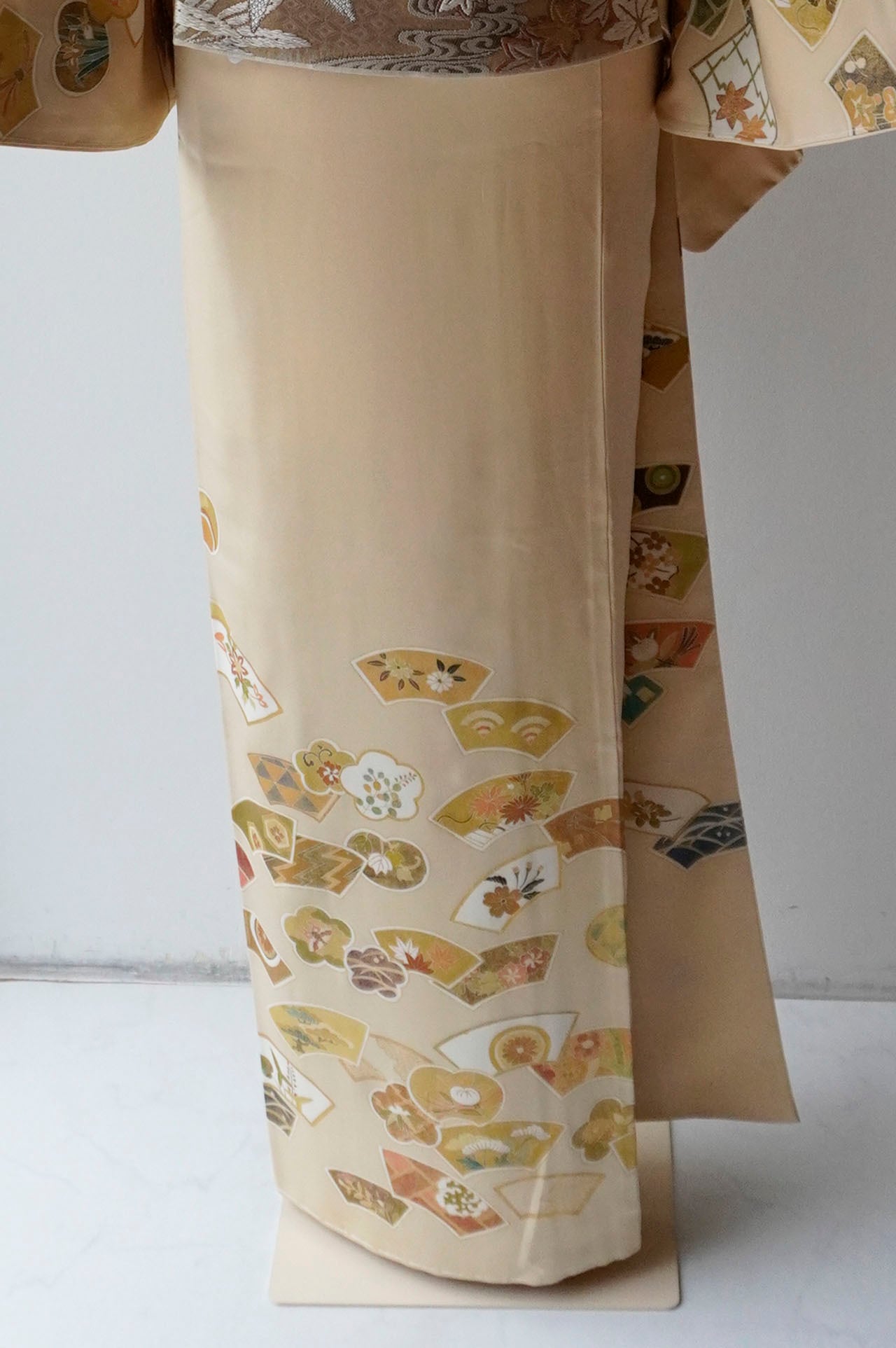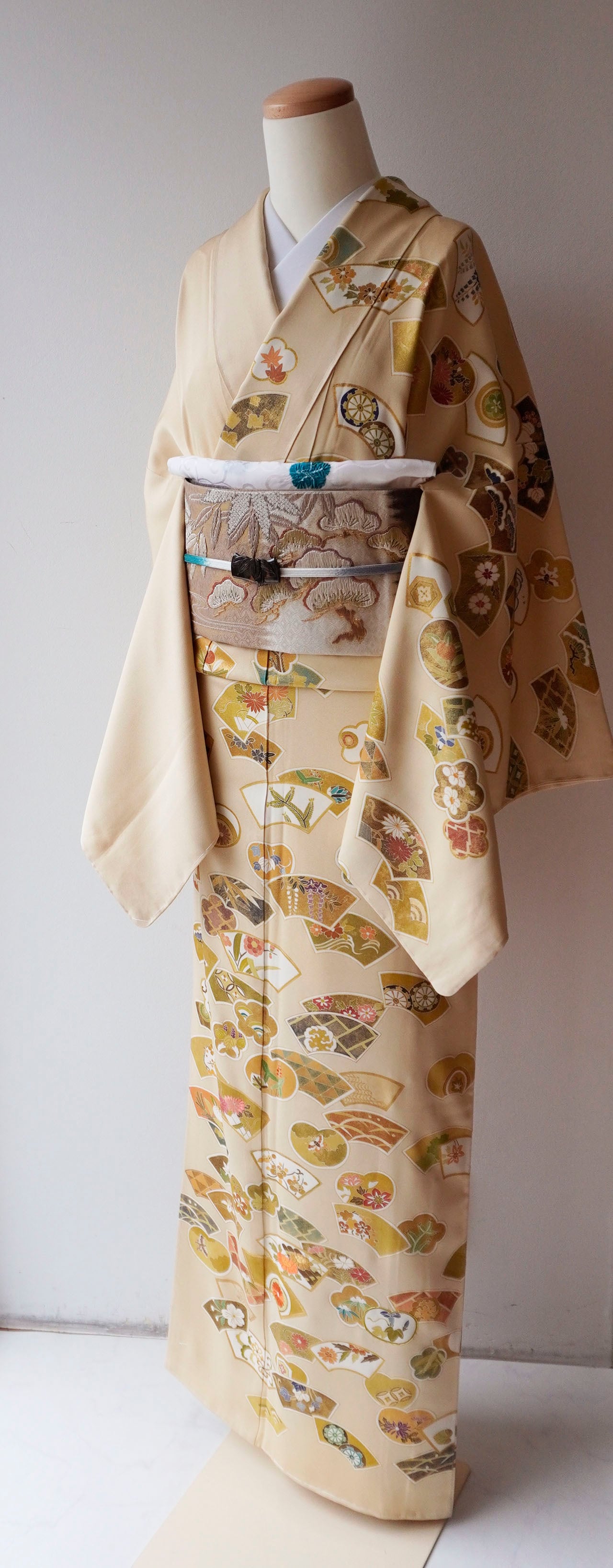 柔らかな黄褐色の地に、多彩ながら落ち着いた配色、