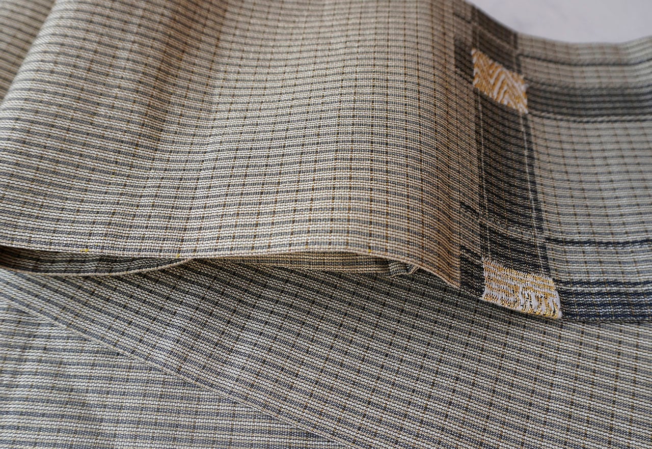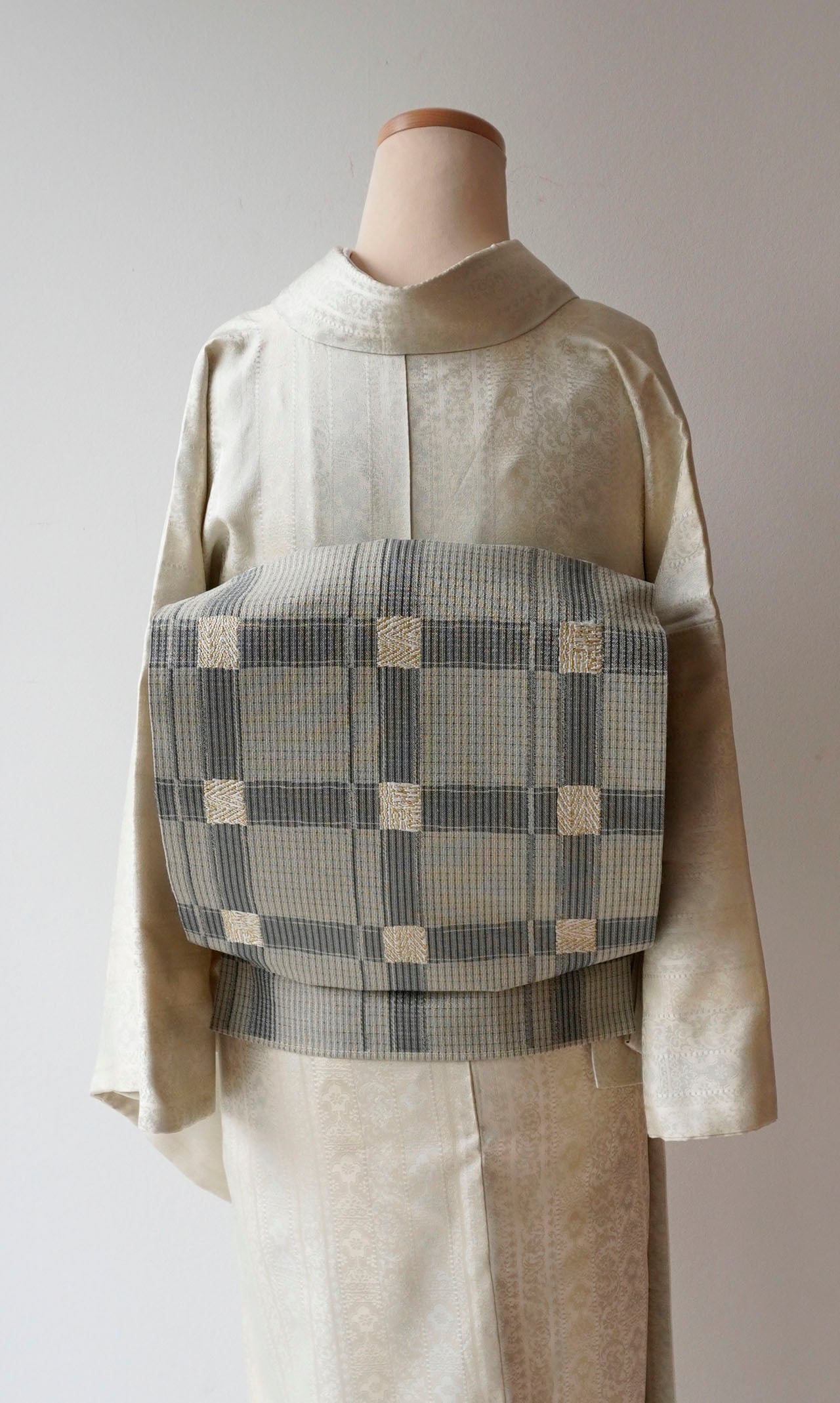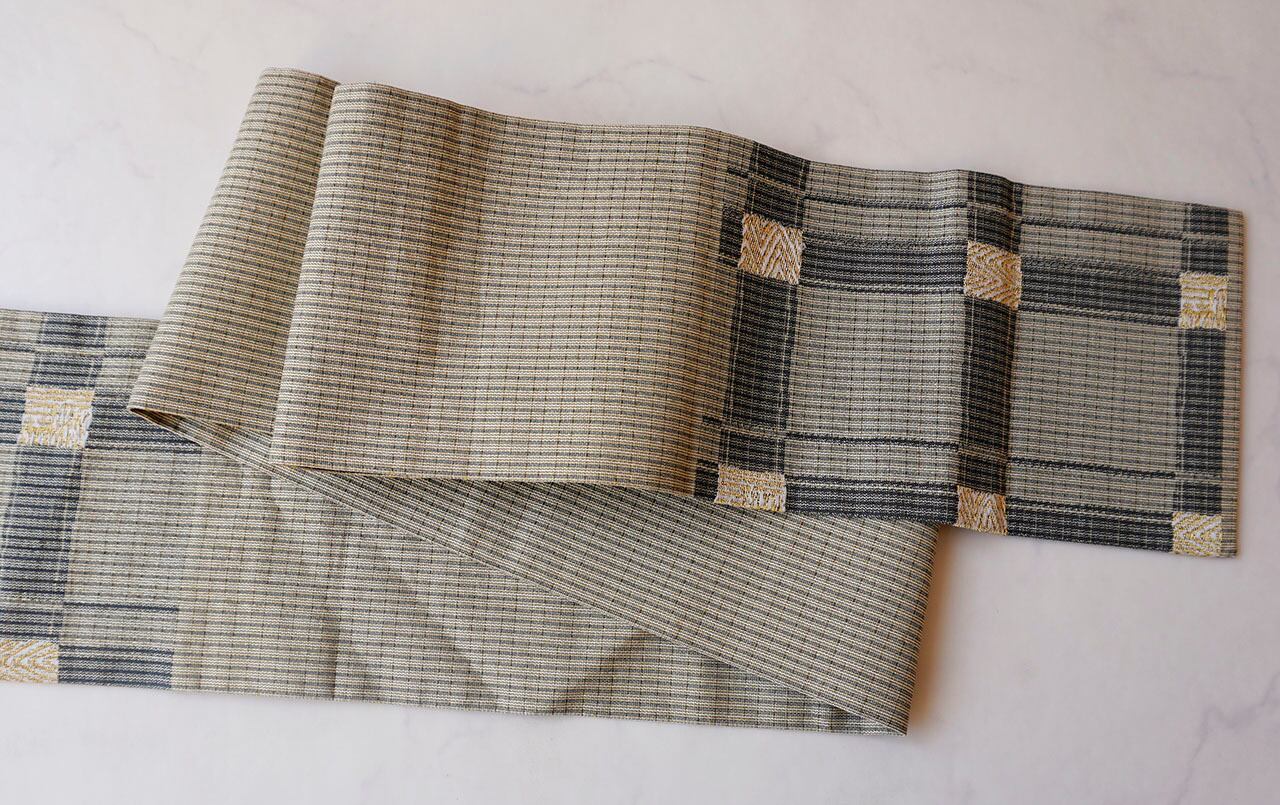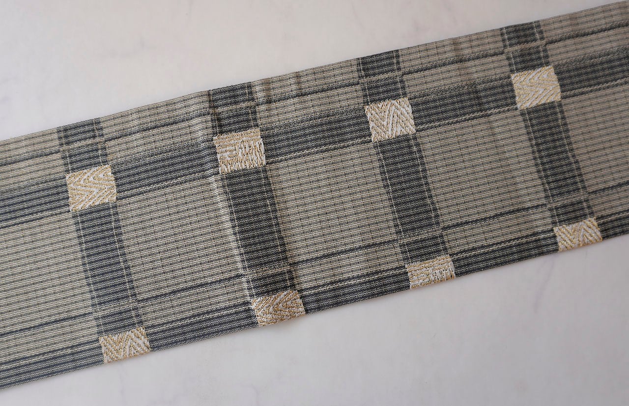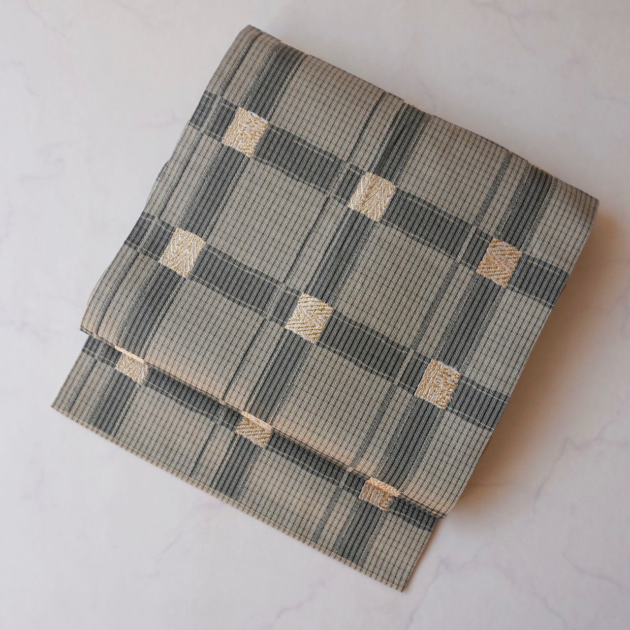 【なごや帯】絹鼠地 変わり格子文 なごや帯