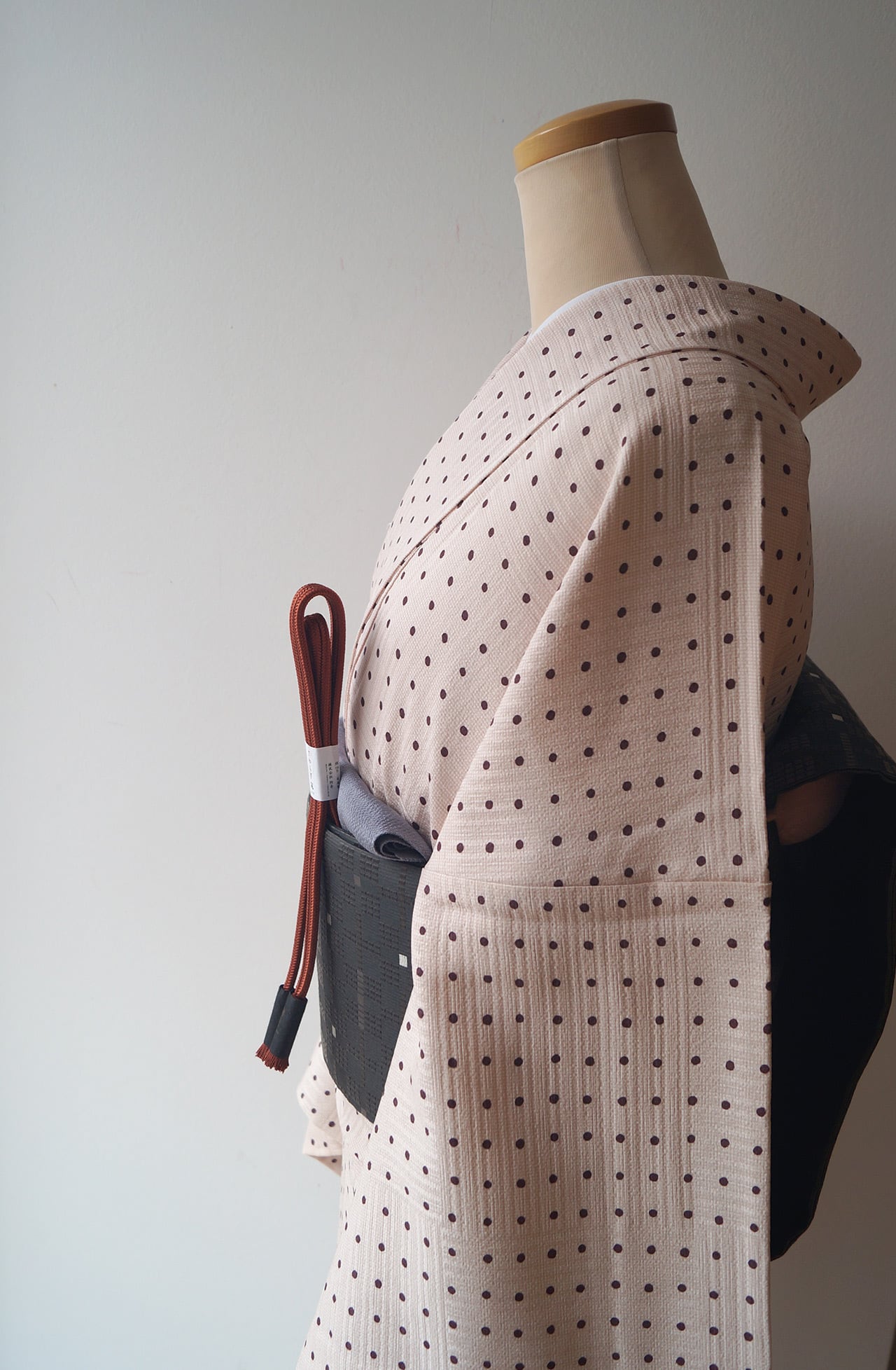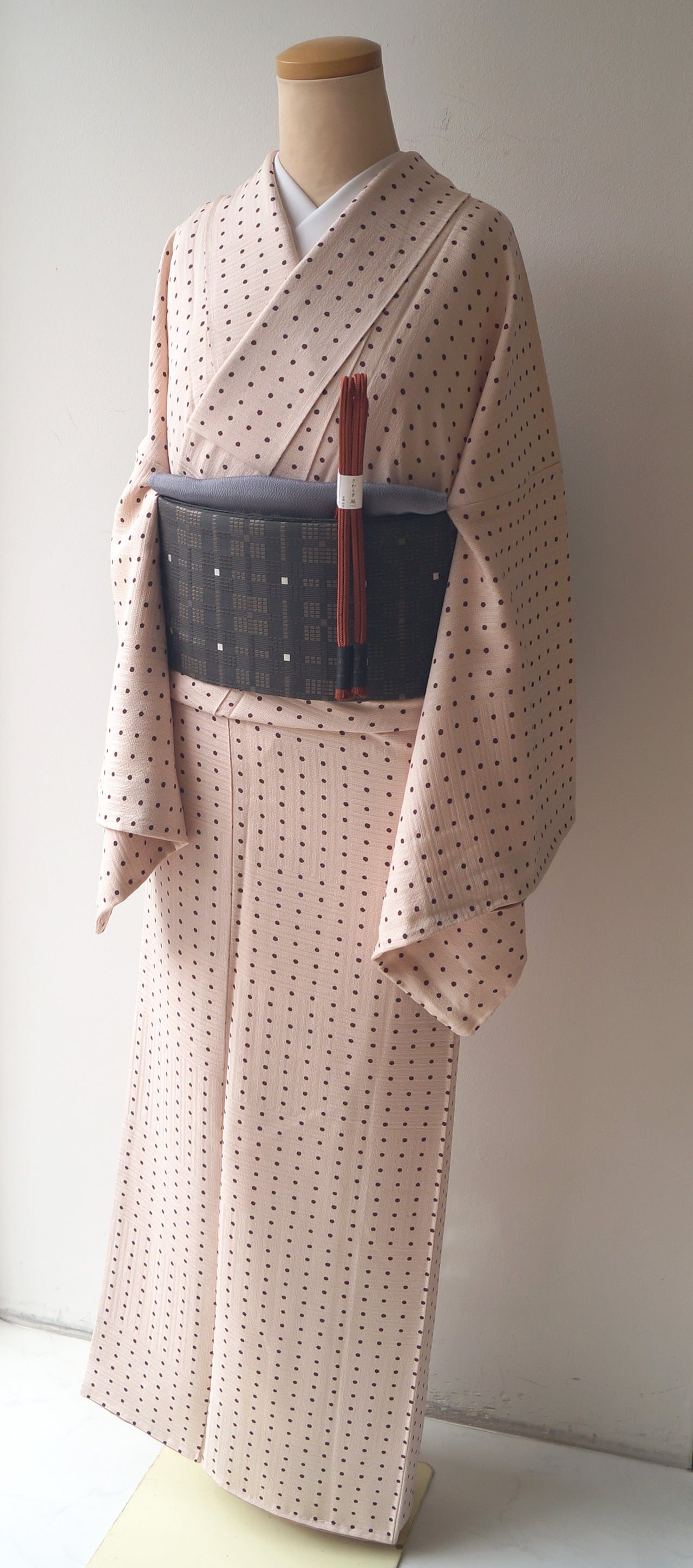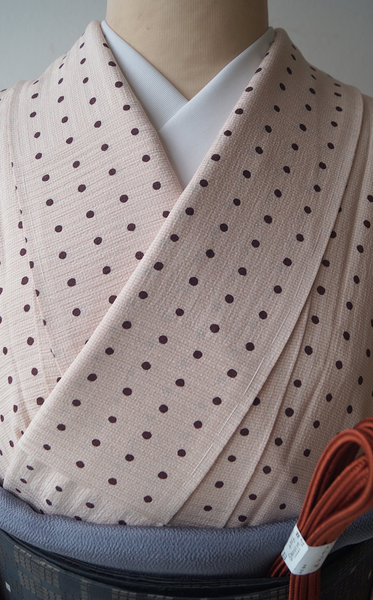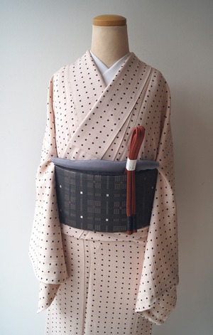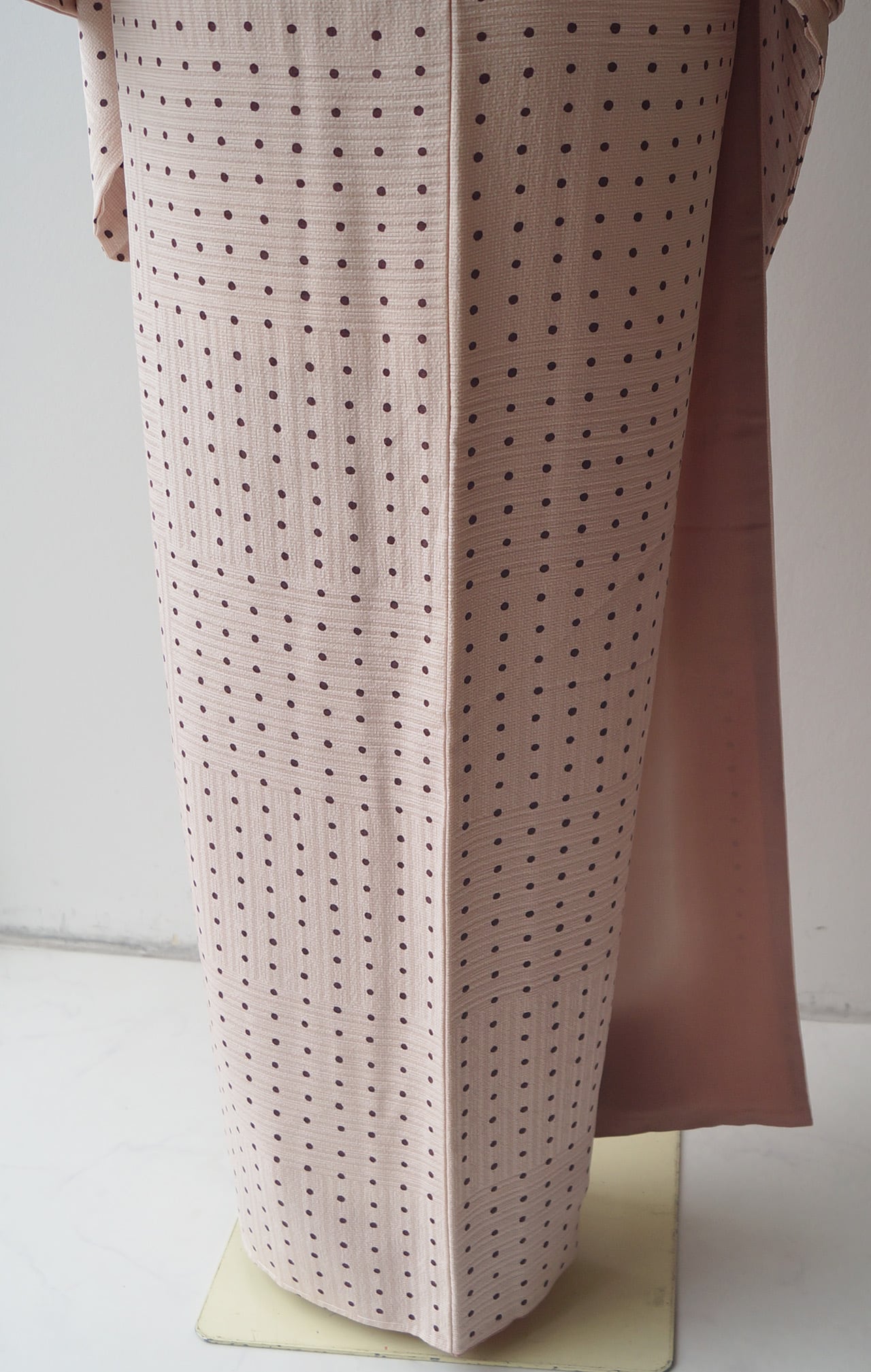 【袷】ピンクベージュ色 角通しにドット文 京友禅 小紋