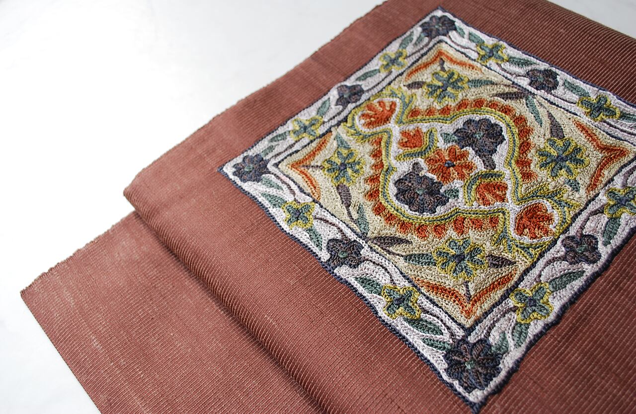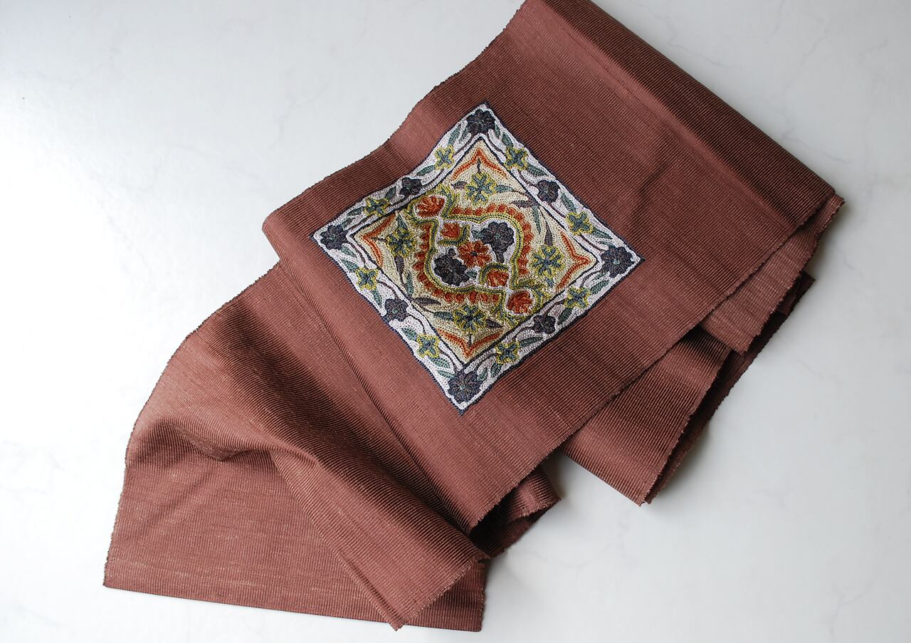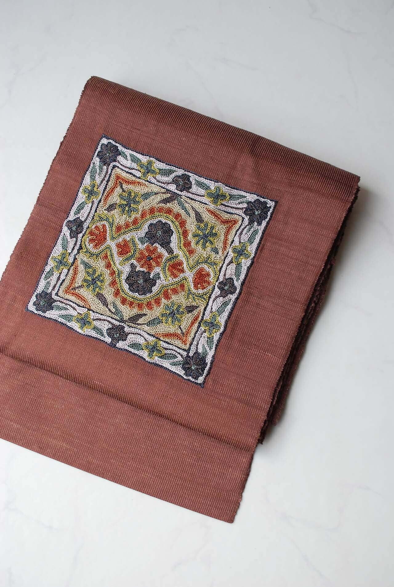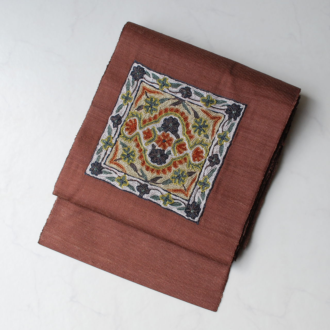 【なごや帯】貴久樹 焦茶地 アリワーク刺繍 八寸なごや帯