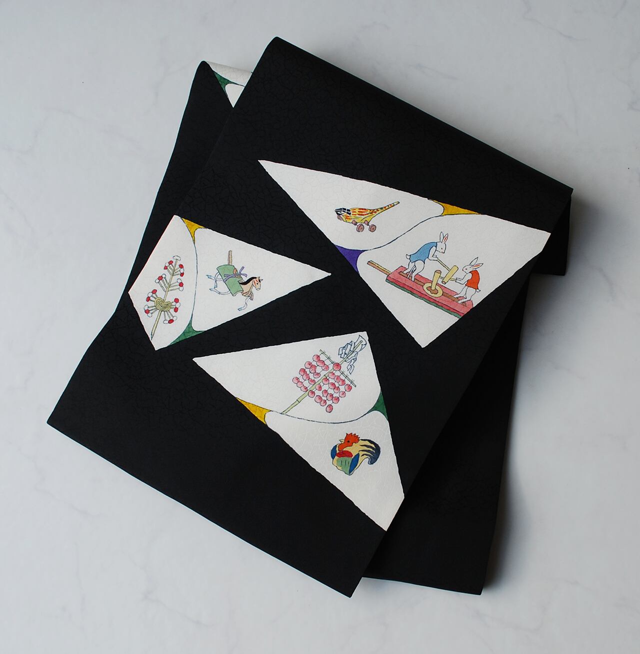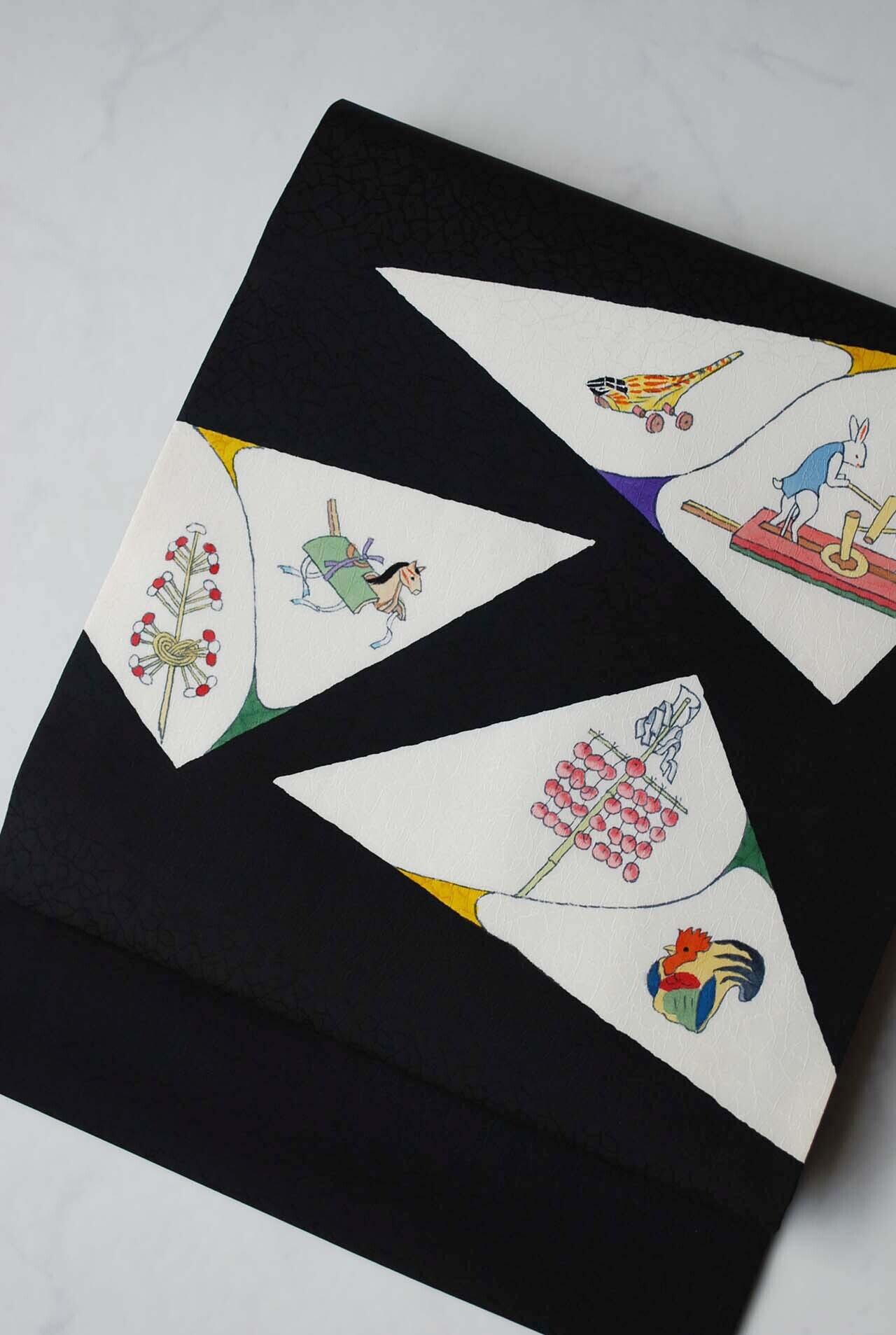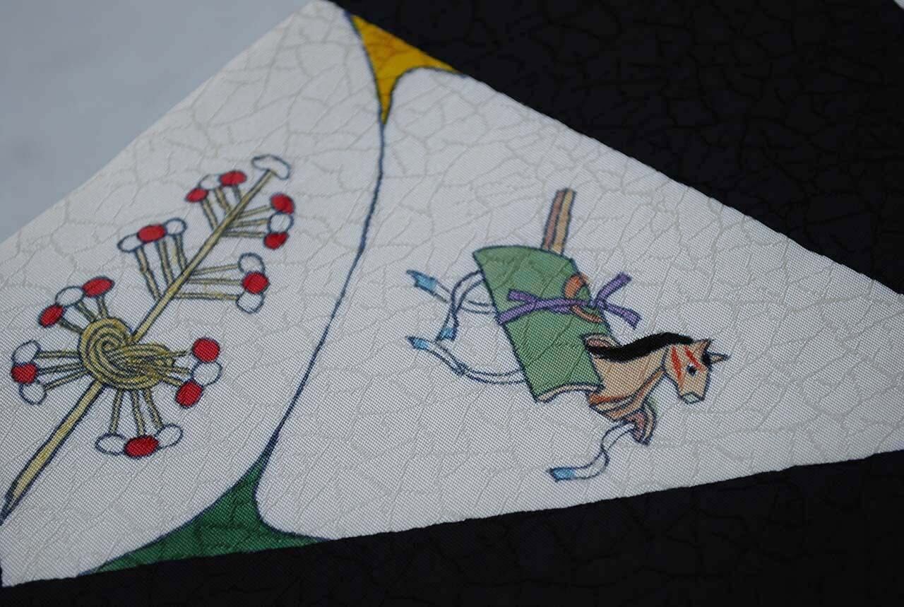 白い三角のなかには昔の玩具柄が