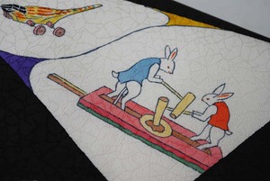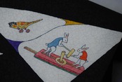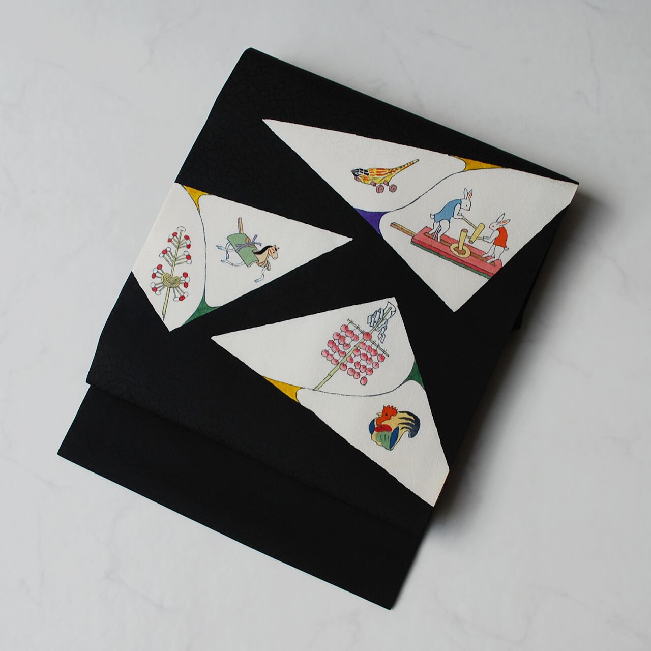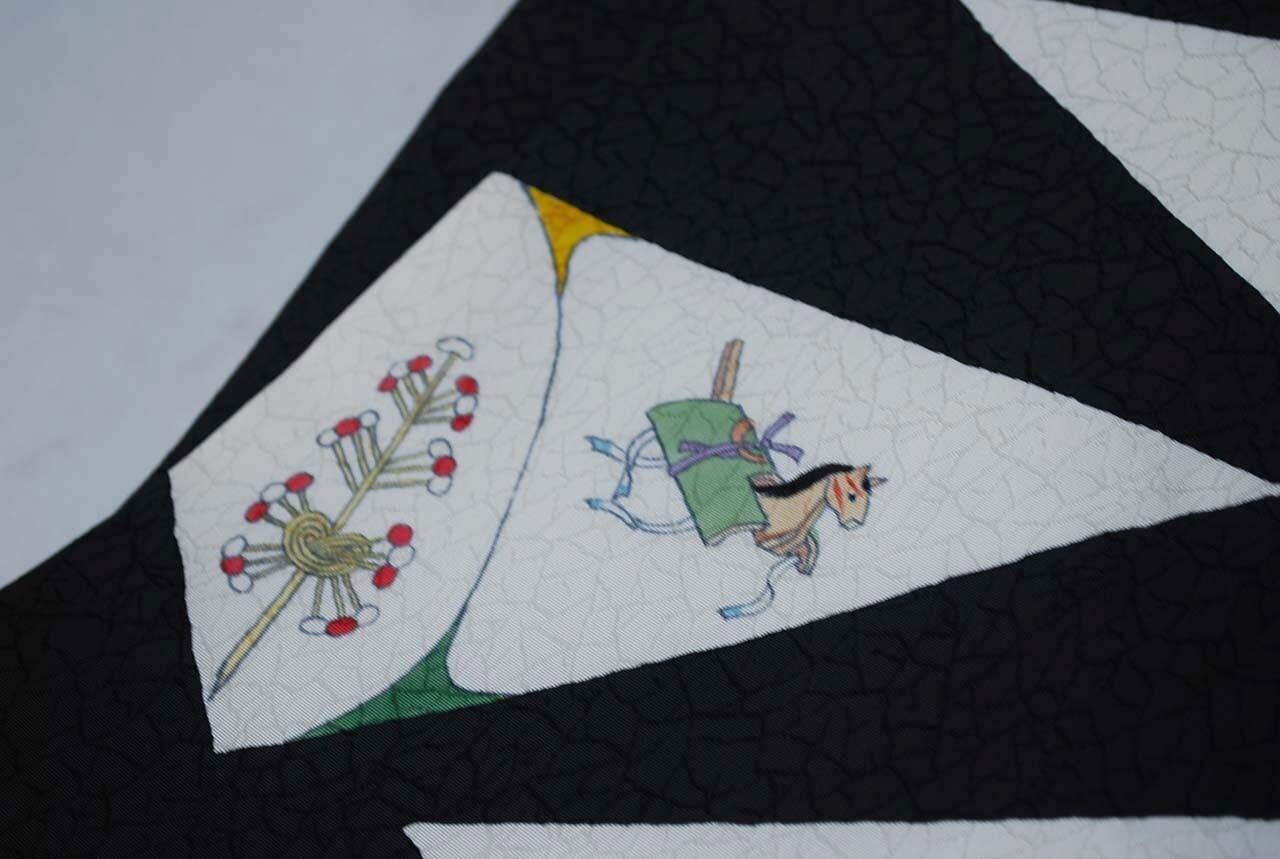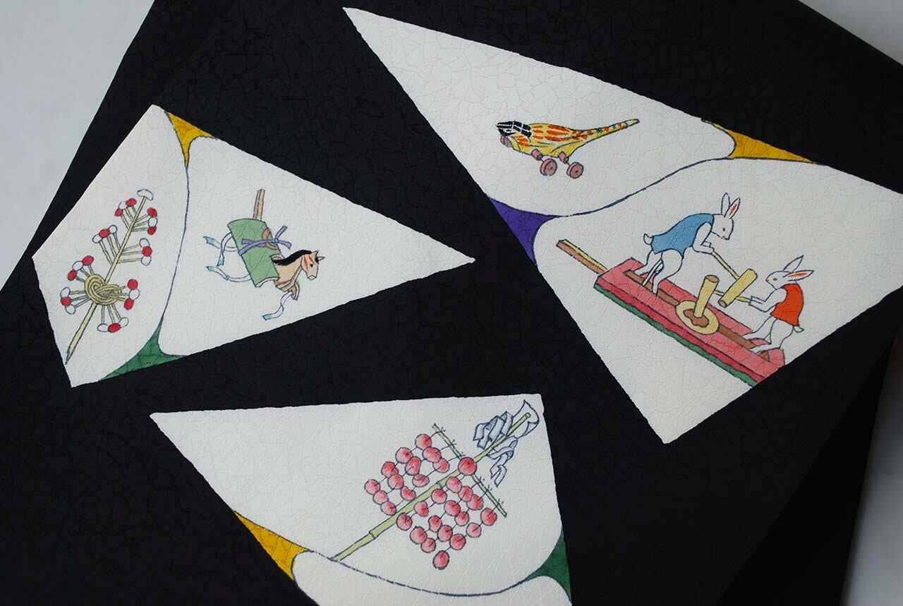 白い三角のなかには昔の玩具柄が