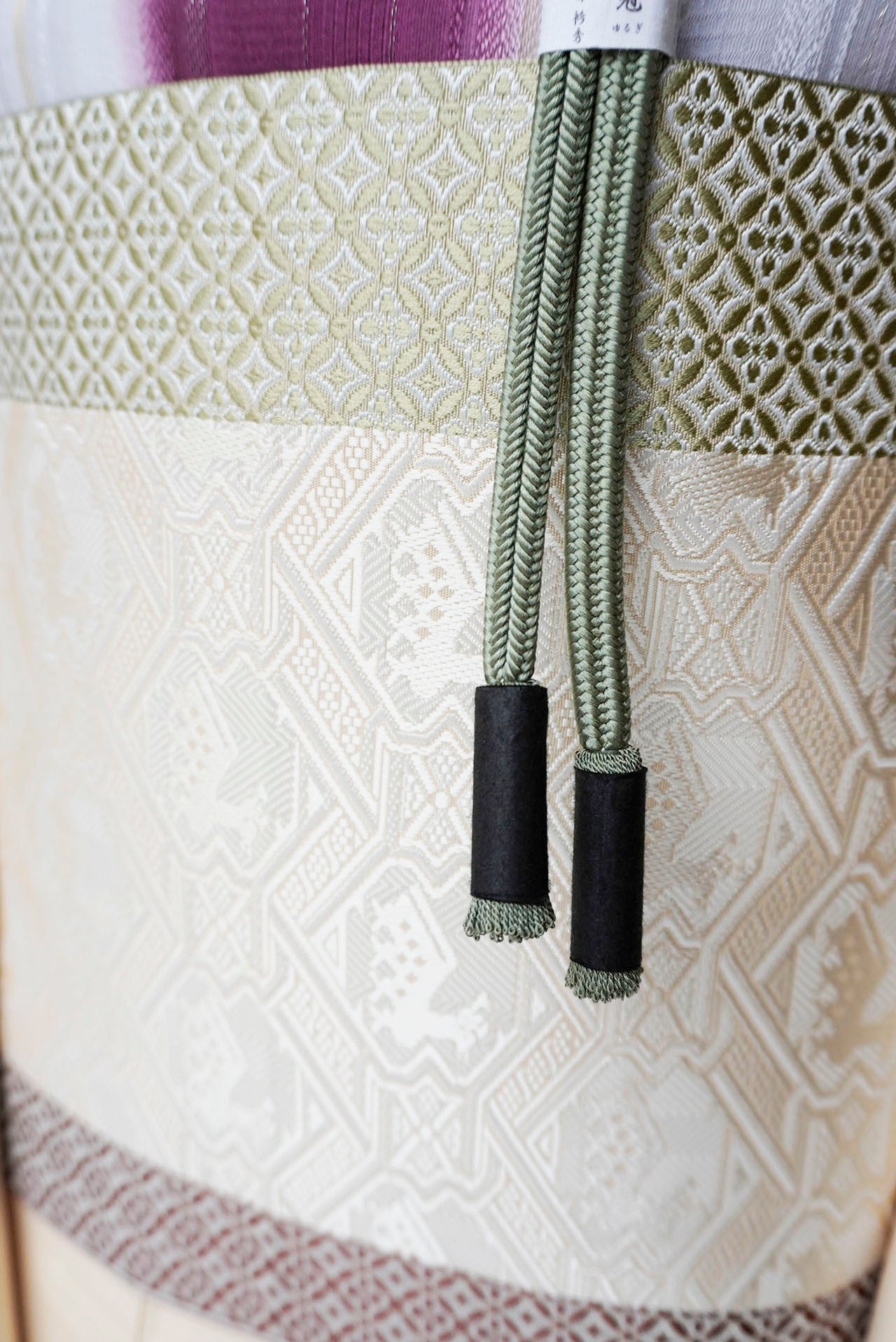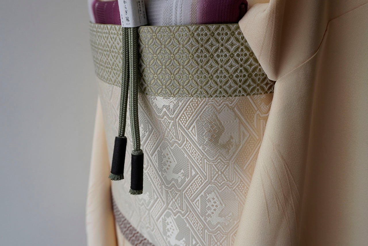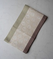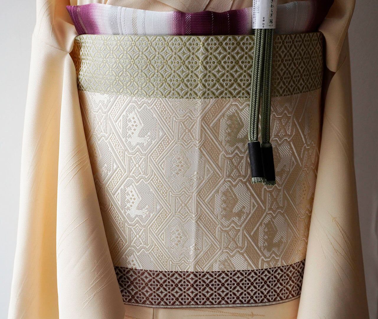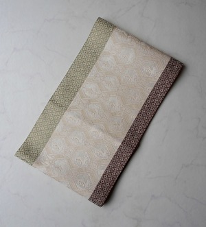 柳茶色と小豆色の七宝文が両脇を彩ります。