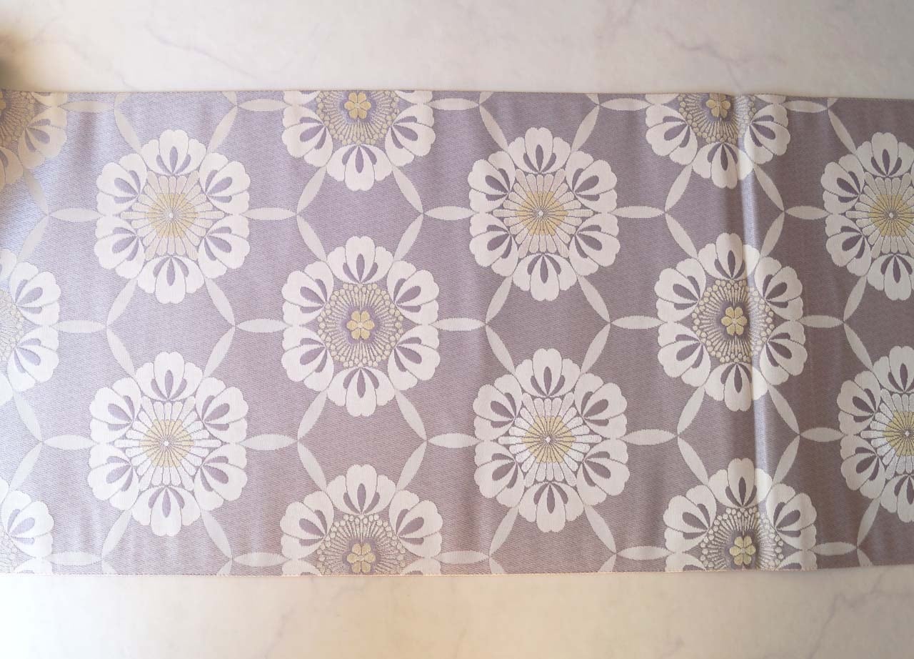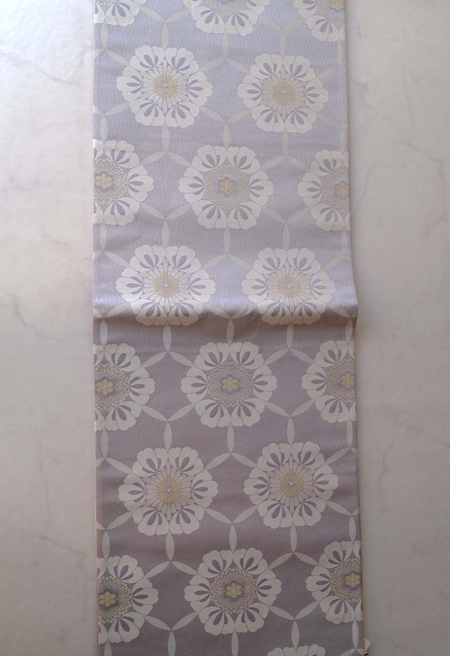 【ふくろ帯】暁鼠色 亀甲六花 有職文様 経錦ふくろ帯