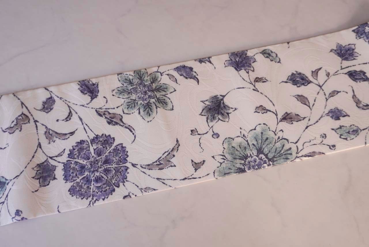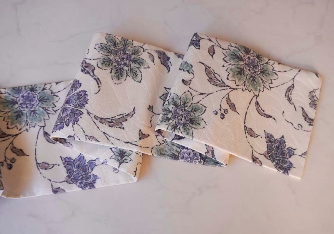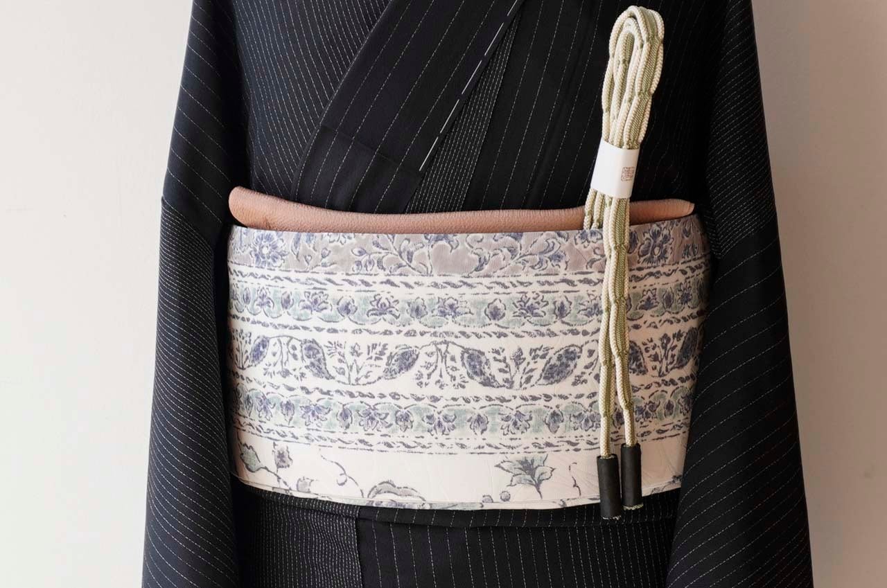 白地に唐花間道が染められたなごや帯です。