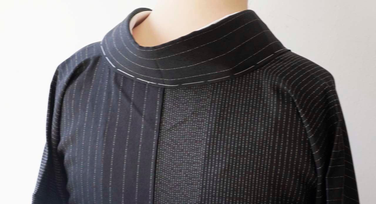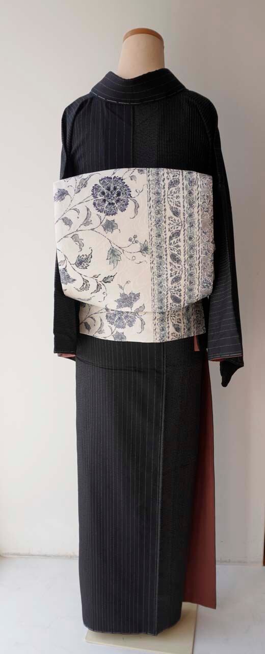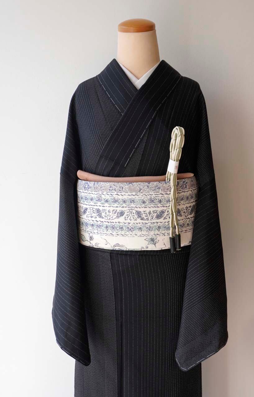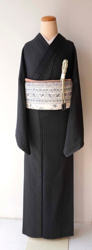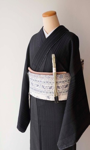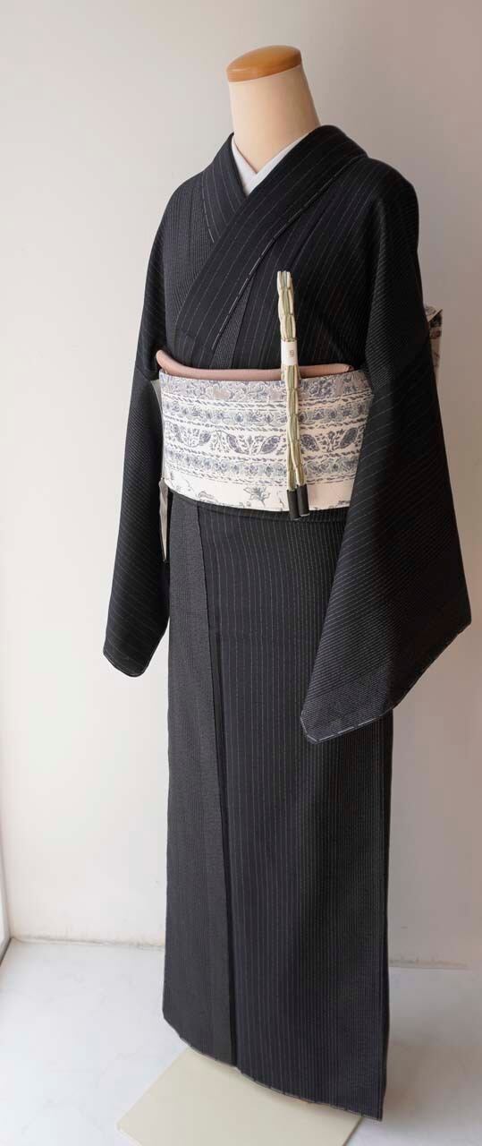 【袷】黒色地 縞文 本塩沢 やまだ織証紙付き