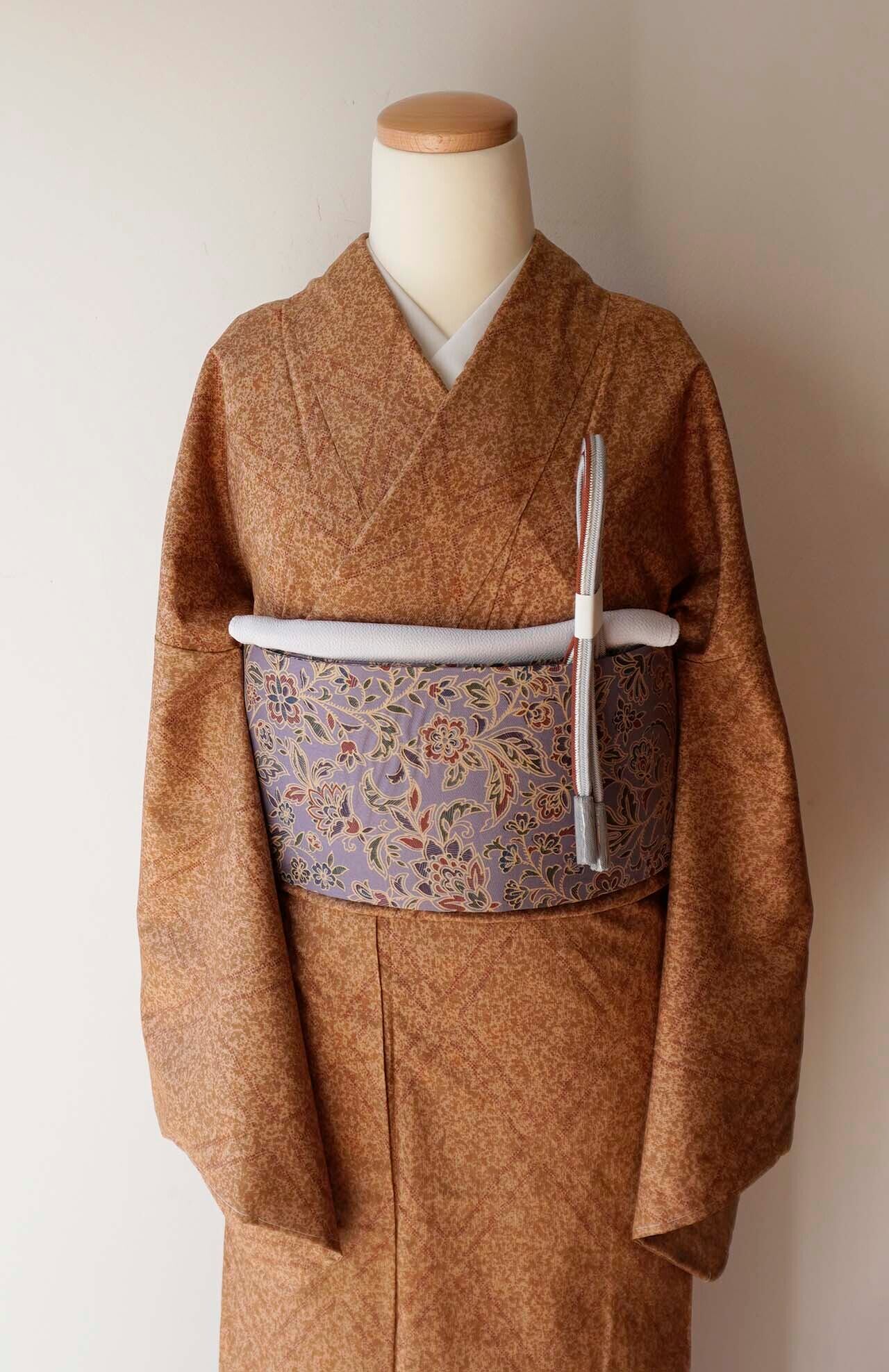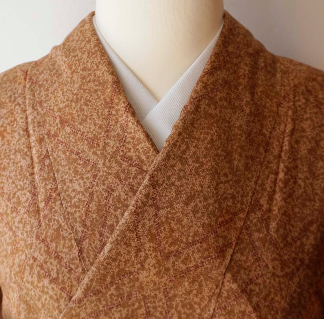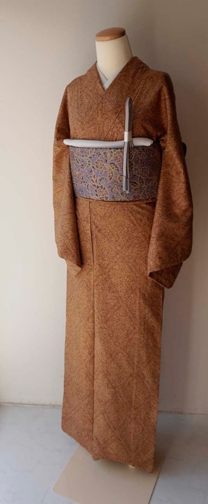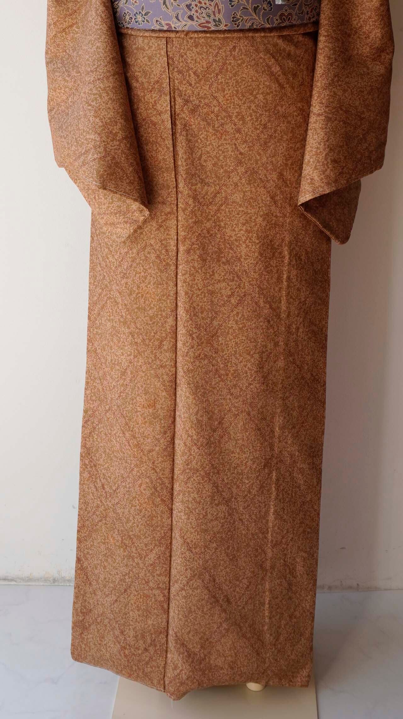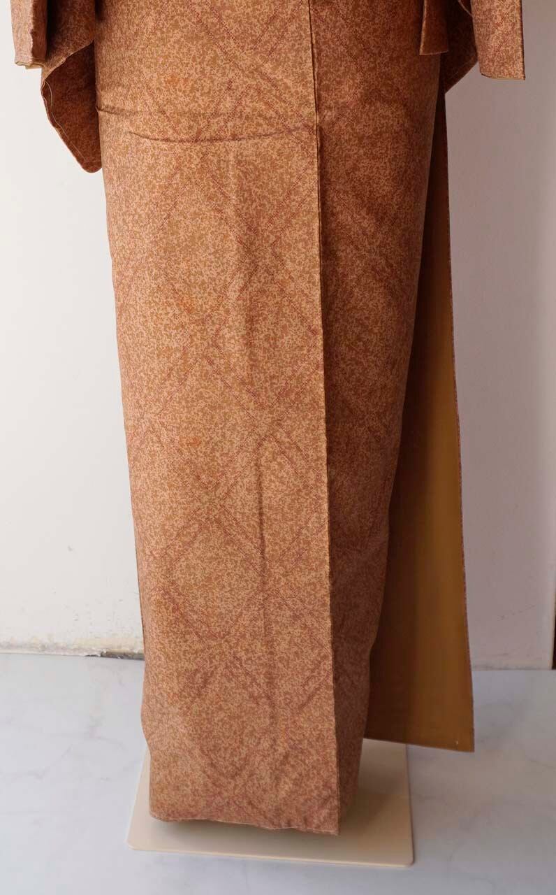 【袷】杏色×枇杷茶地 菱文 大島紬・証紙付き