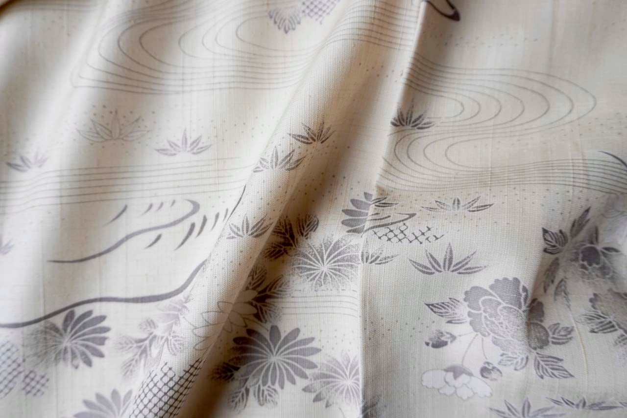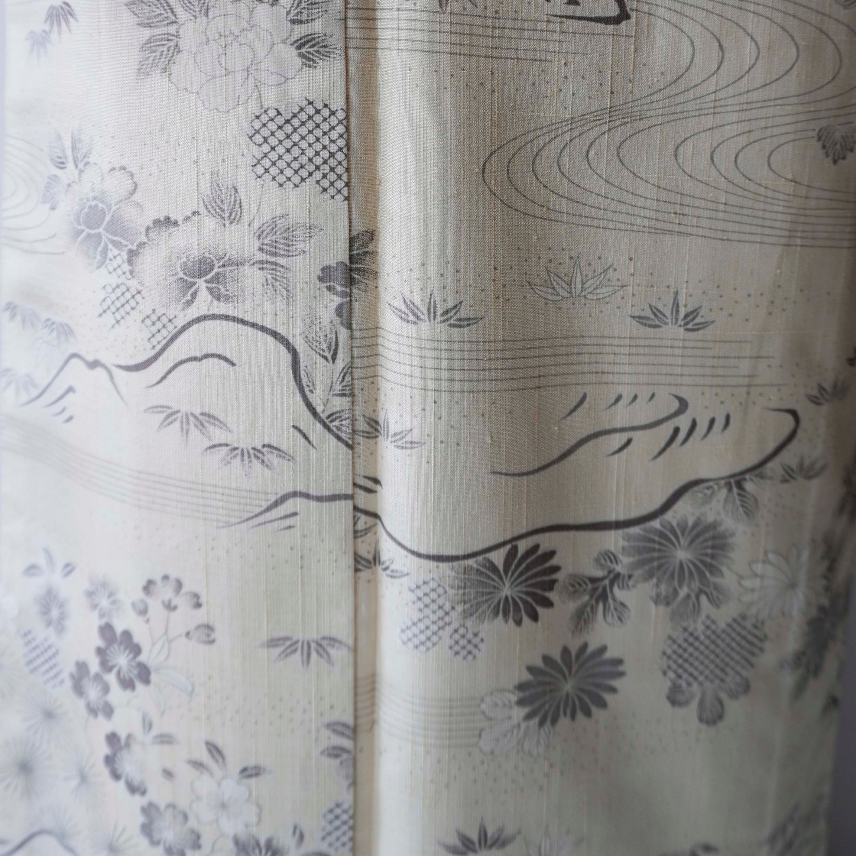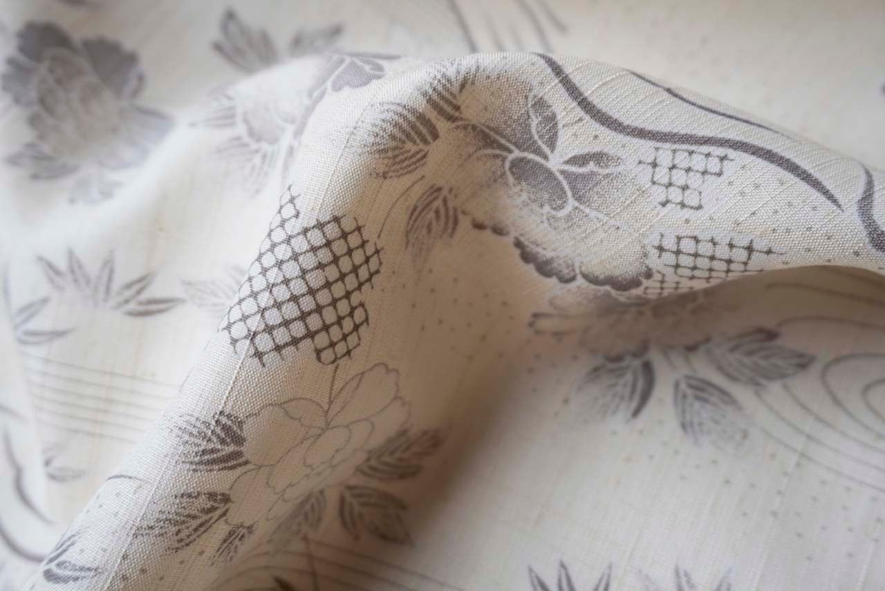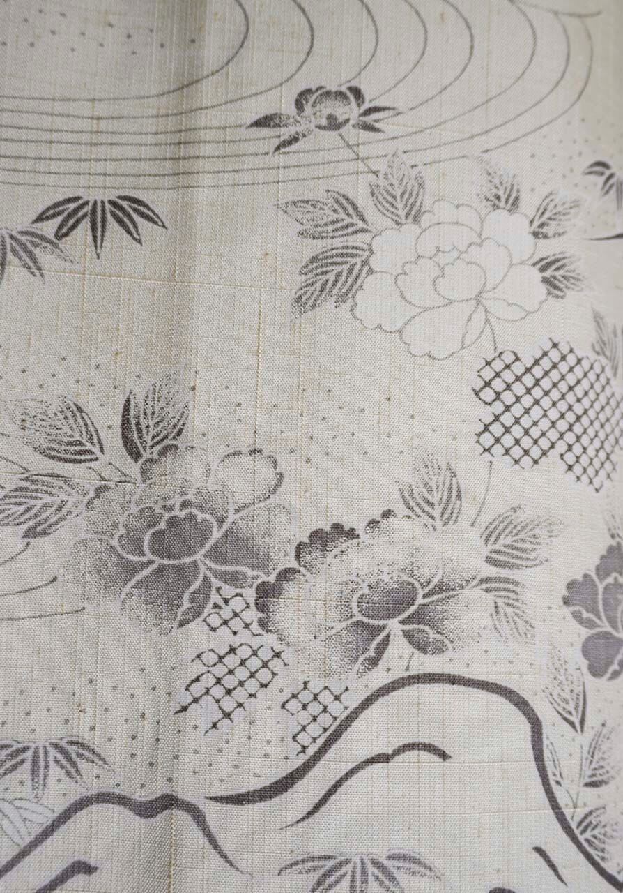 【袷】練色地 四季花風景文 生紬