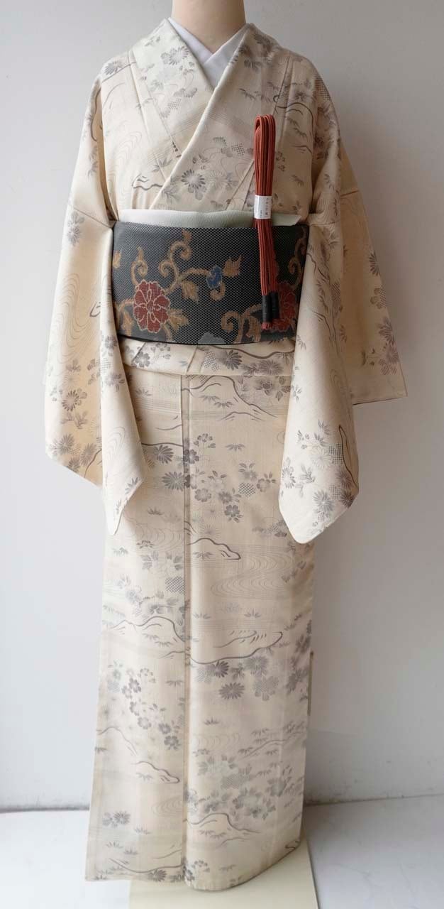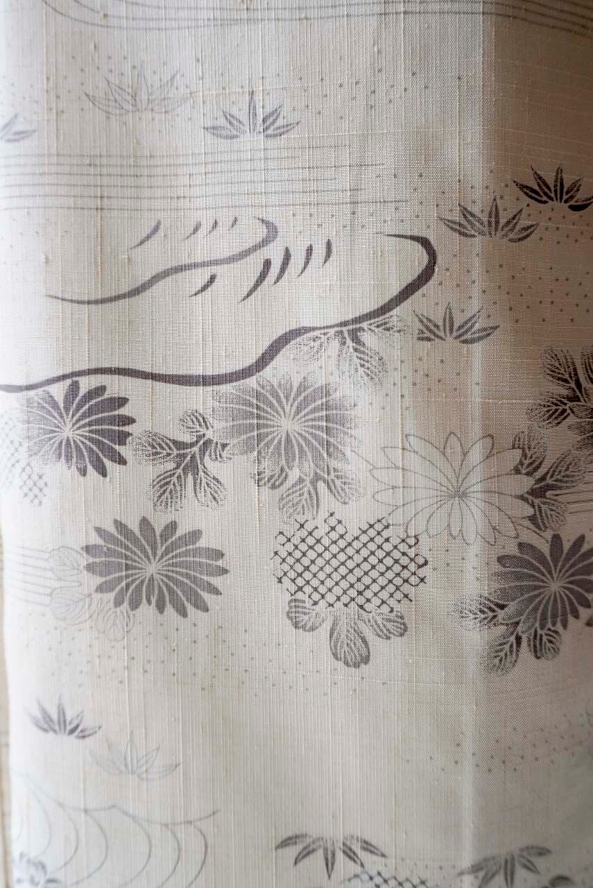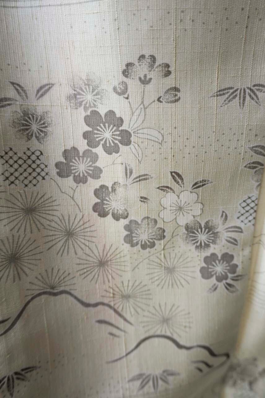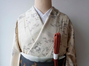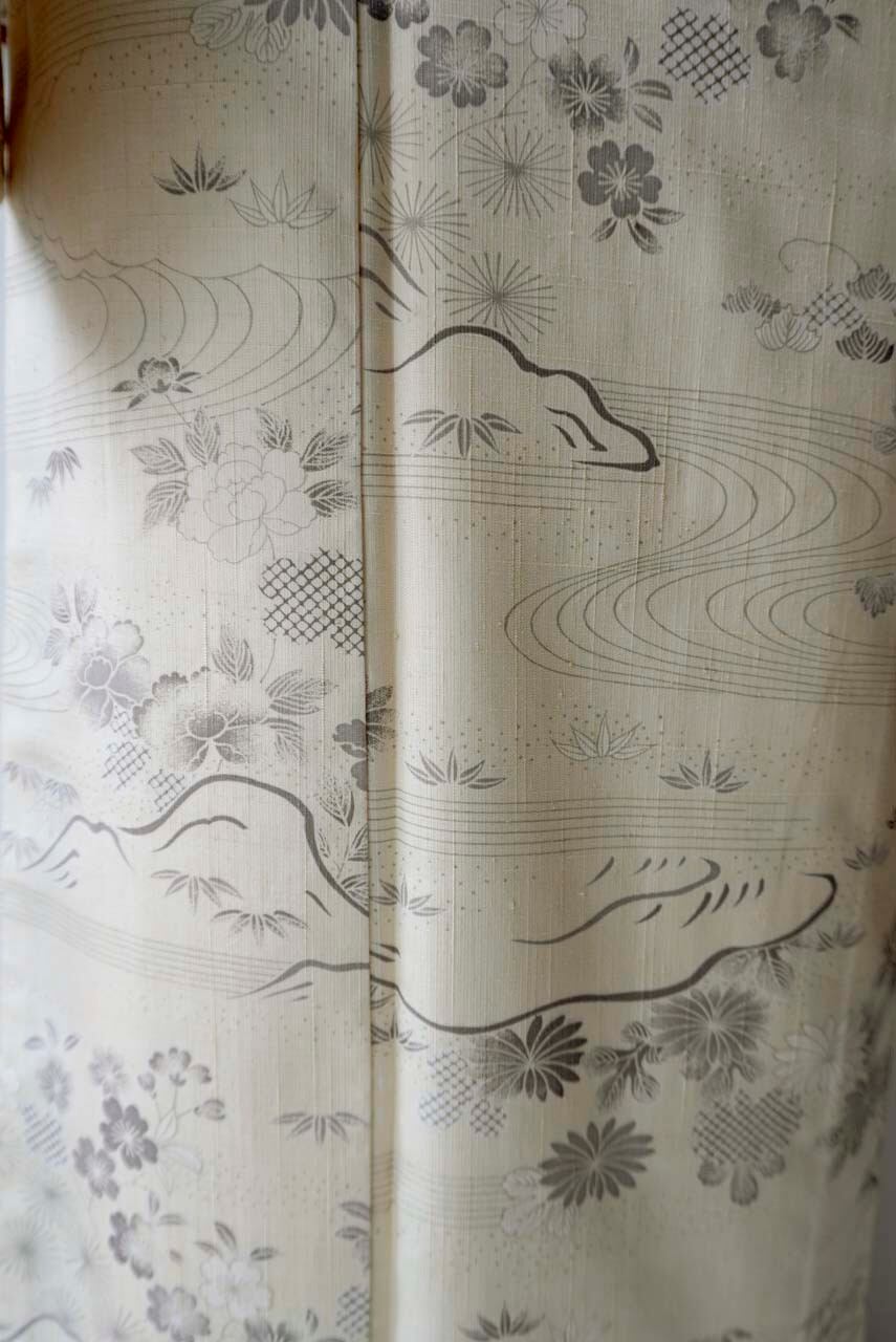 【袷】練色地 四季花風景文 生紬