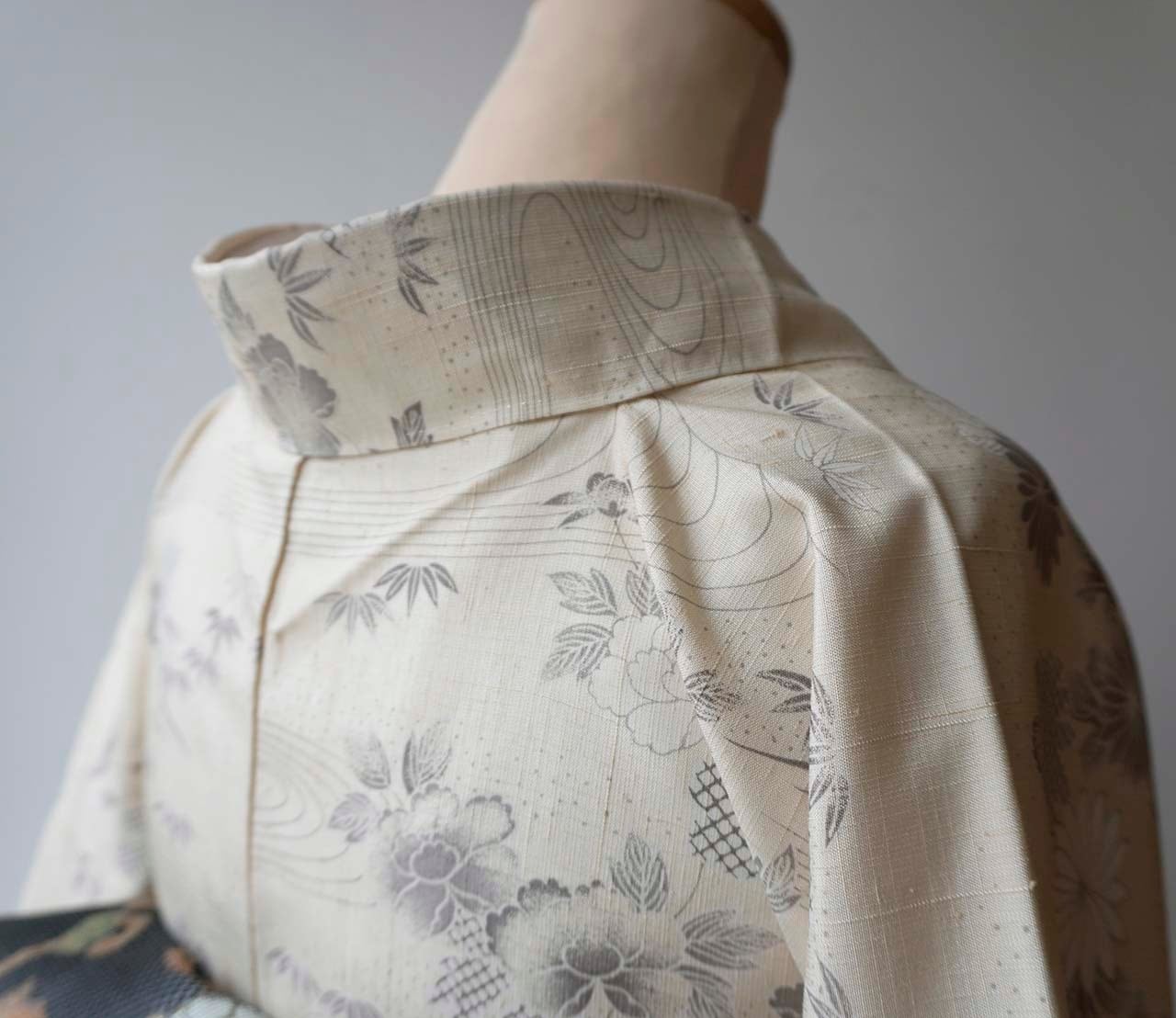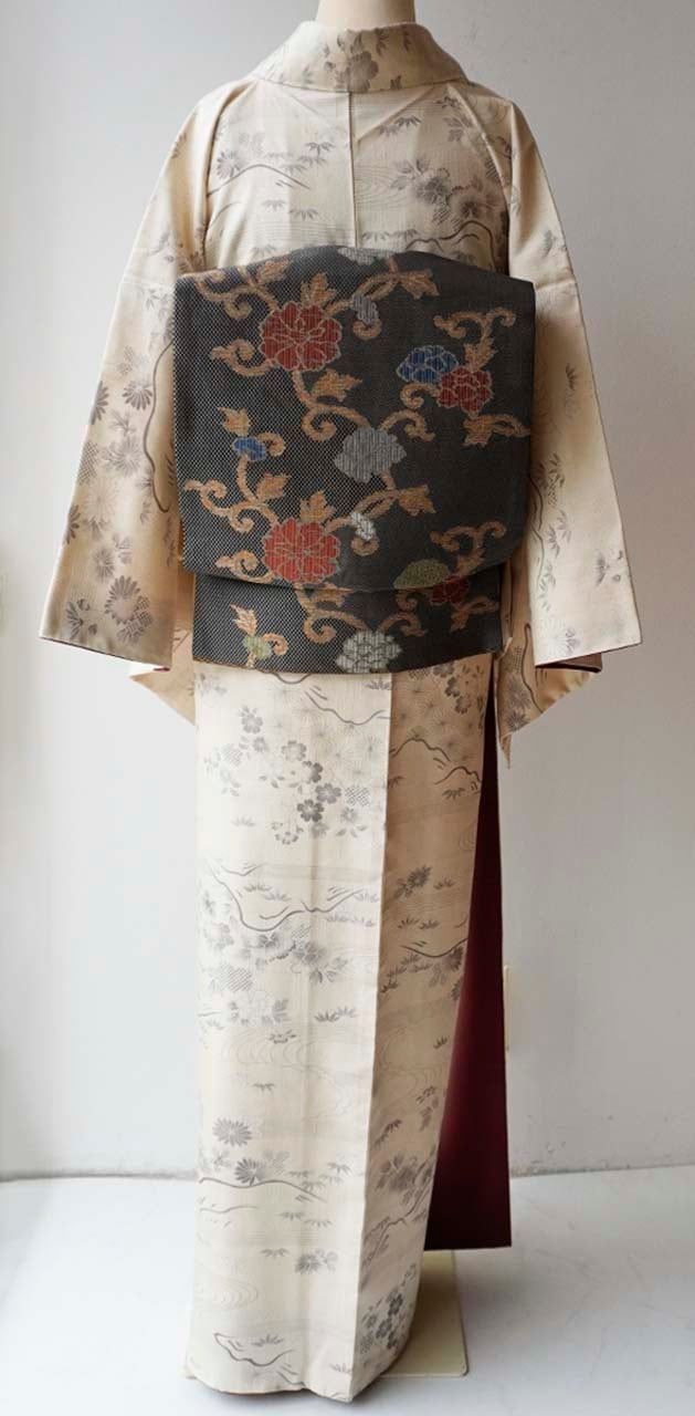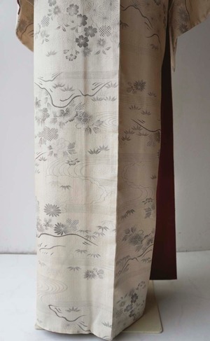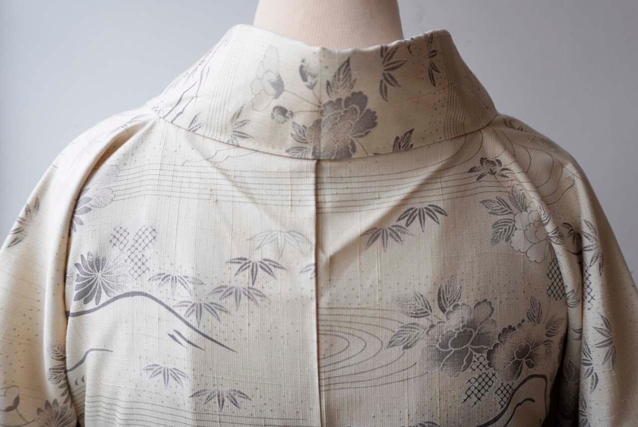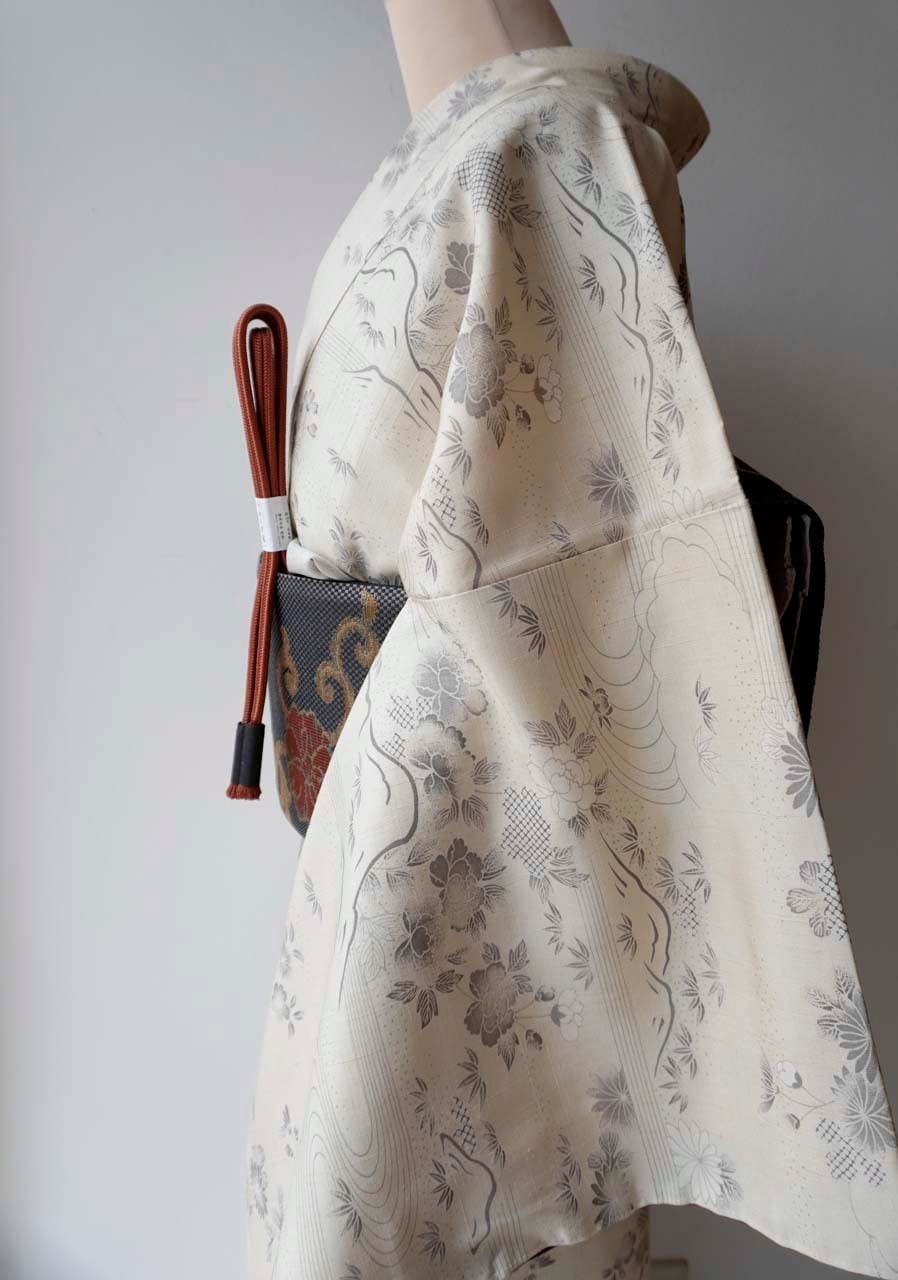 【袷】練色地 四季花風景文 生紬