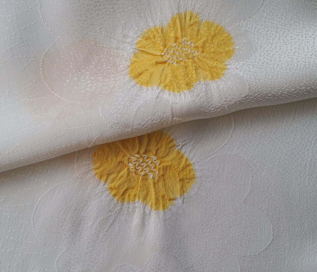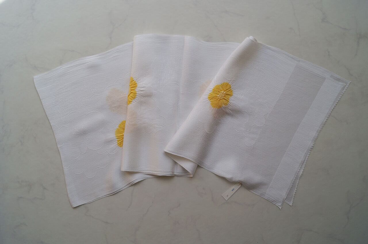 【帯揚げ】白色×蒲公英色 松葉散らしに梅地紋 梅輪出し 帯揚げ 251212 ③