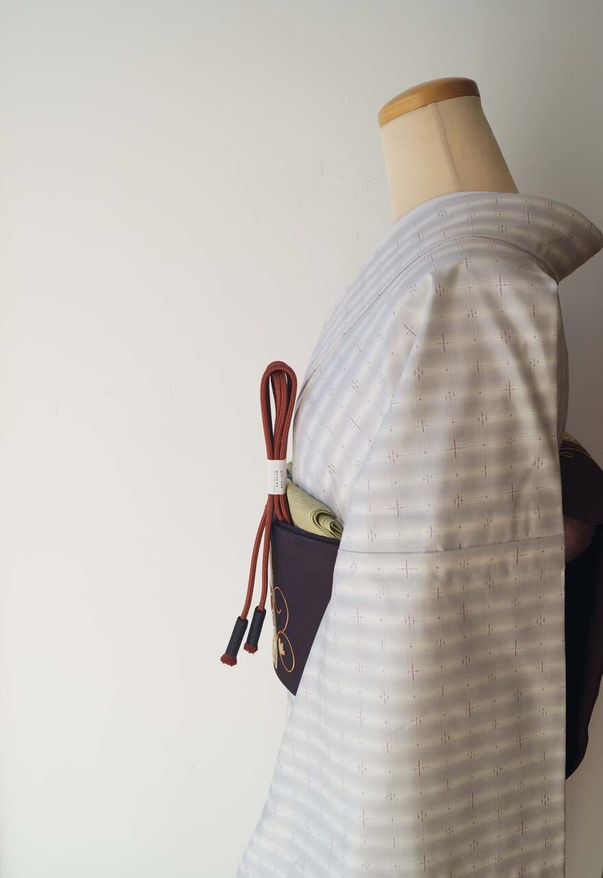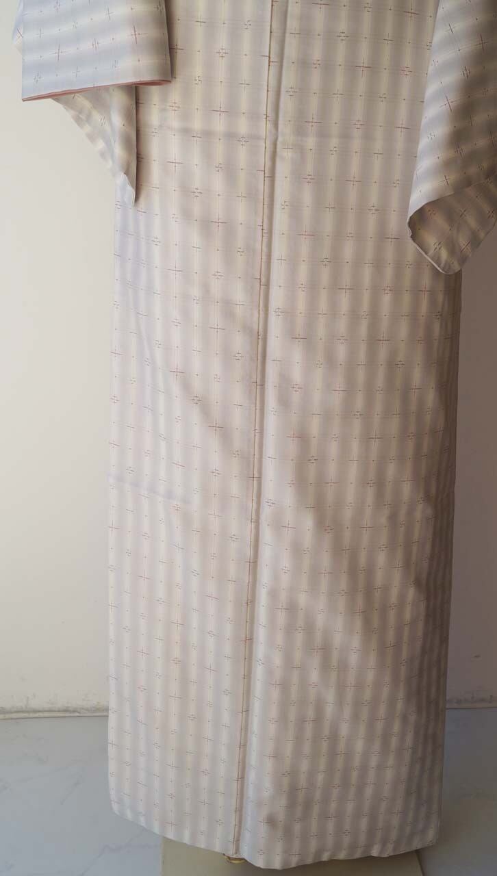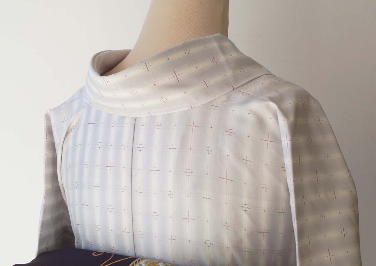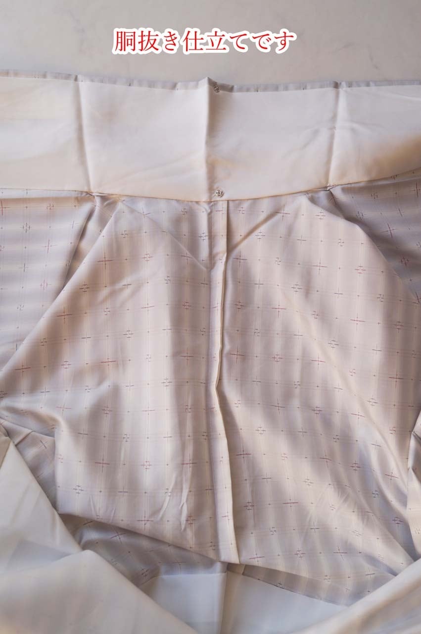 【袷】暁鼠色×胡粉色 格子に絣文 紬 胴抜き仕立て