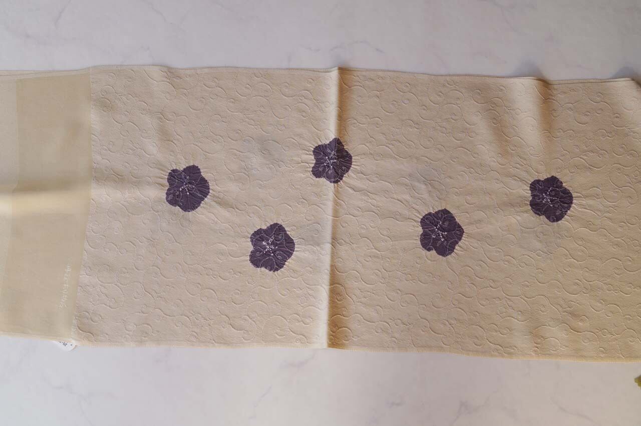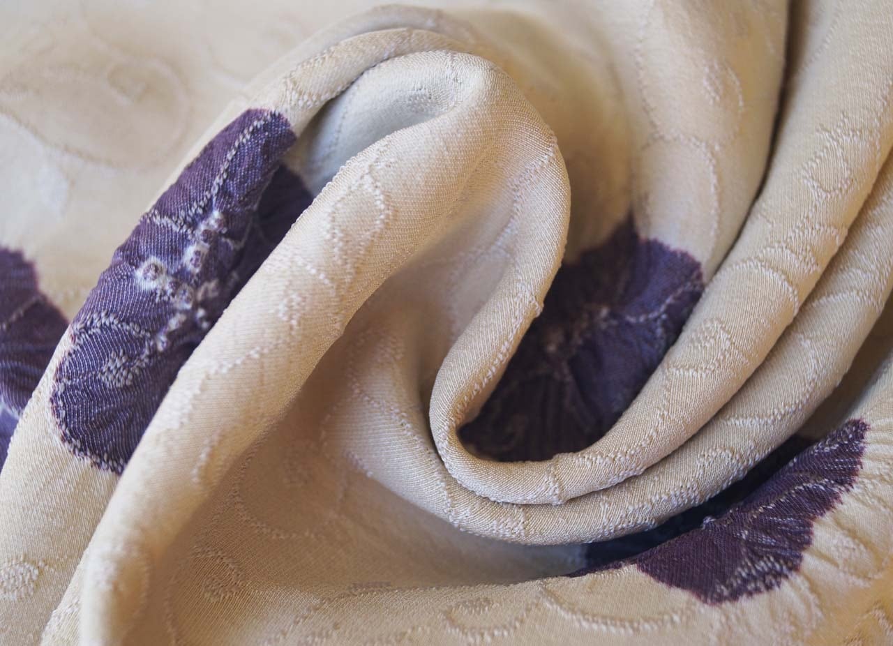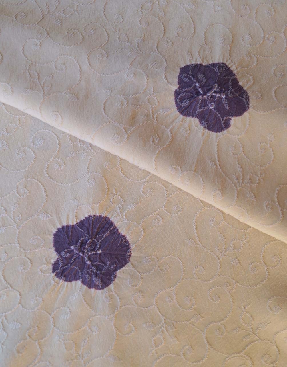 防染糸で唐草地紋が施されたお生地に