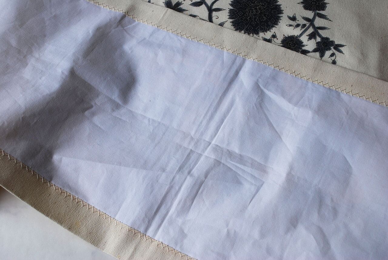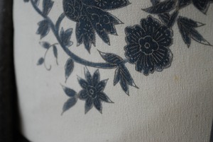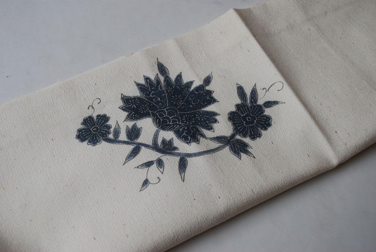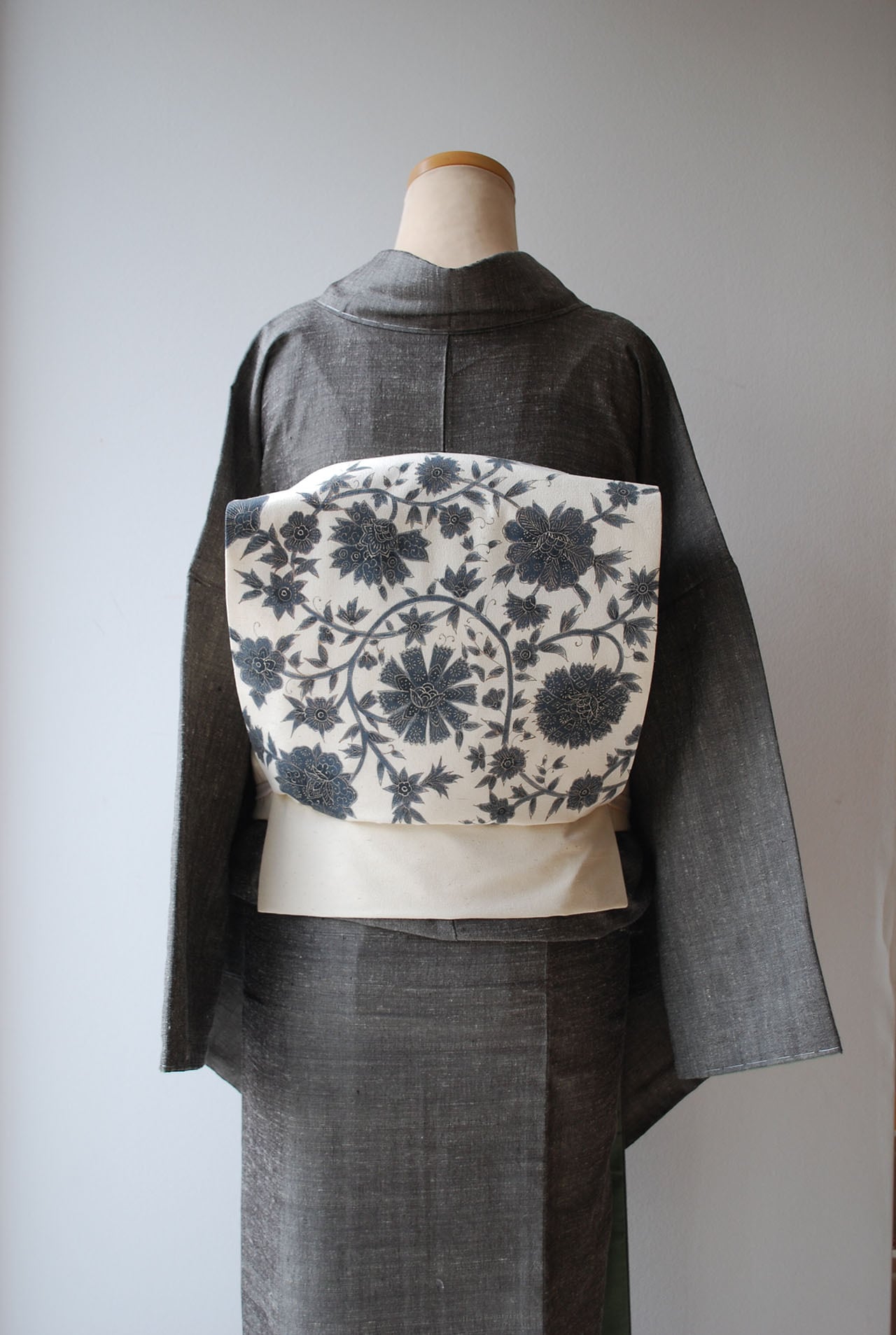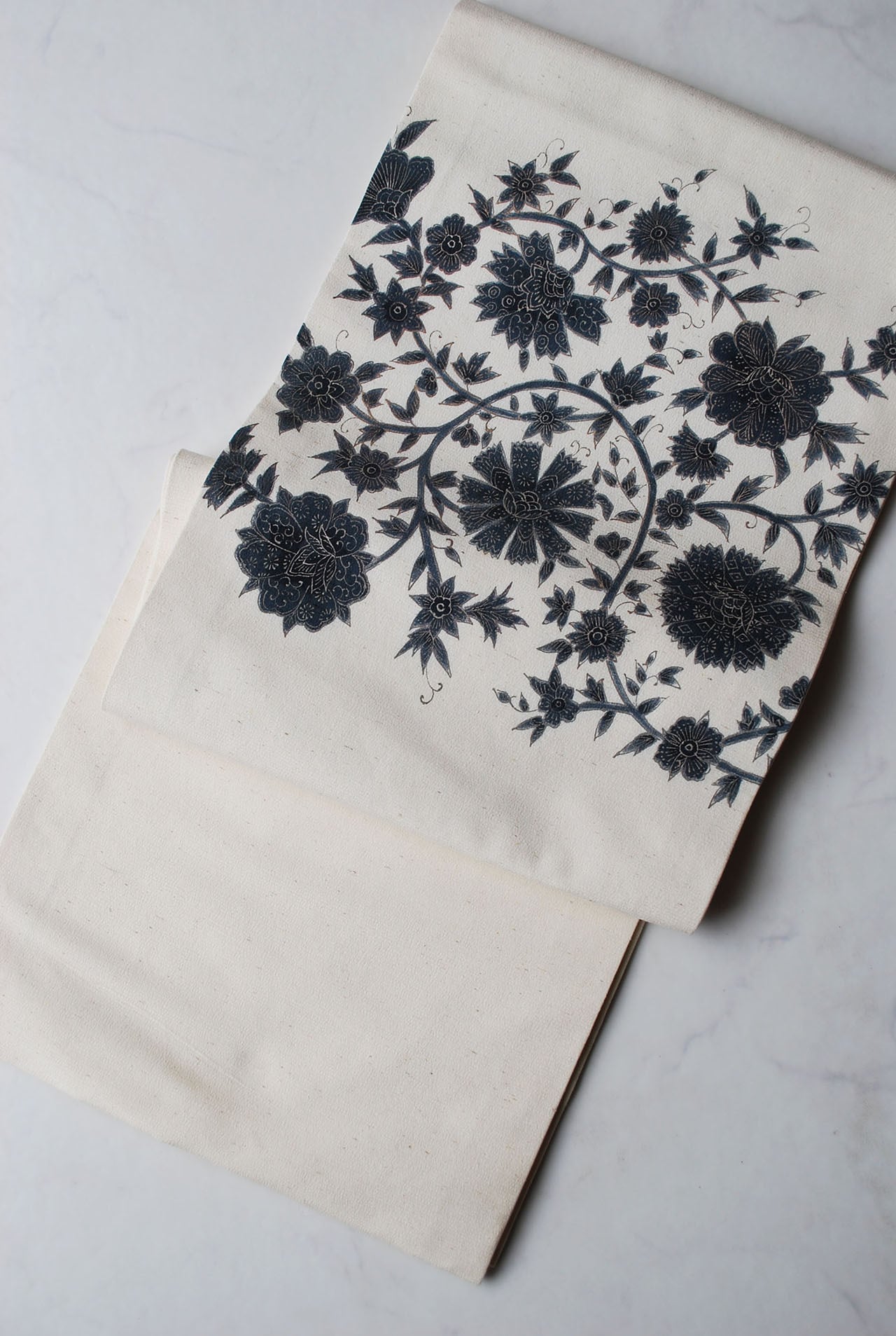 【なごや帯】生成り色地 藍色華唐草帯 開き仕立て