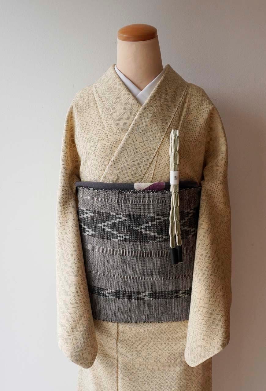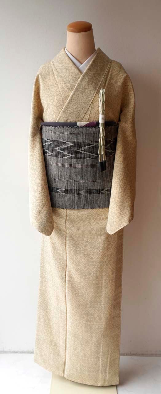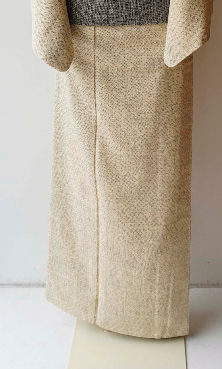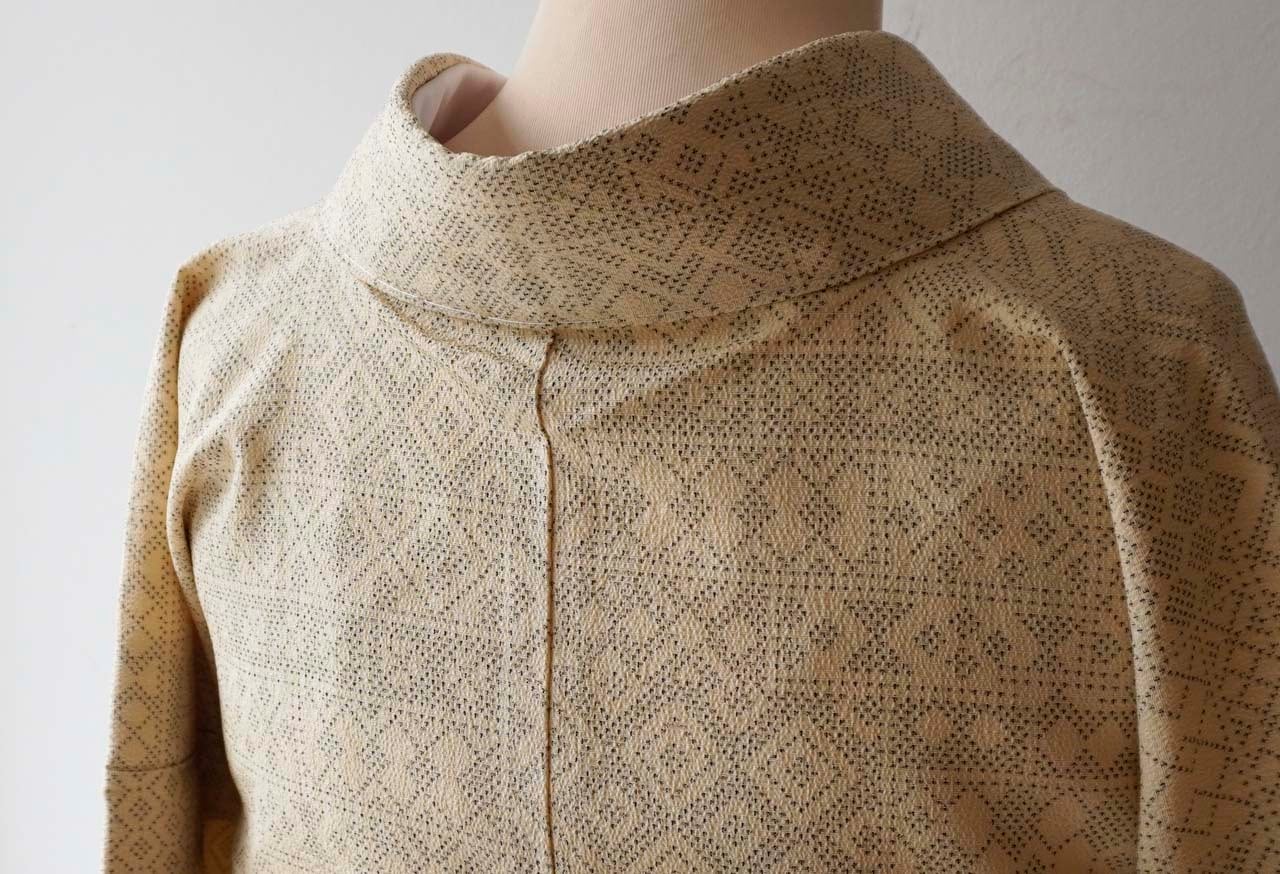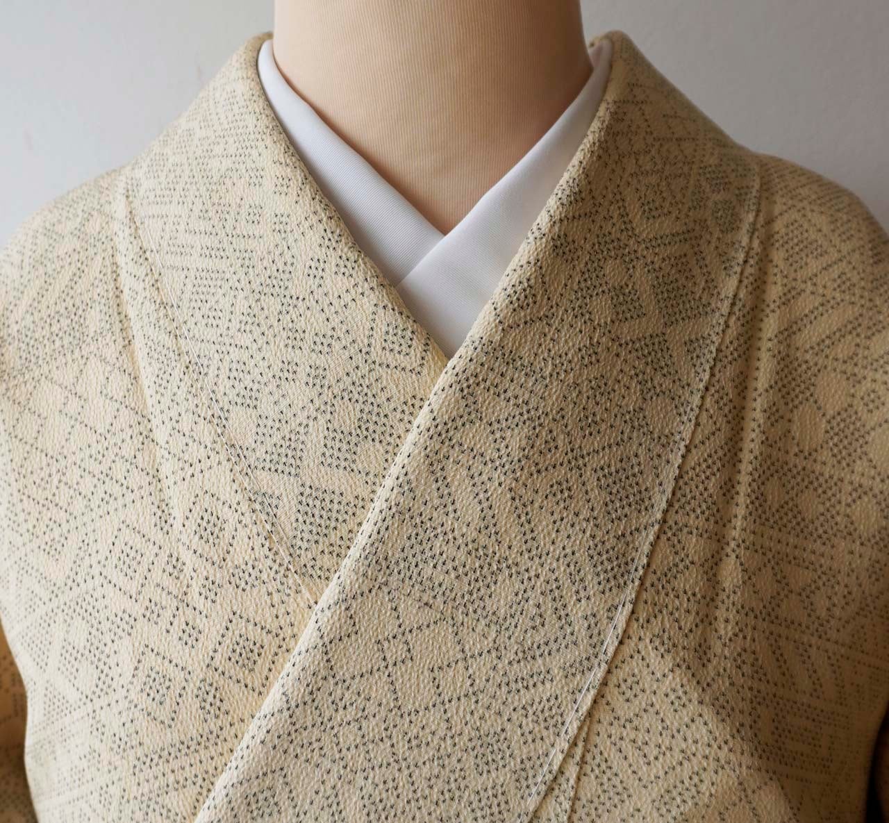 【袷】薄卵色地 幾何学文 塩沢お召し