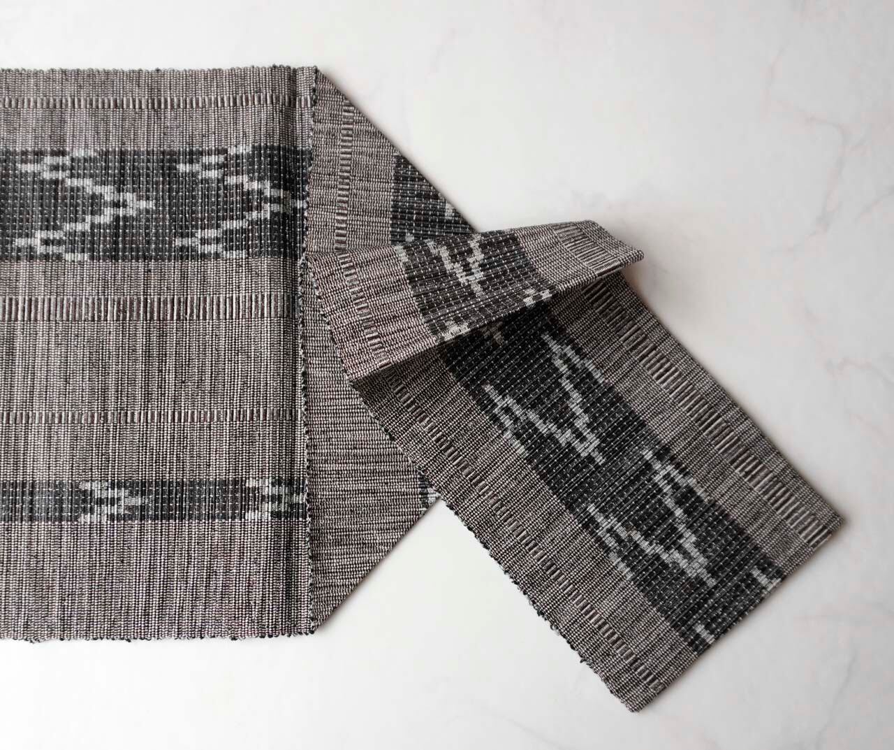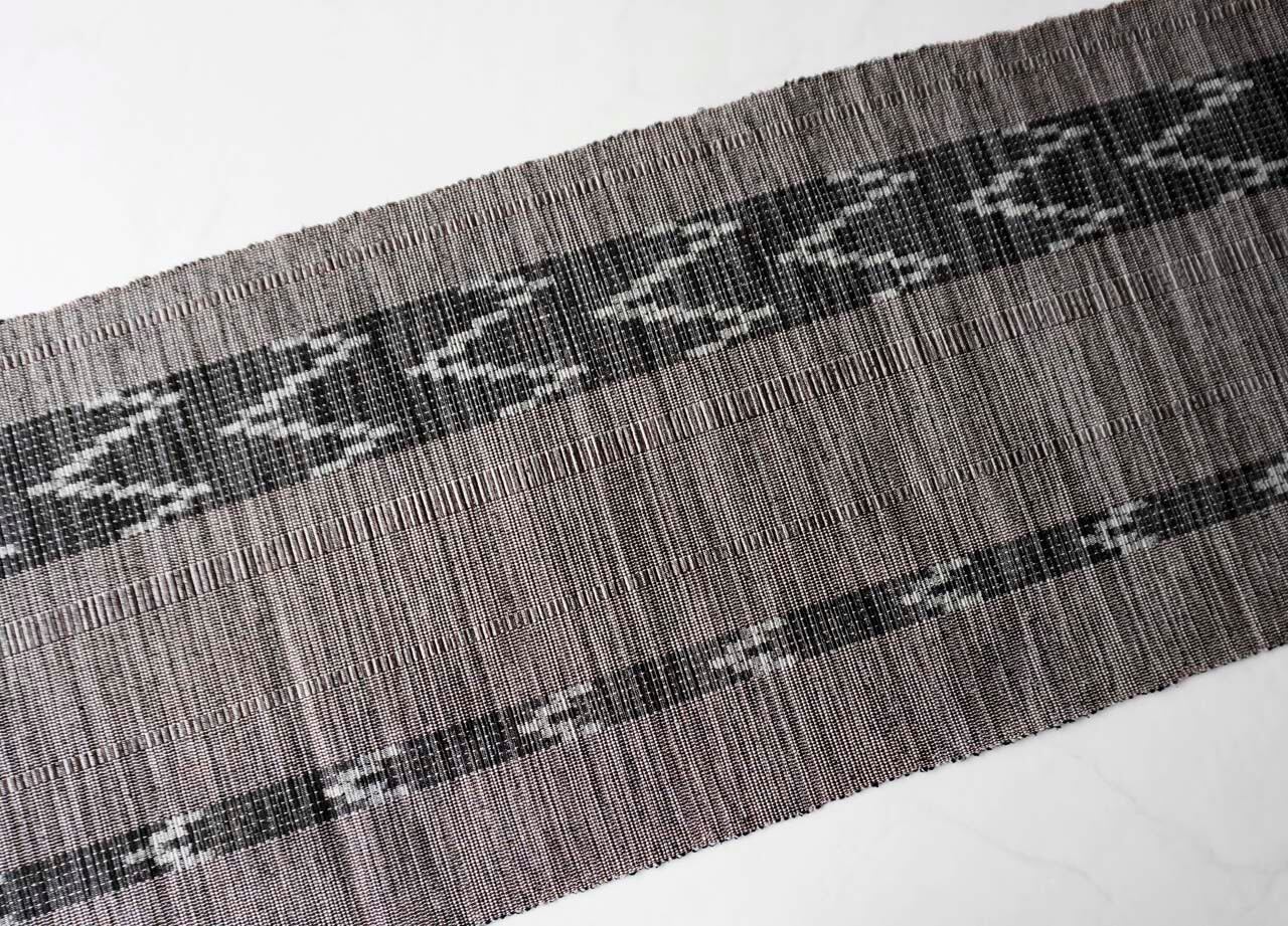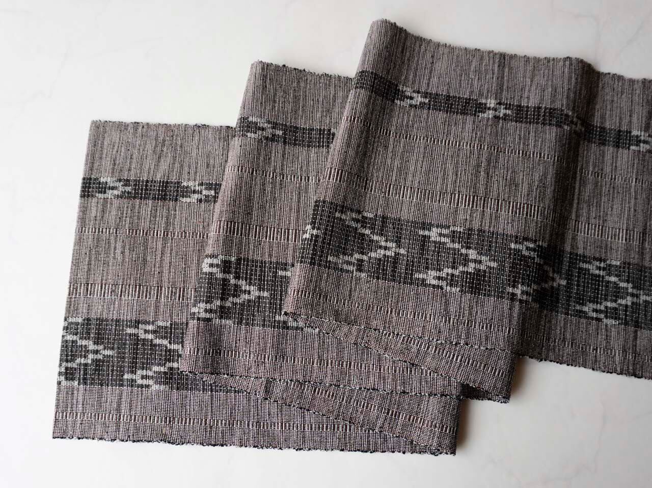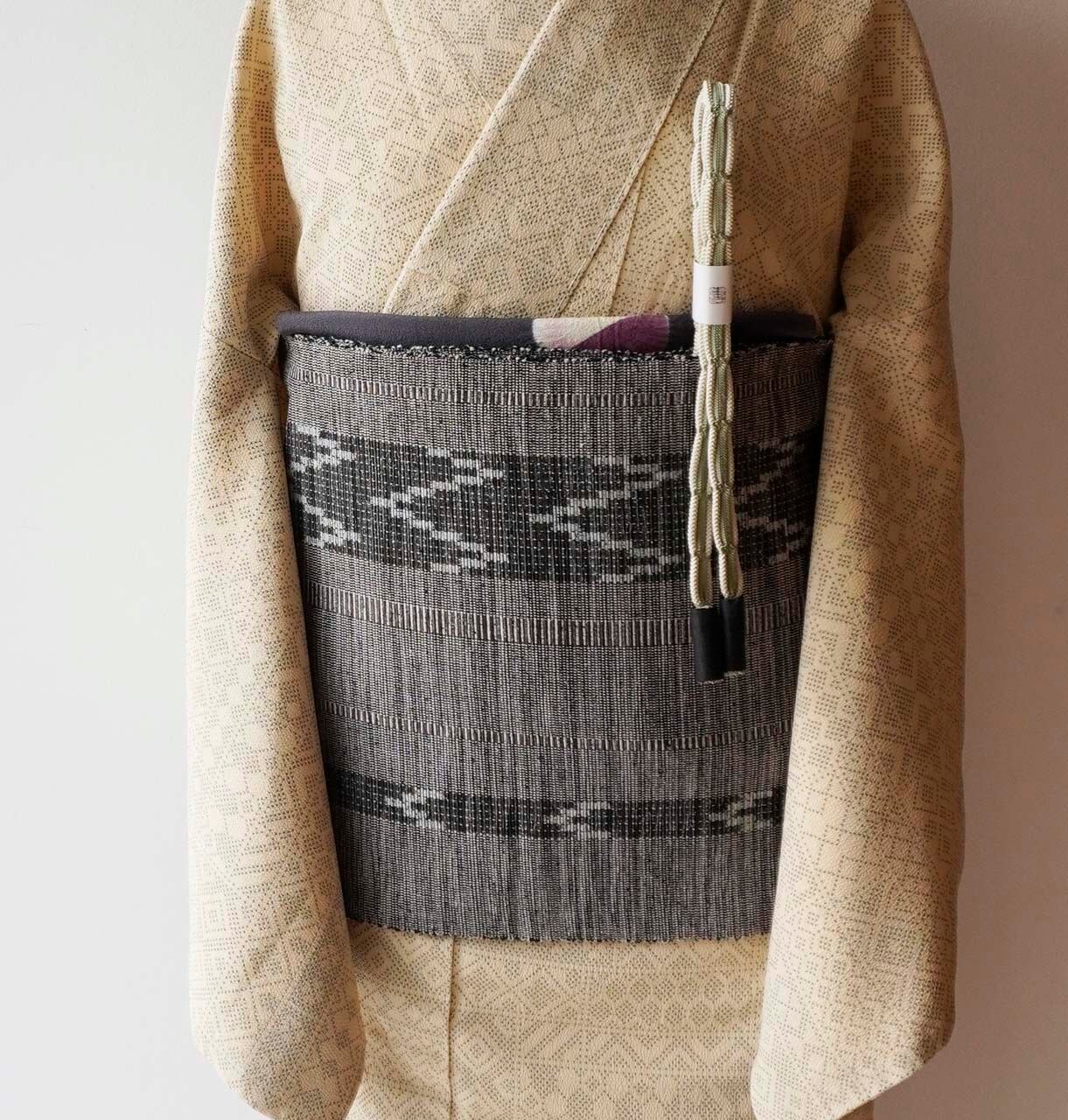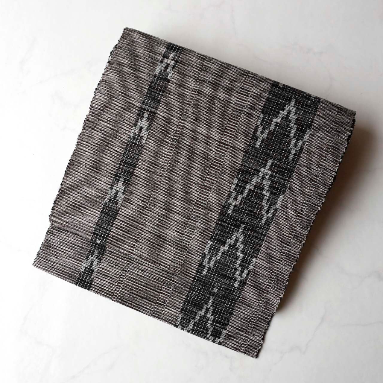【なごや帯】黒×白×雀茶 琉球絣 八寸なごや帯