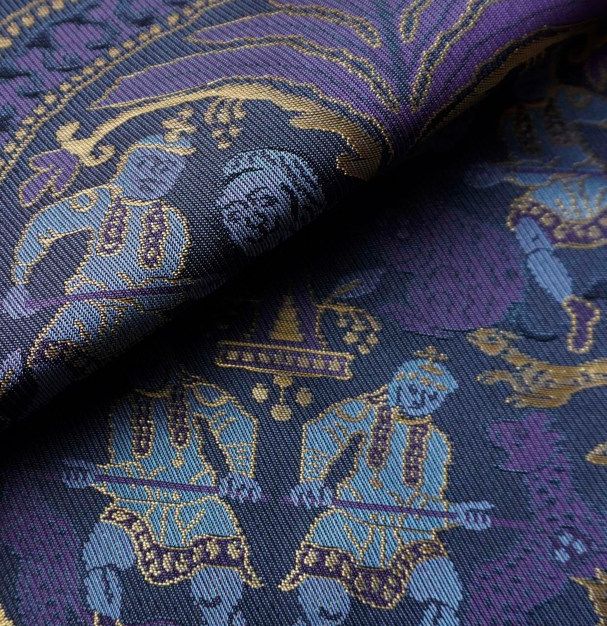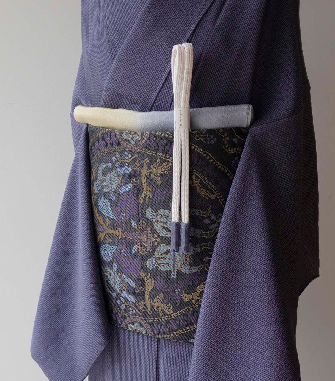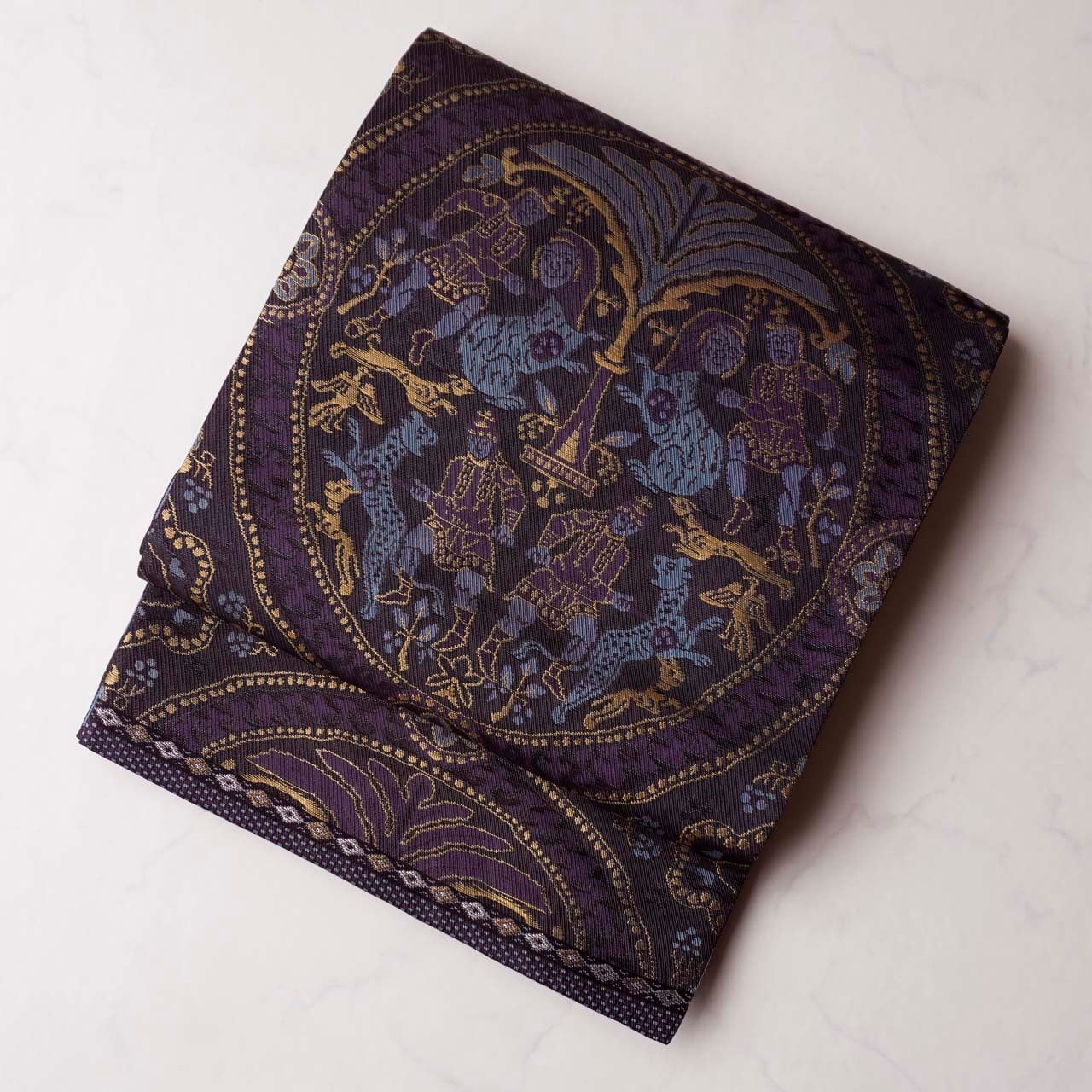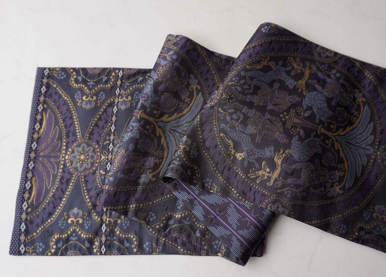 狩猟文が織り出されたふくろ帯です。
