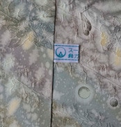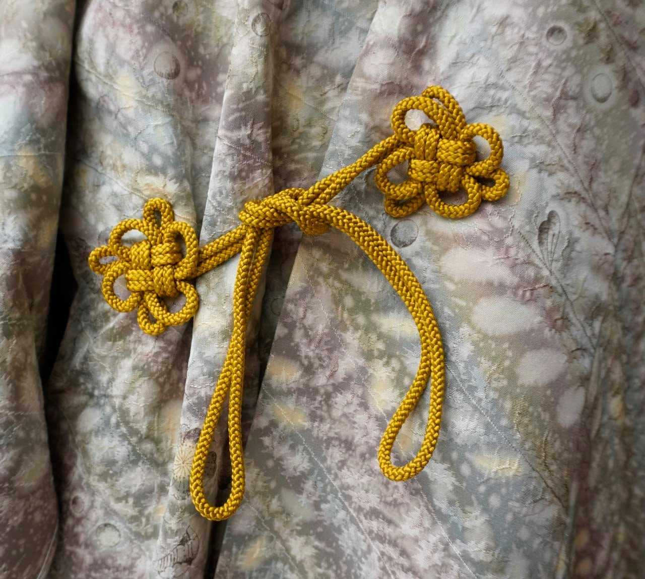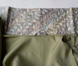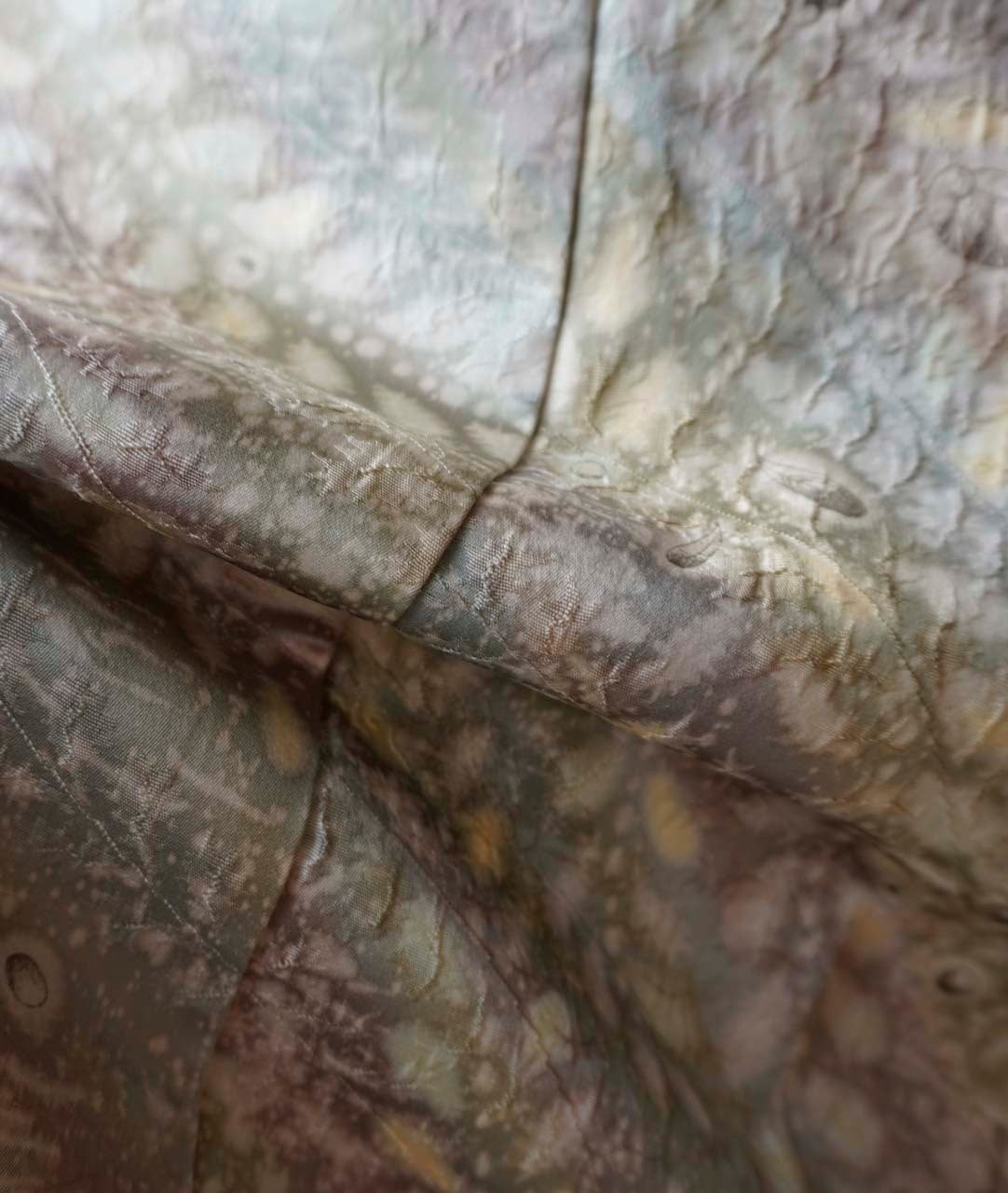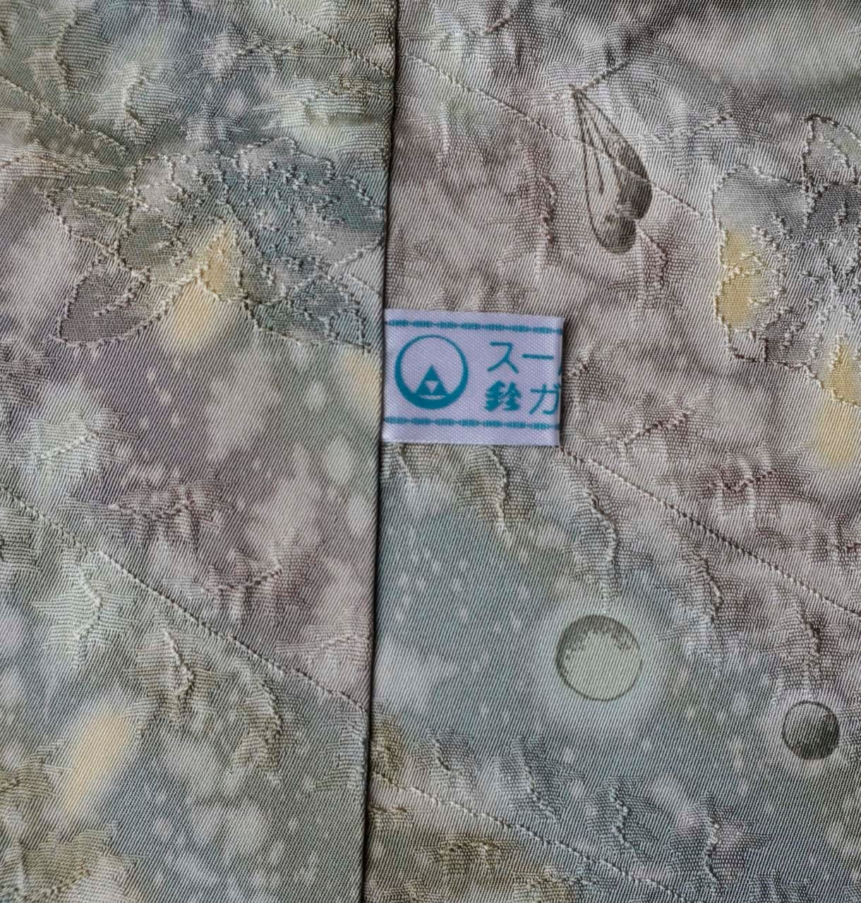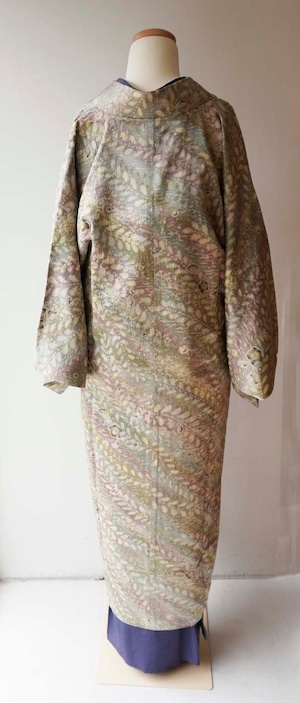 地紋に沿うように灰味がかった淡い紫、緑のお色が