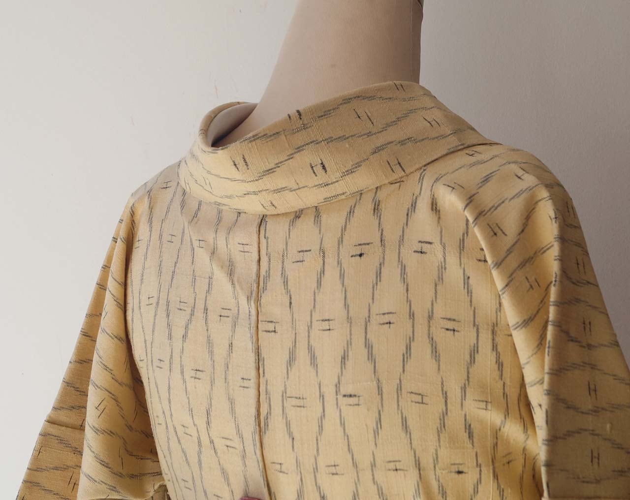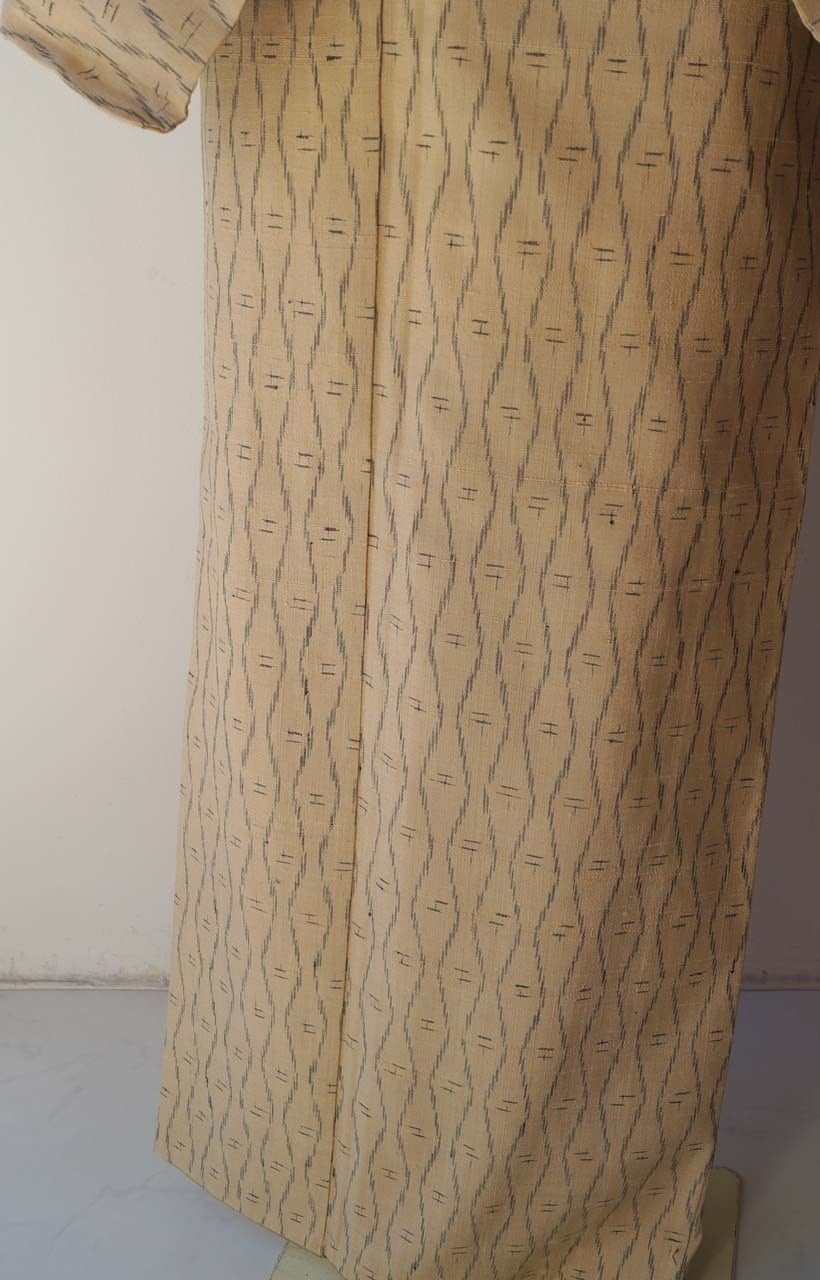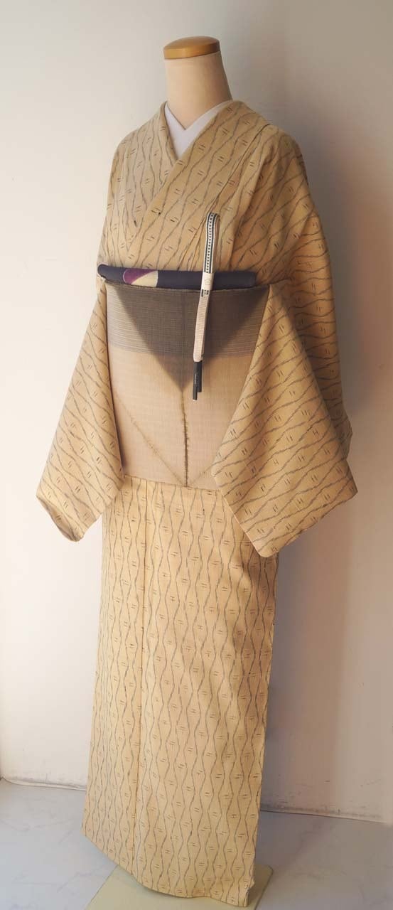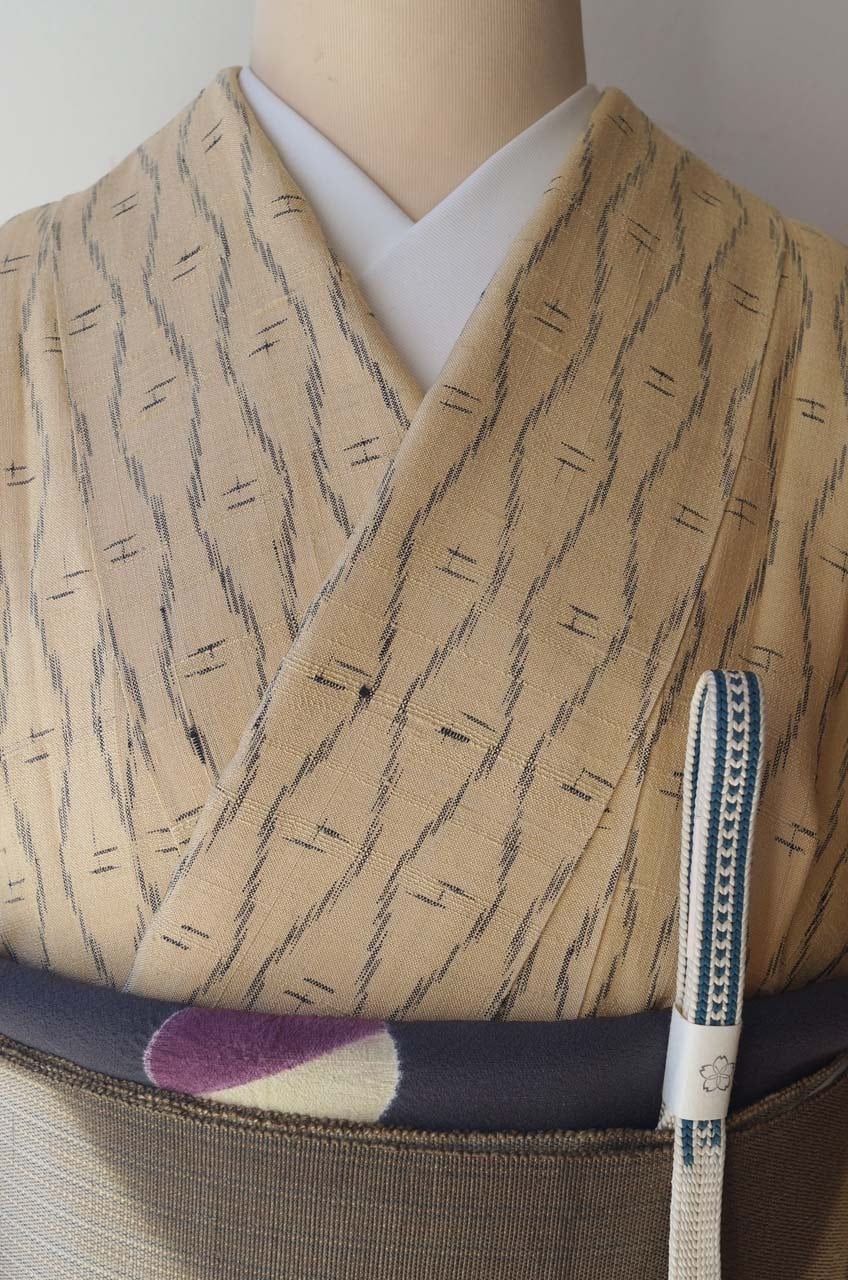【袷】しょうざん 砥の粉色 よろけ縞に絣柄 生紬