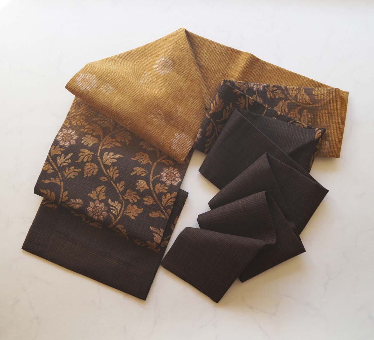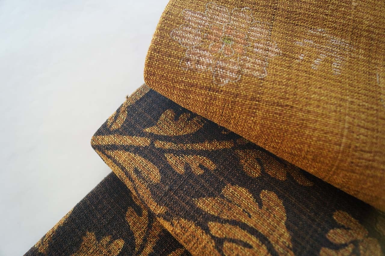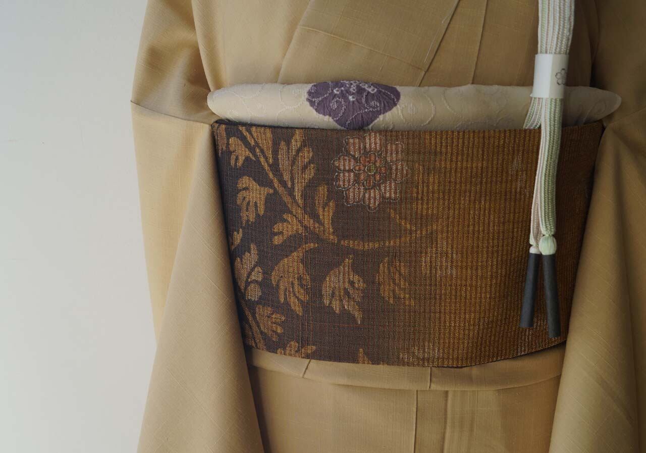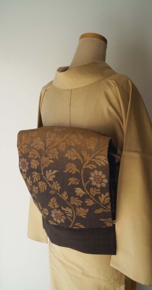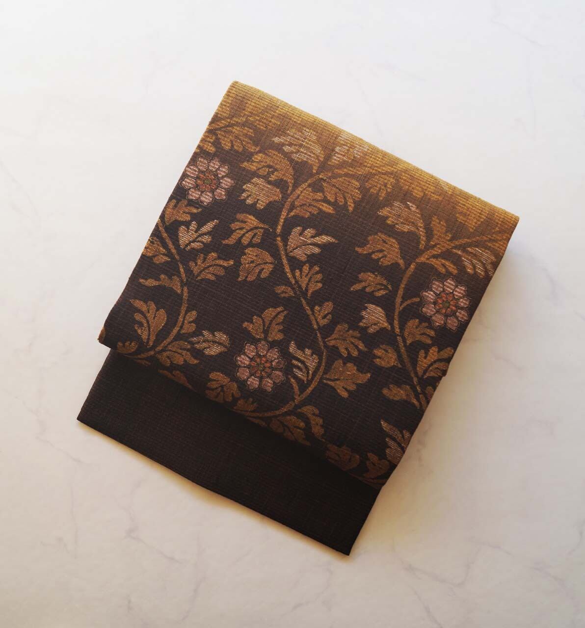 【なごや帯】柿渋染 抽象植物文 しょうざん生紬 なごや帯 証紙付き