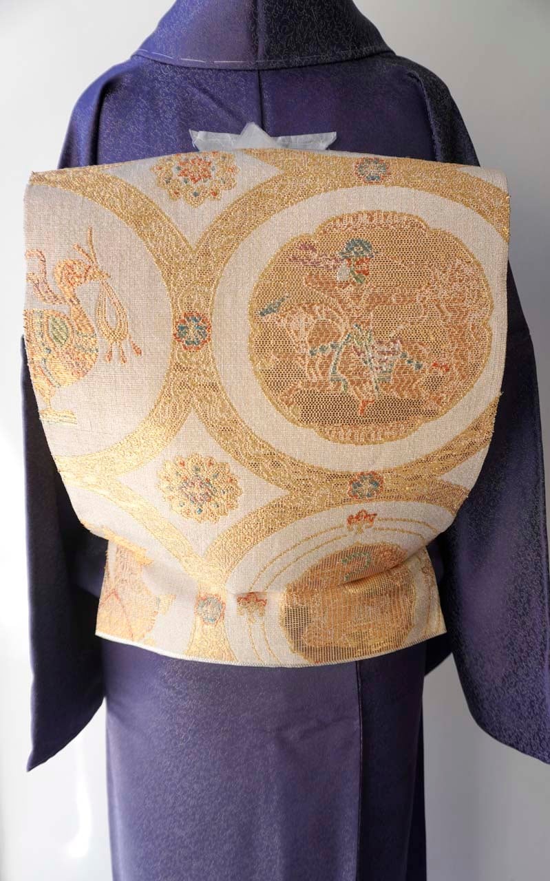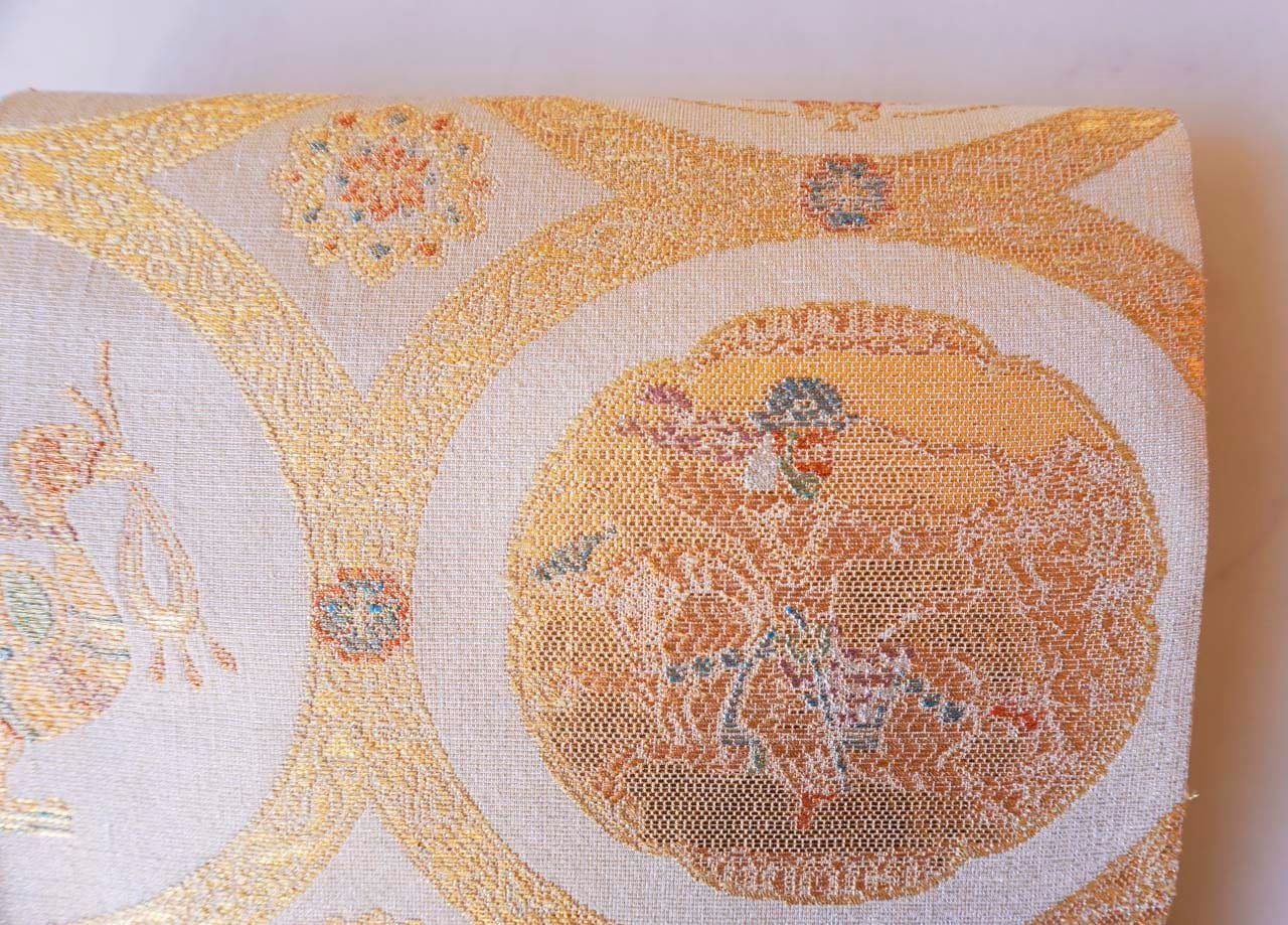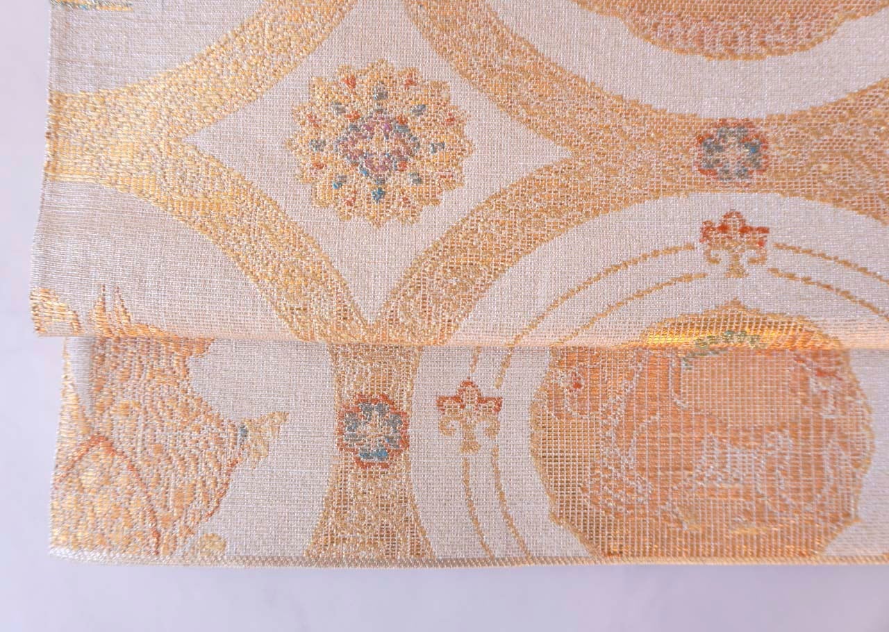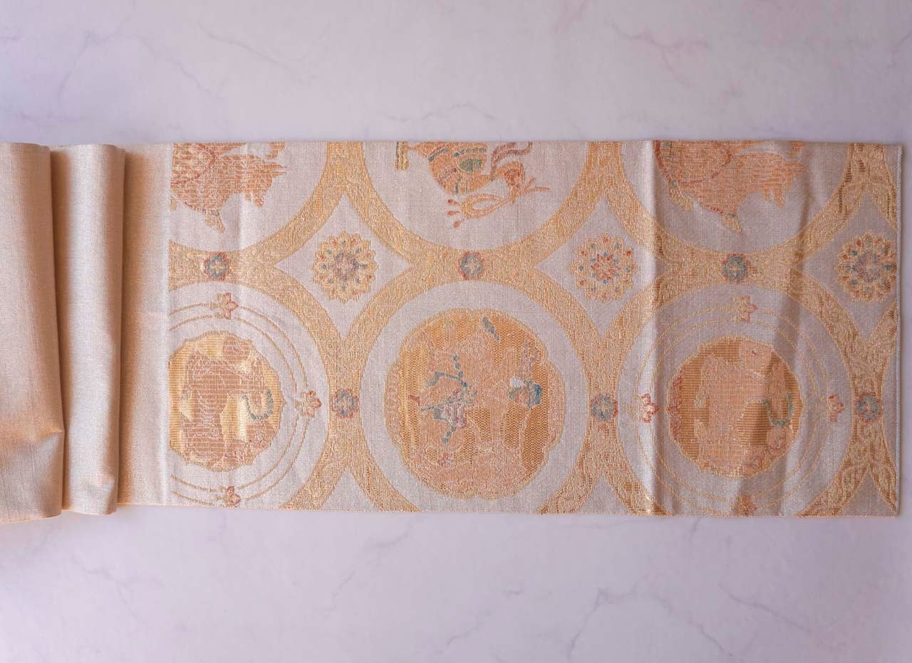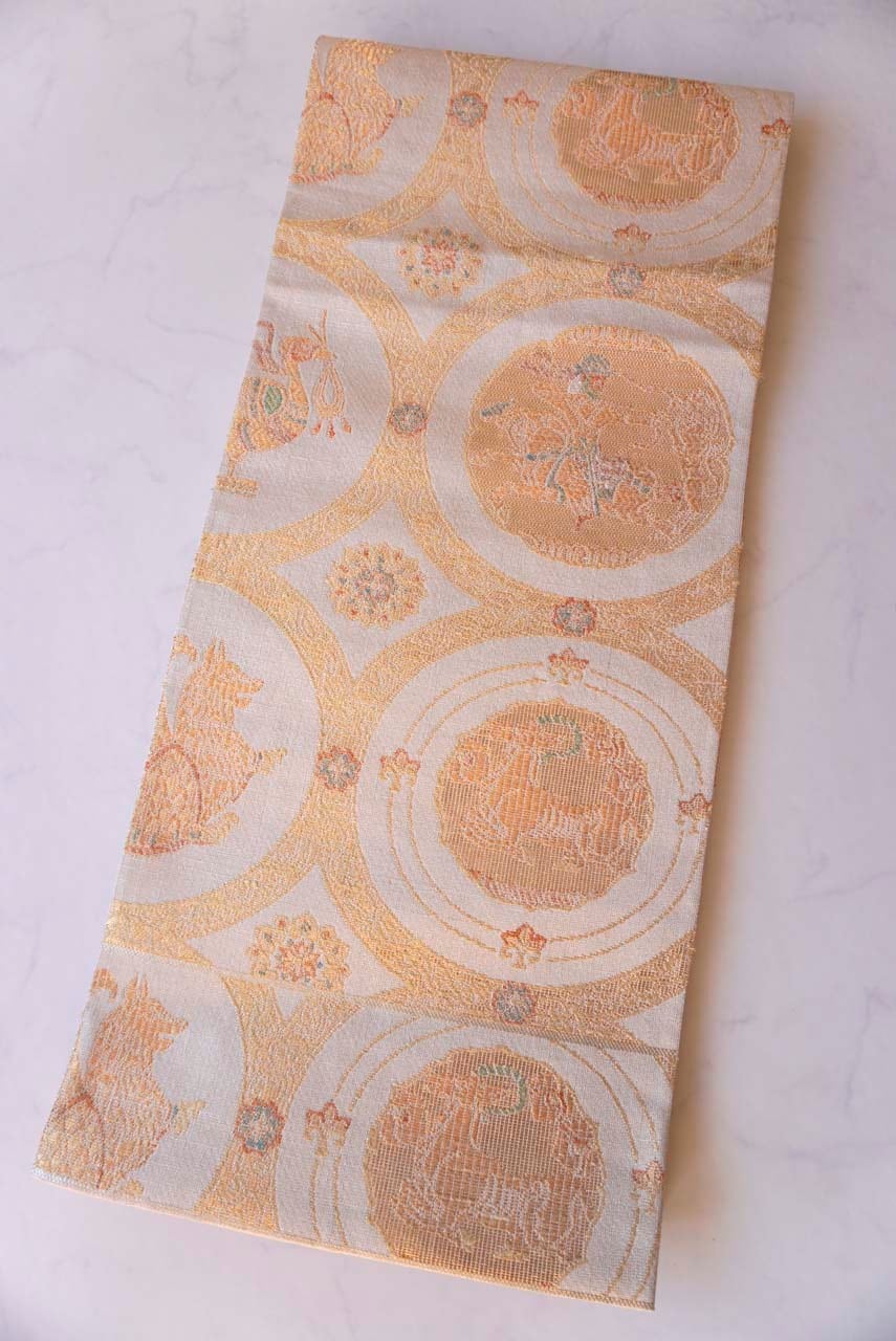 鳥の子色地、竹屋町裂 スキタイ狩猟文の袋帯です。