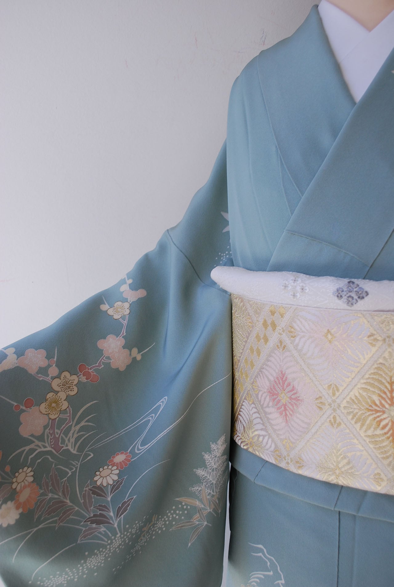 秋から春先にかけてのお花がたっぷりと染められた正統派の意匠です。