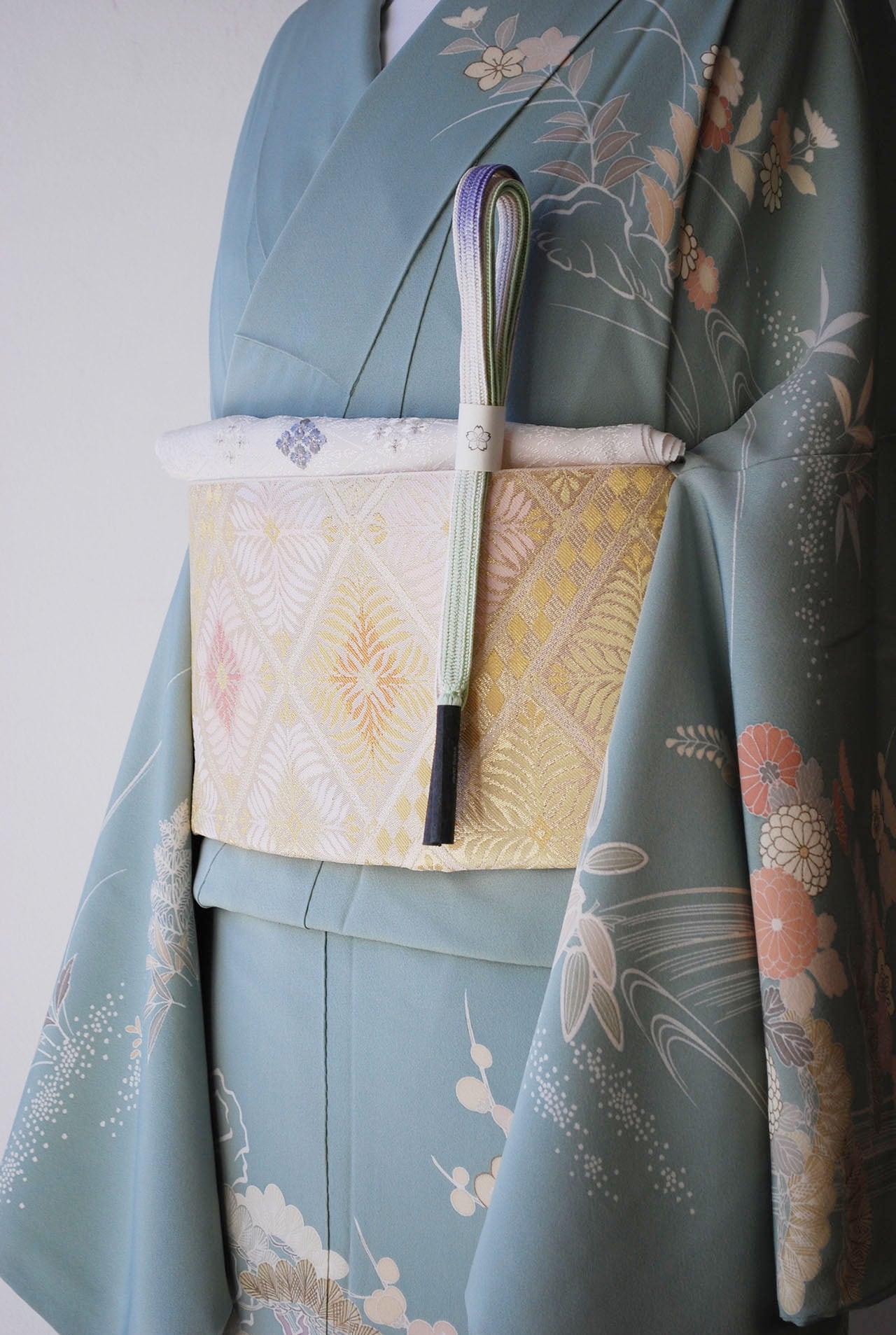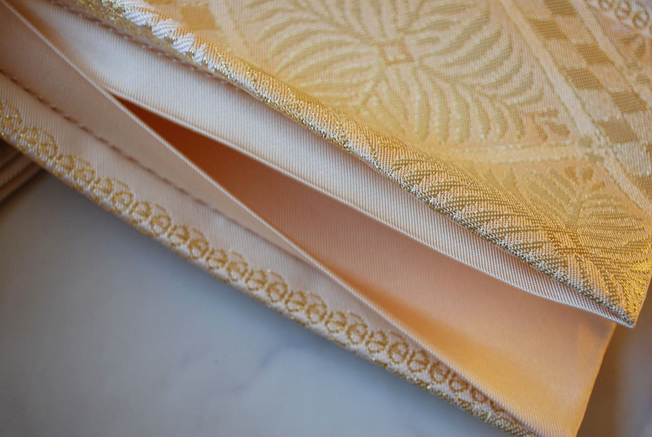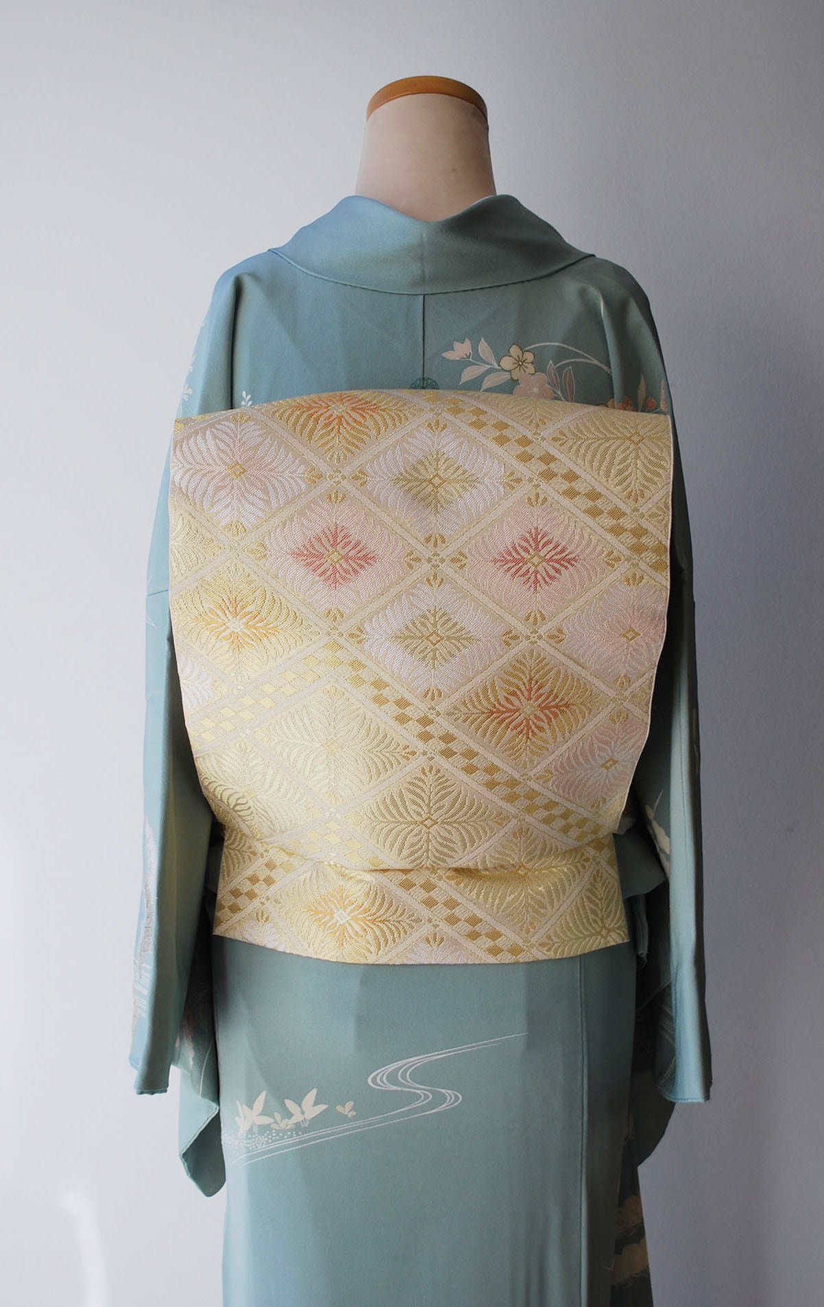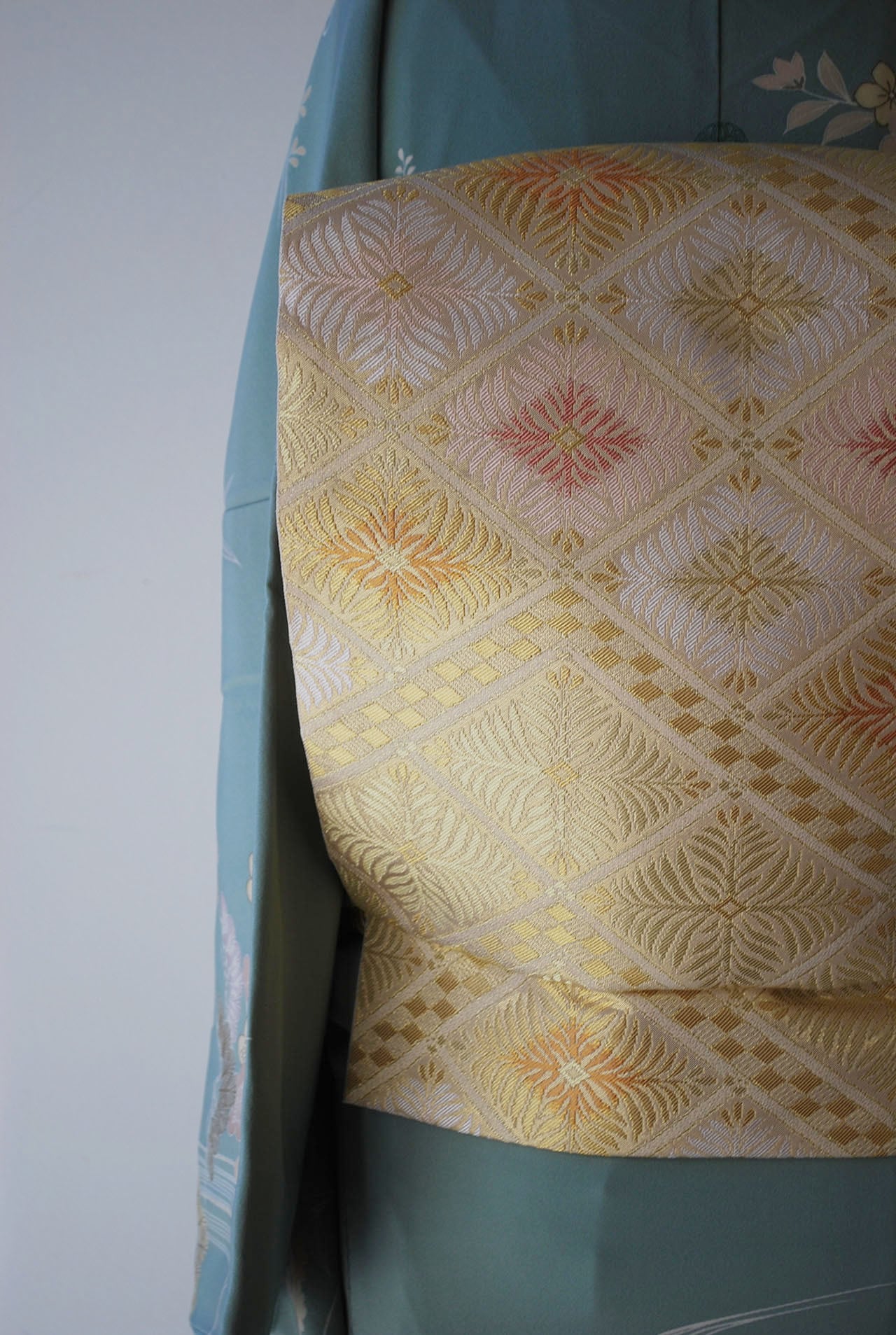 【ふくろ帯】淡金色に紅梅色 松葉菱 ふくろ帯
