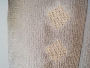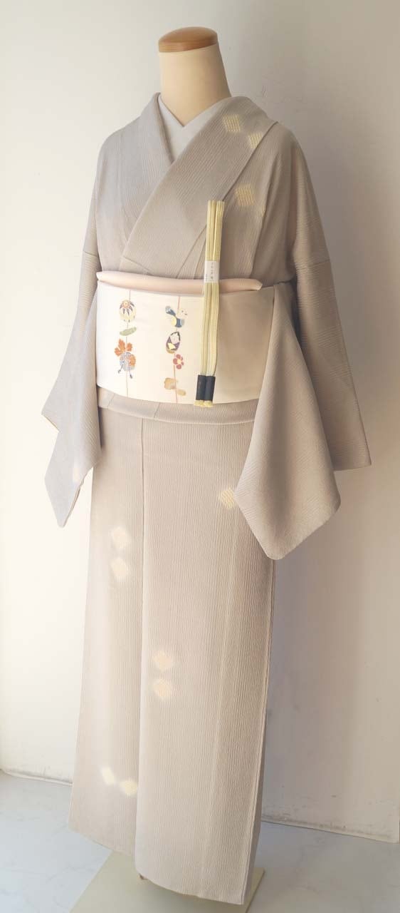 霞色地、縞に菱絞りの小紋です。
