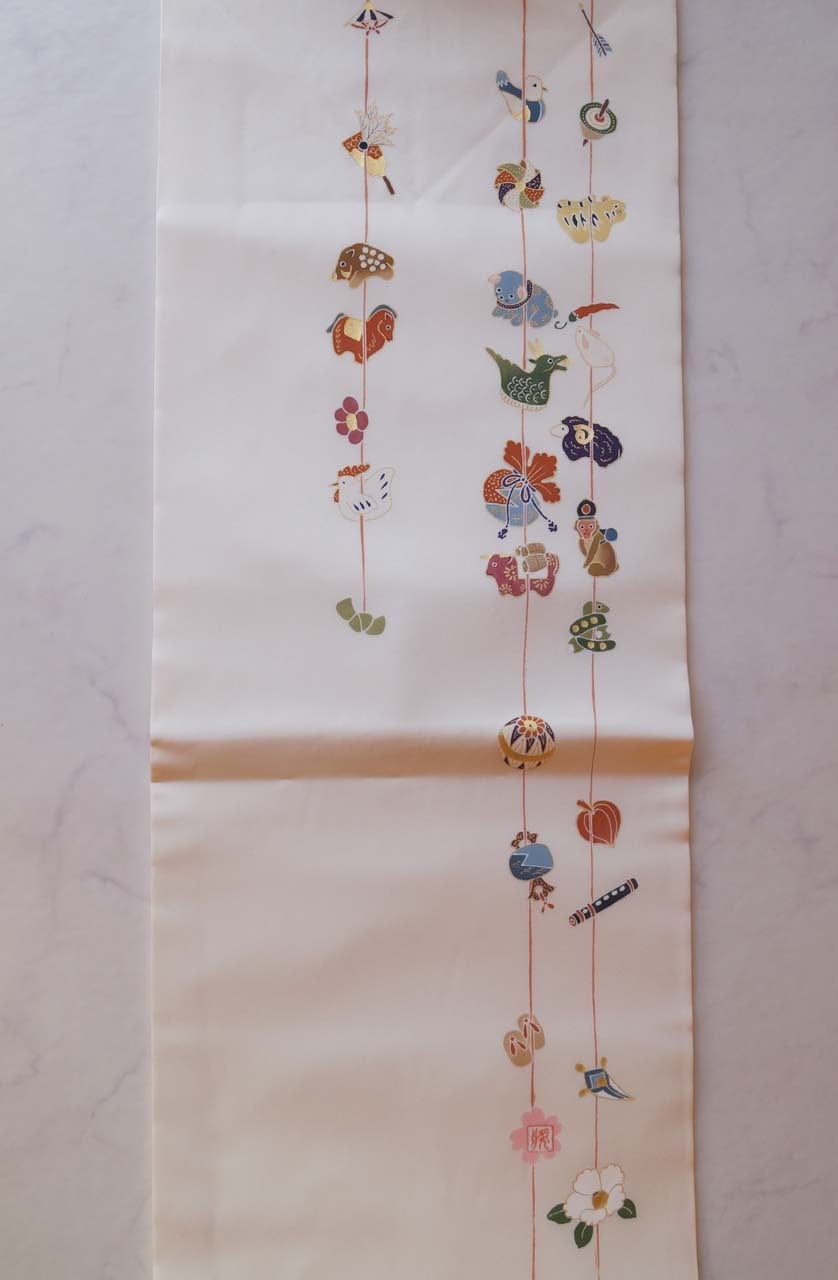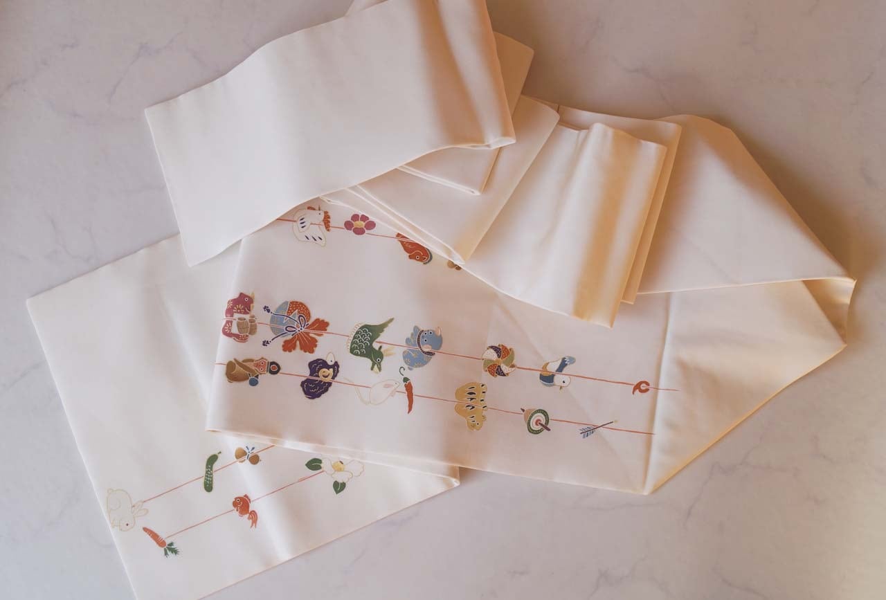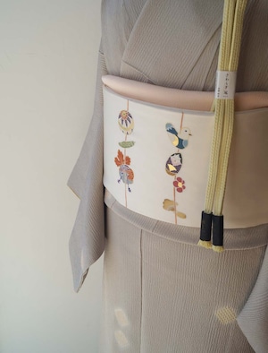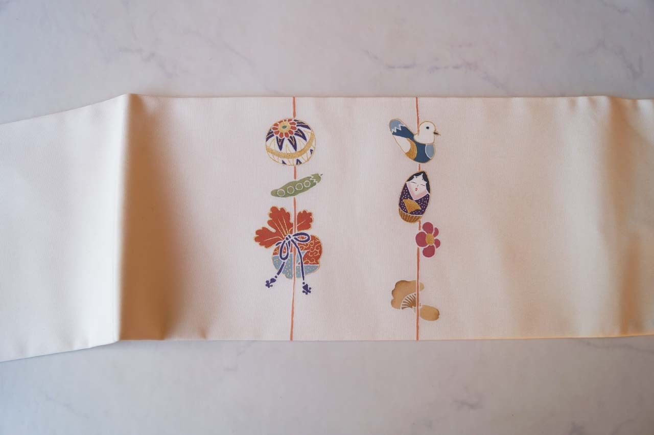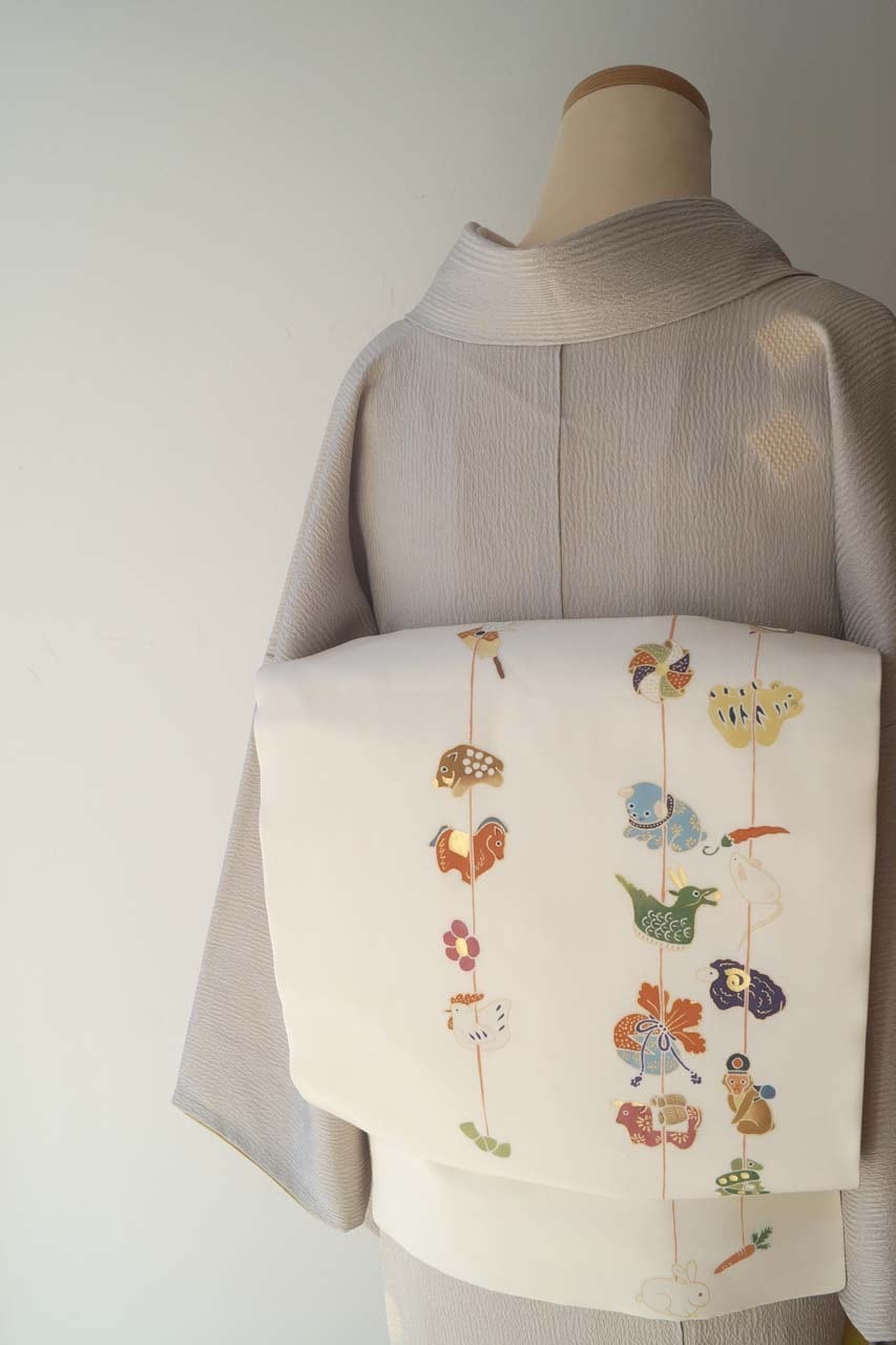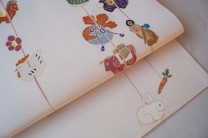 【なごや帯】生成り地 つるし雛の干支飾り 塩瀬なごや帯