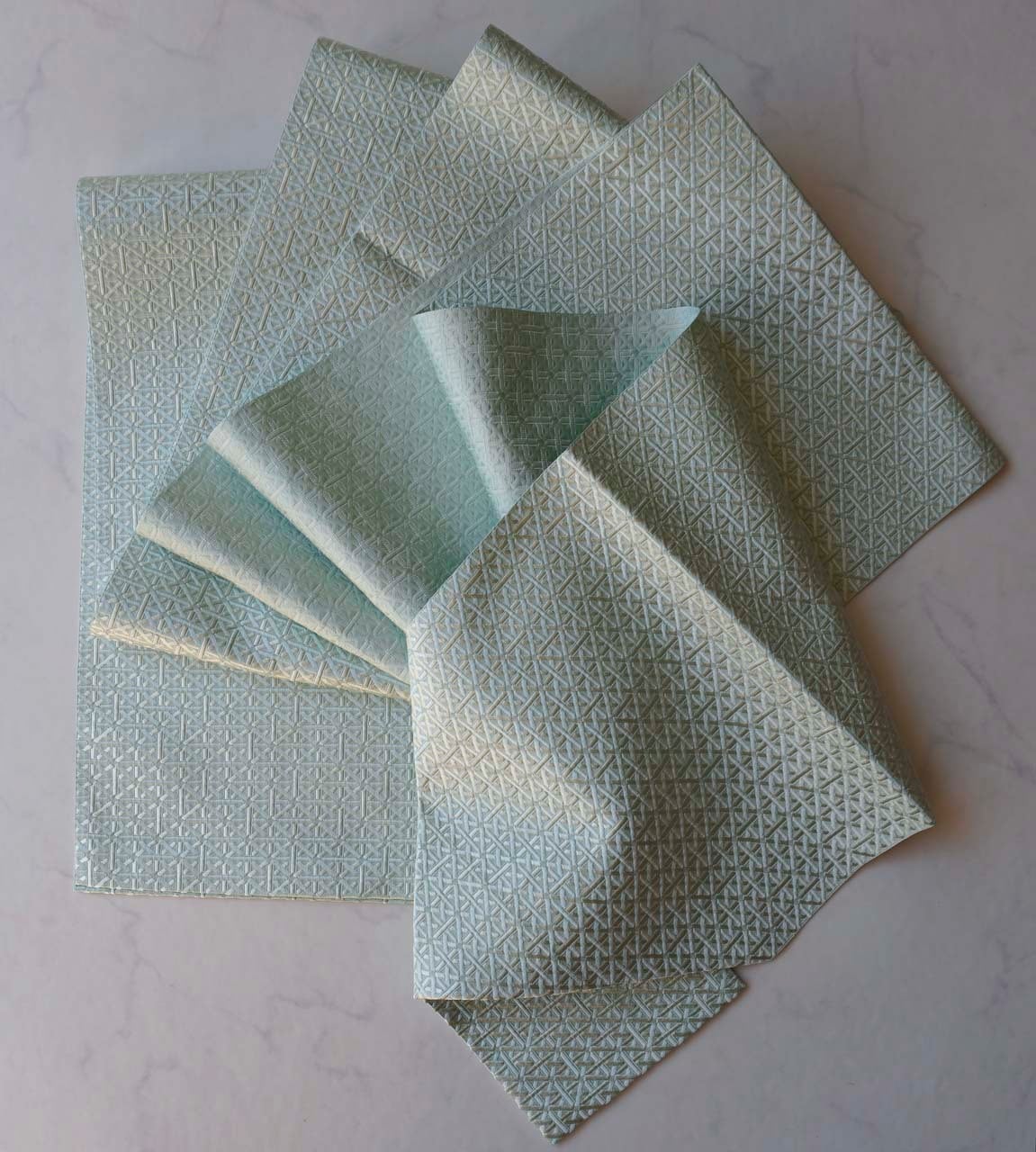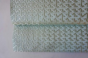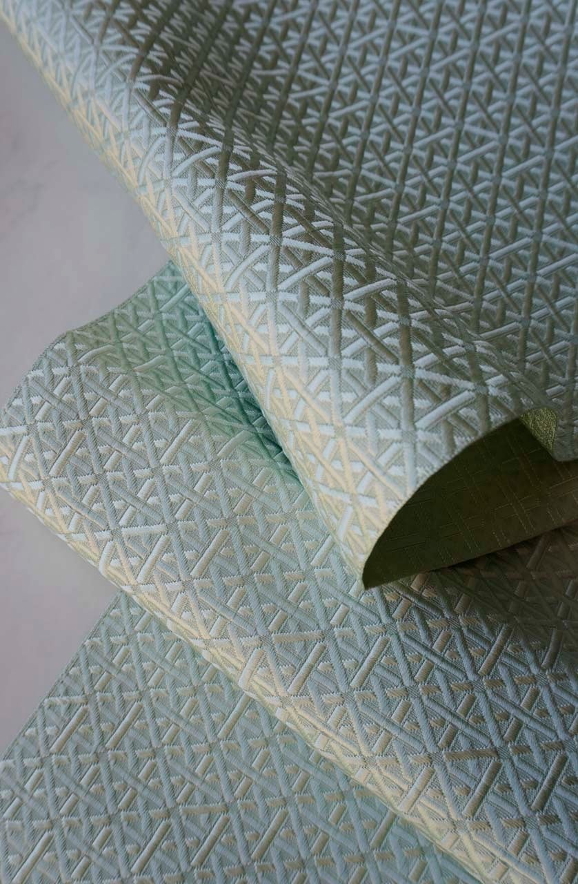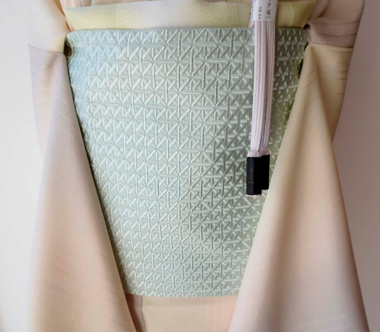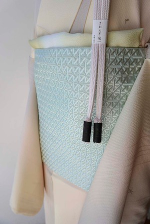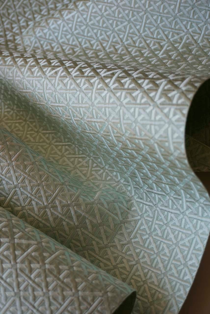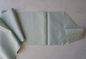 青磁色地、幾何学文の博多織の八寸なごや帯です。