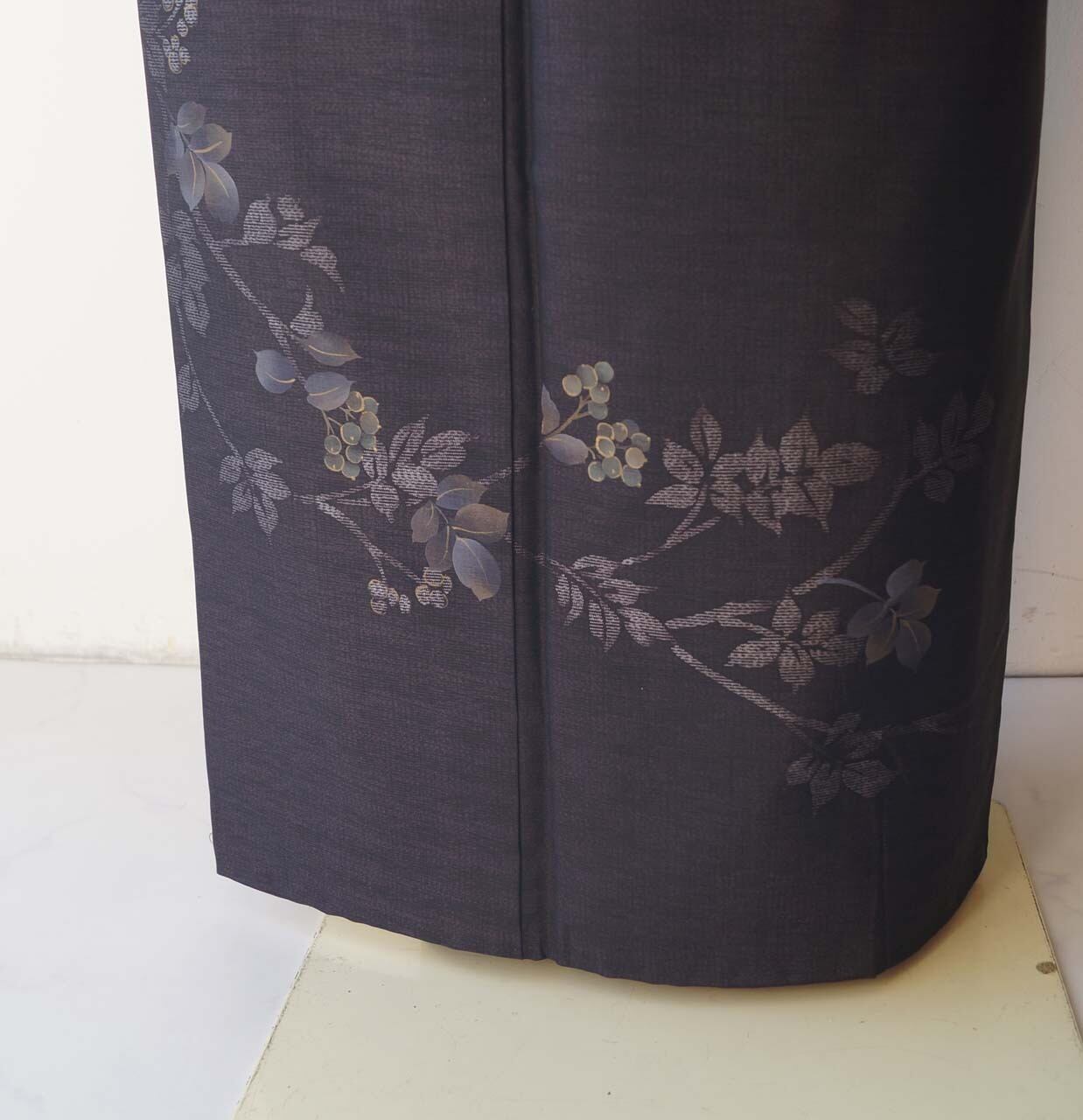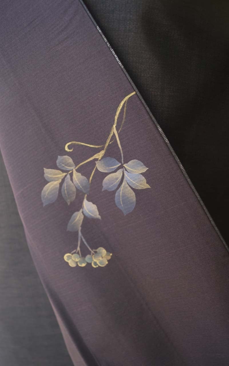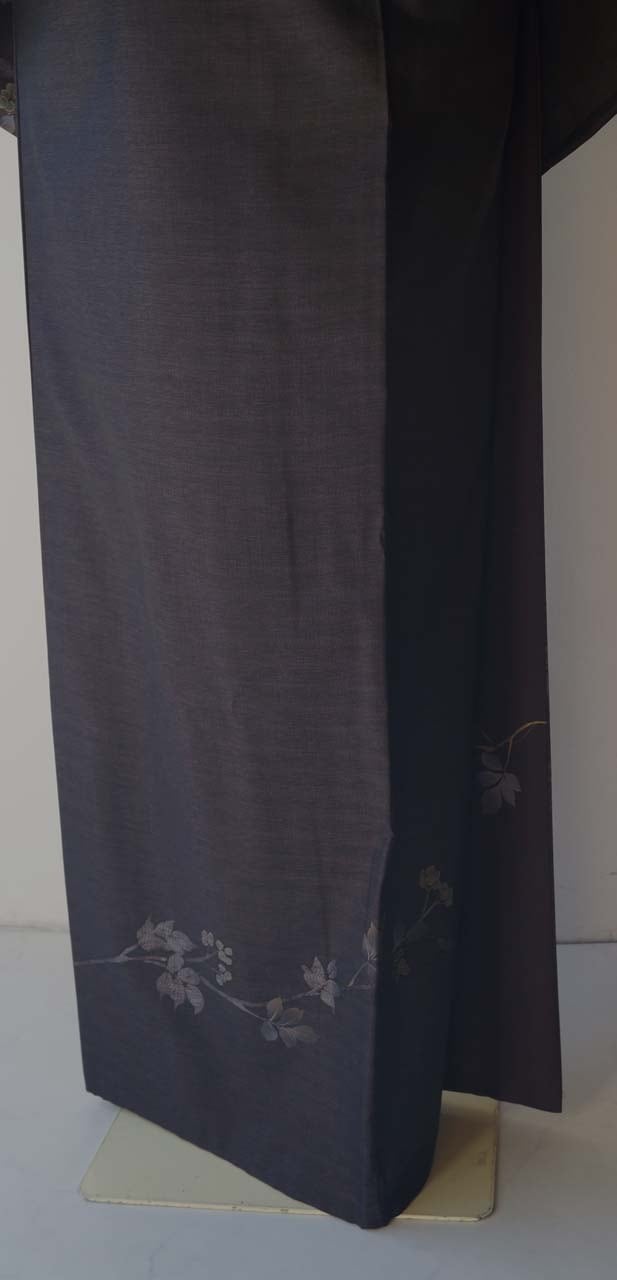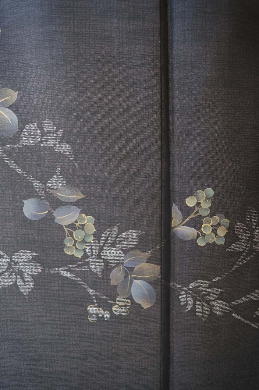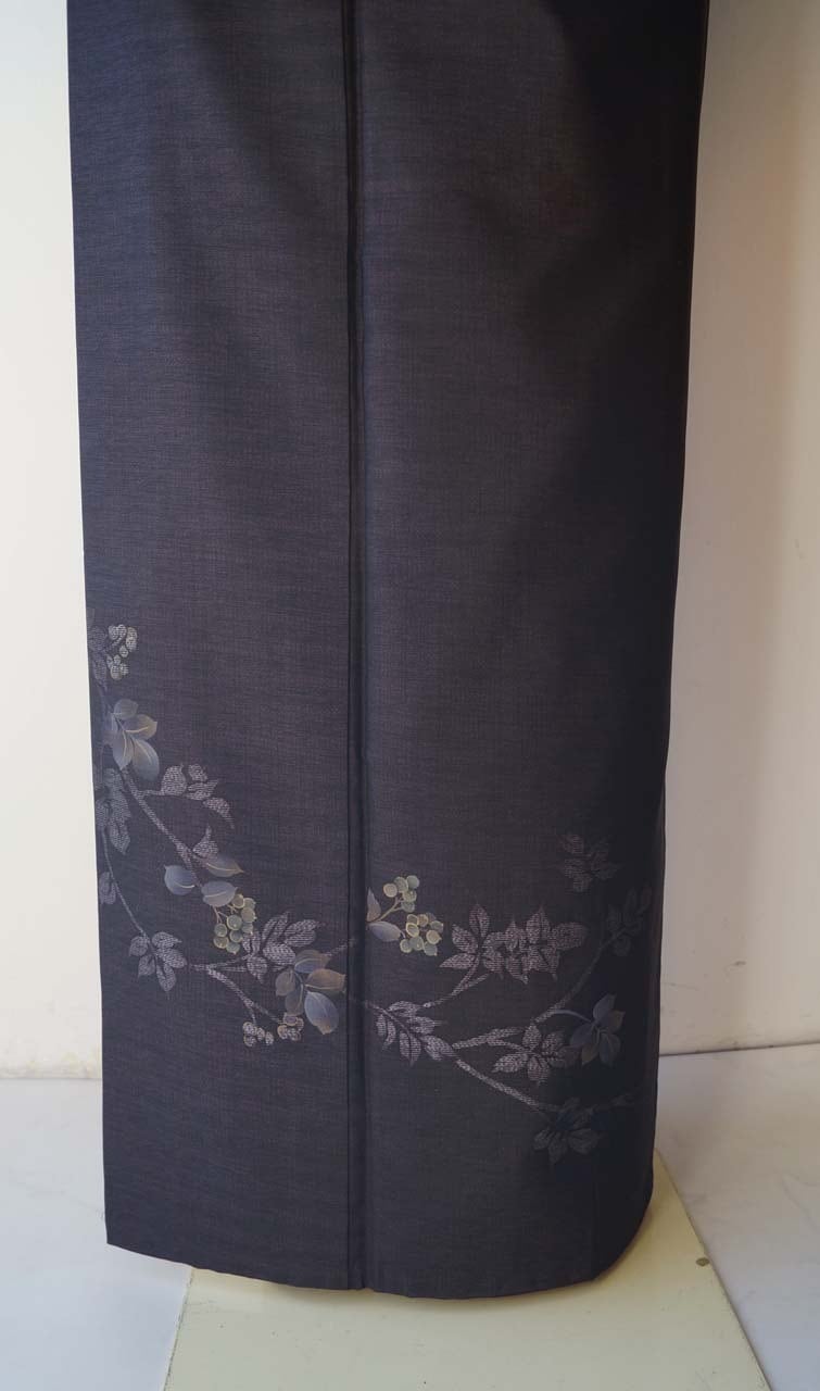 【袷】黒紅色地 植物文 紬付下げ