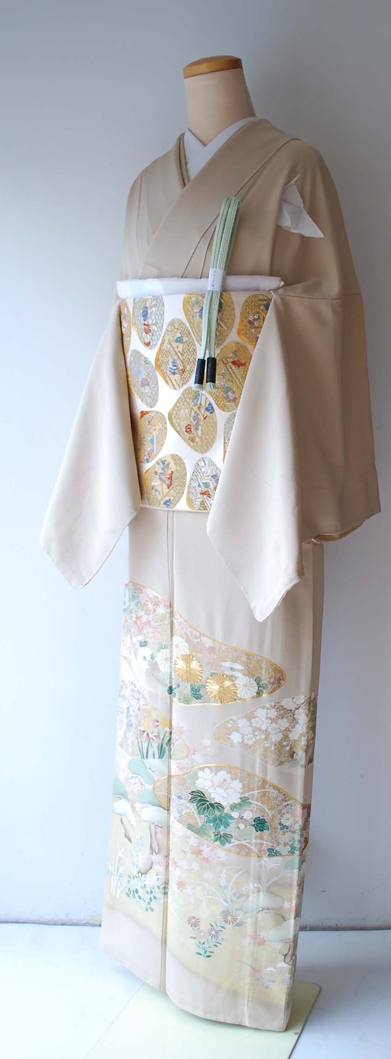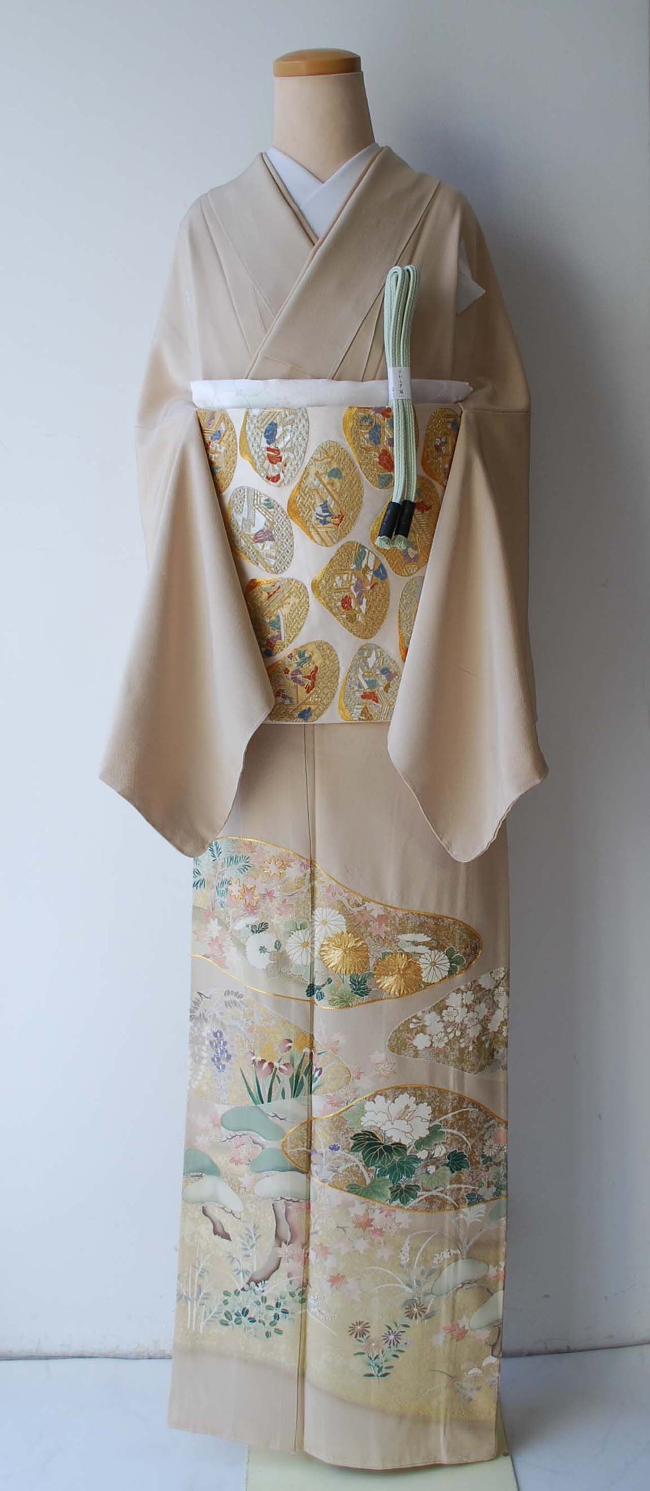 【袷】薄卵色 四季花文 五つ紋 色留め袖