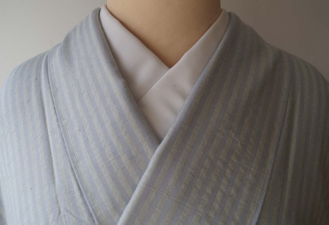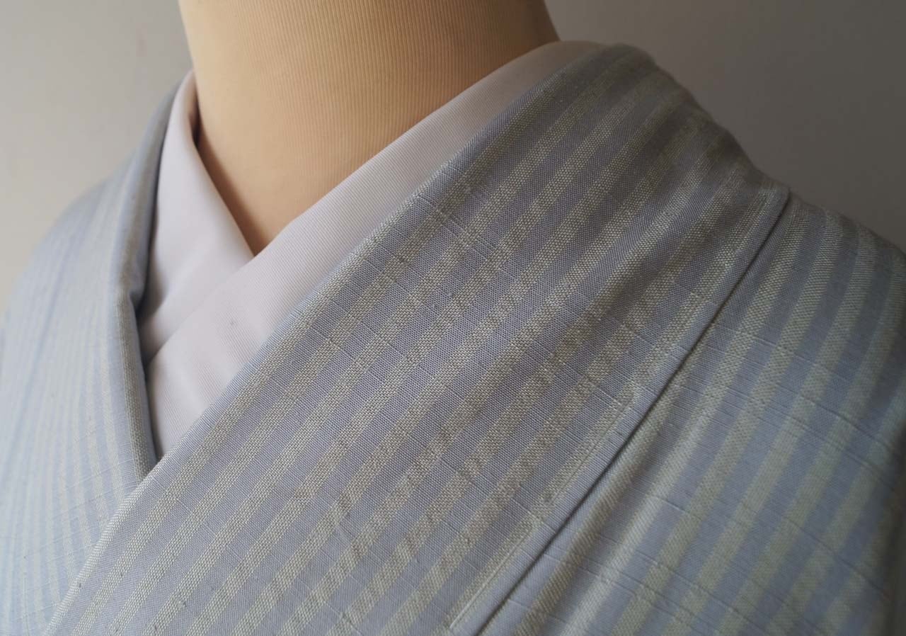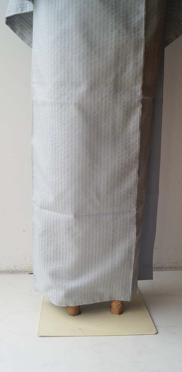 【袷】藤鼠×淡灰黄緑 縦縞文 紬
