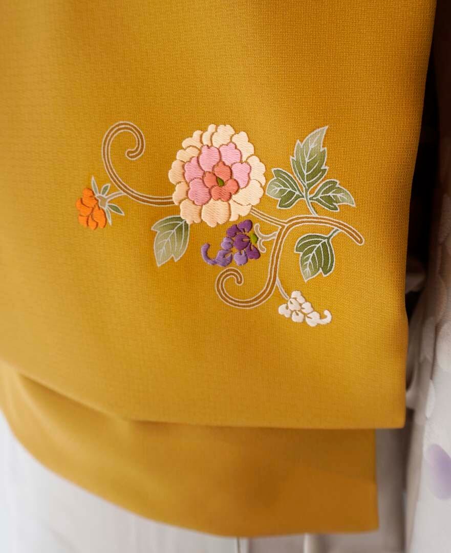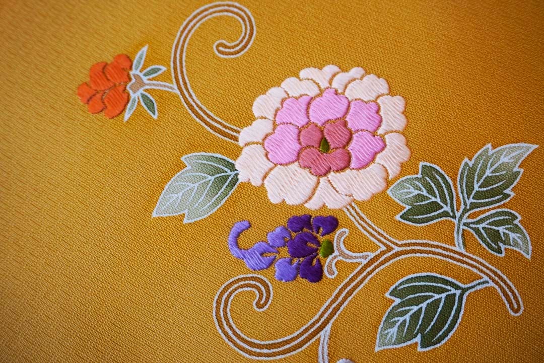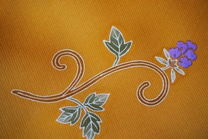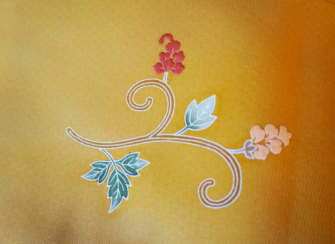刺繍による花々が立体的に浮かび上がります。